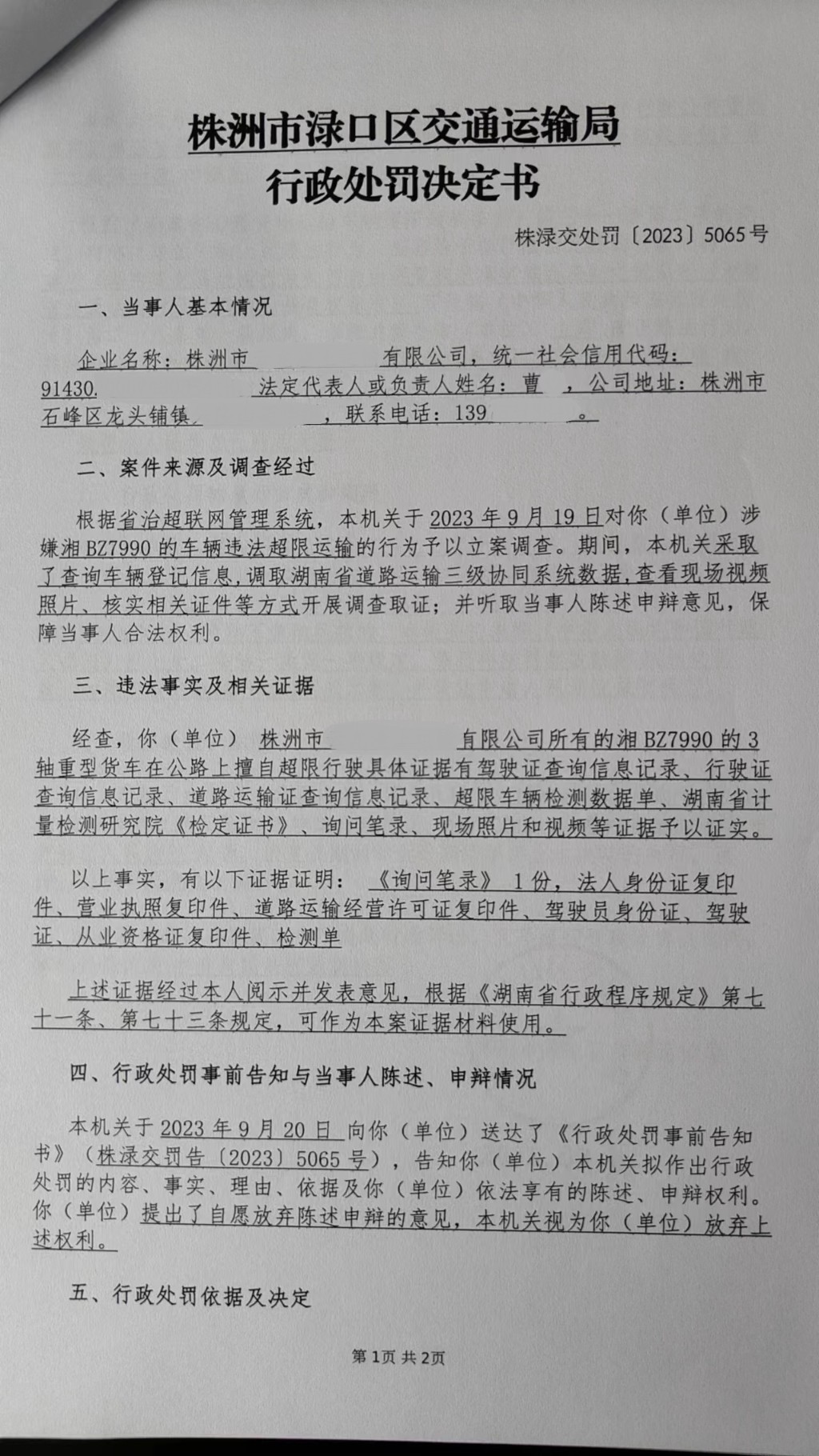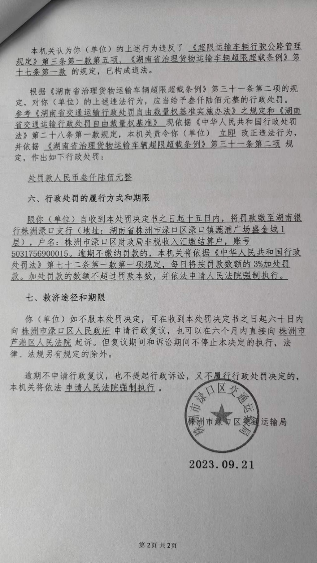 株洲市渌口区交通运输局行政处罚决定书株渌交处罚〔2023〕5065号