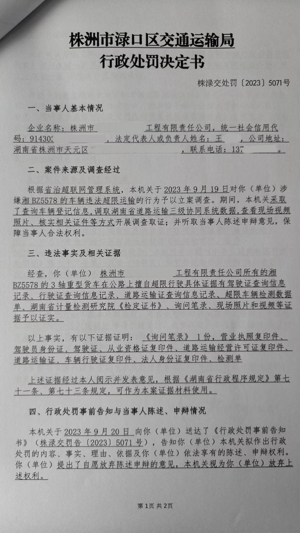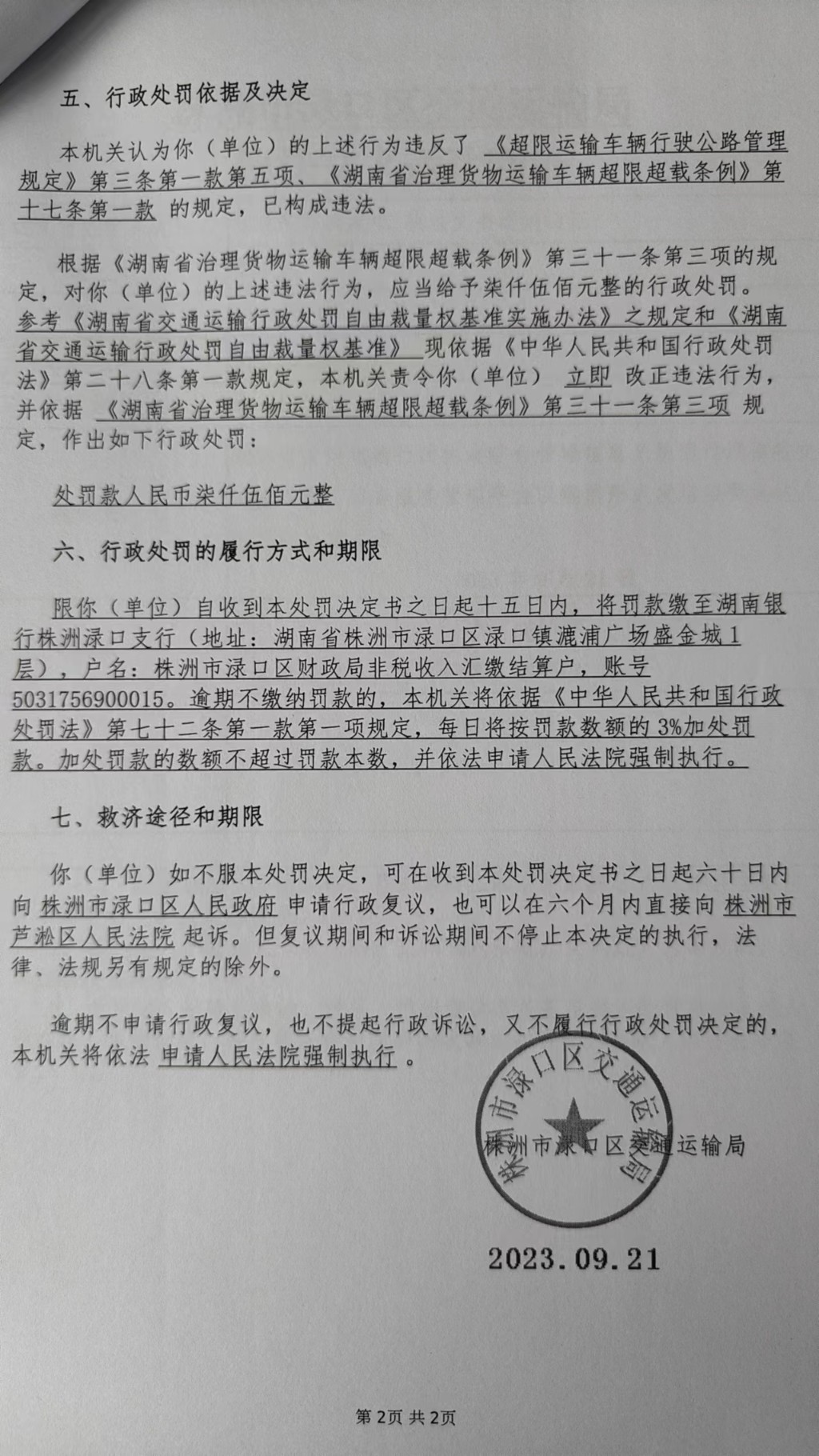 株洲市渌口区交通运输局行政处罚决定书株渌交处罚〔2023〕5071号