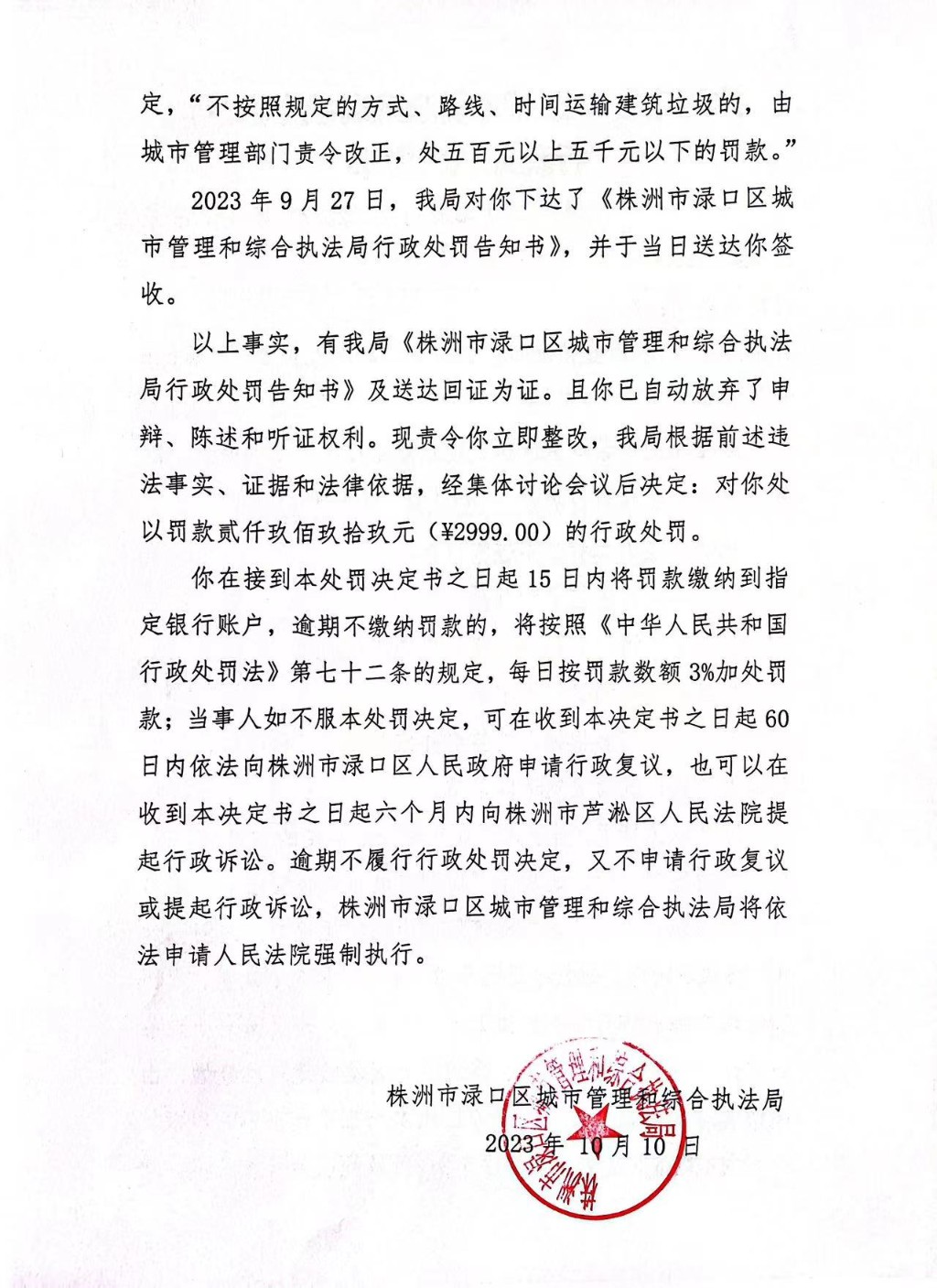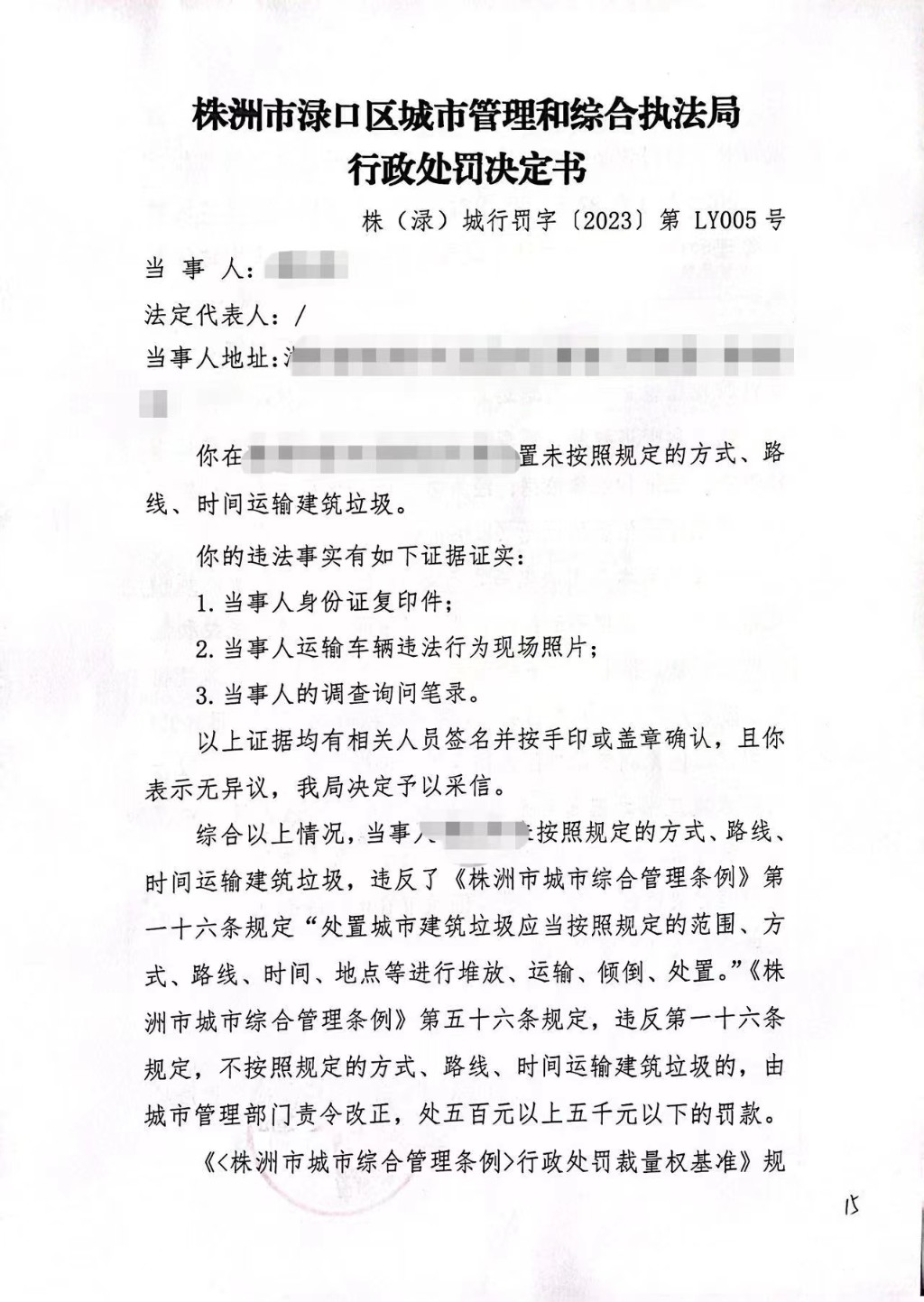 株洲市渌口区城市管理和综合执法局行政处罚决定书 株(渌)城行罚字〔2023〕第LY005号