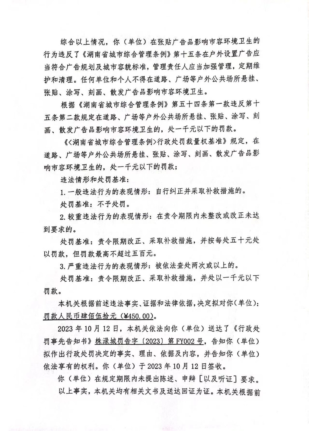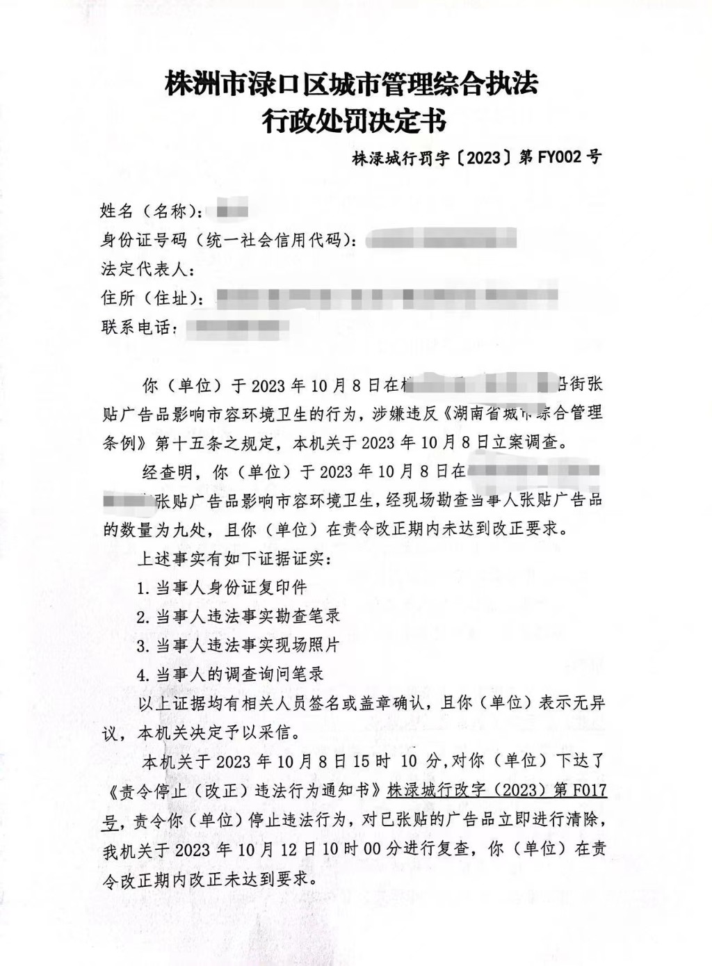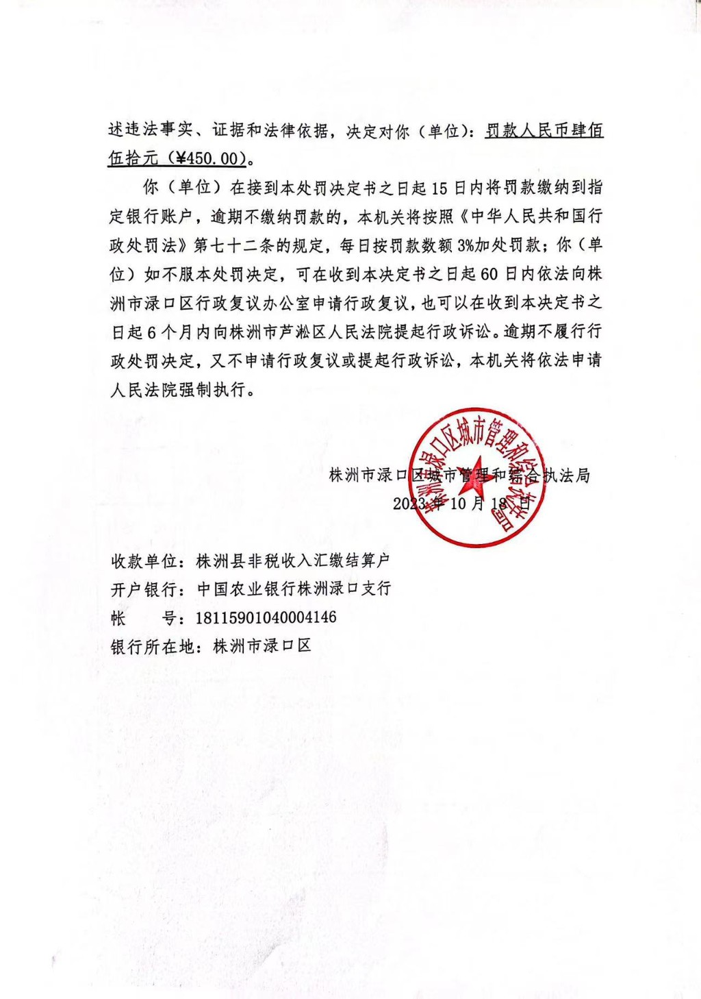 株洲市渌口区城市管理和综合执法局行政处罚决定书 株(渌)城行罚字〔2023〕第FY002号