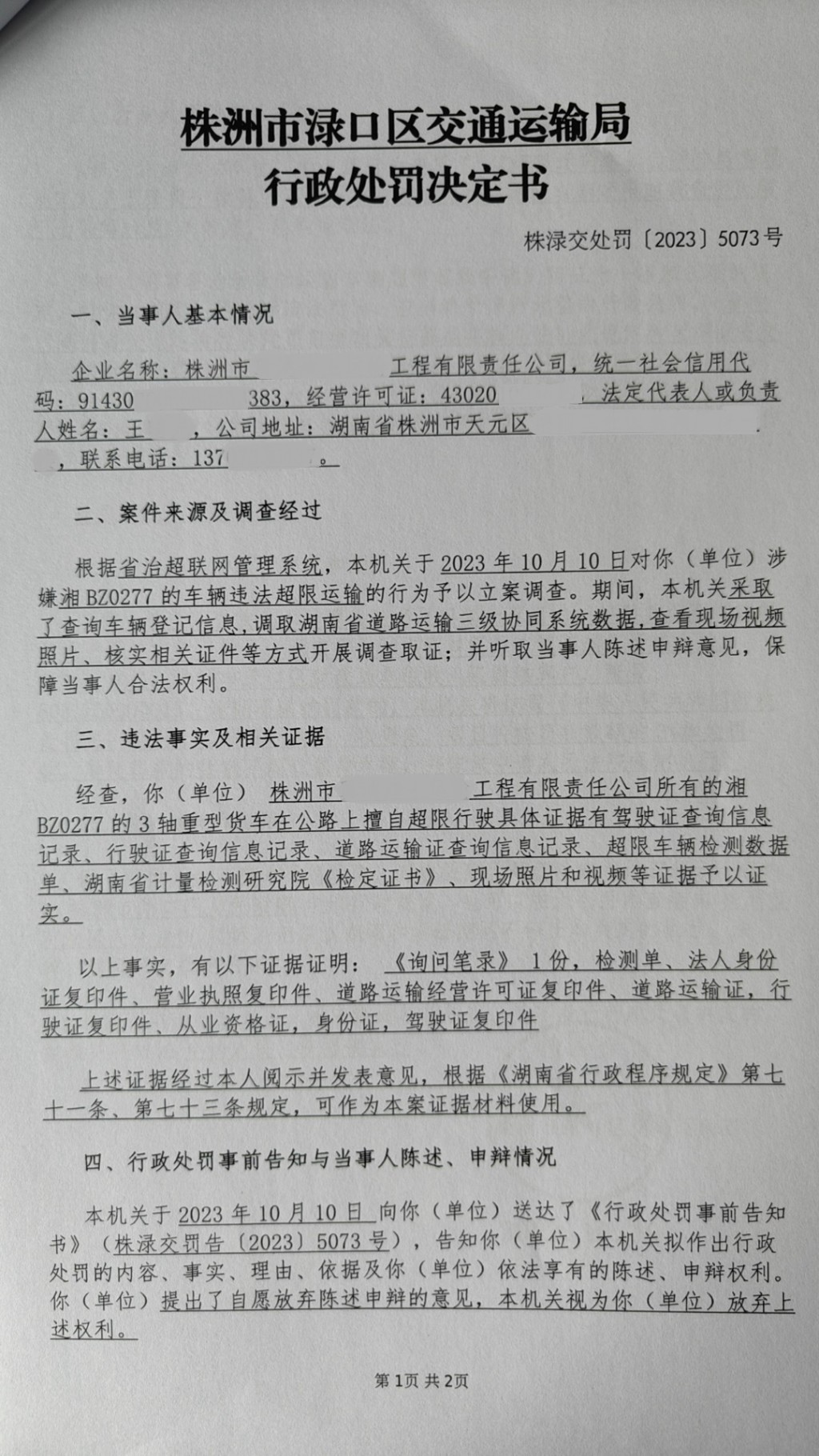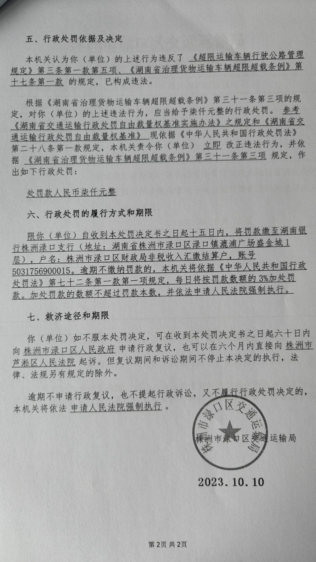 株洲市渌口区交通运输局行政处罚决定书株渌交处罚〔2023〕5073号
