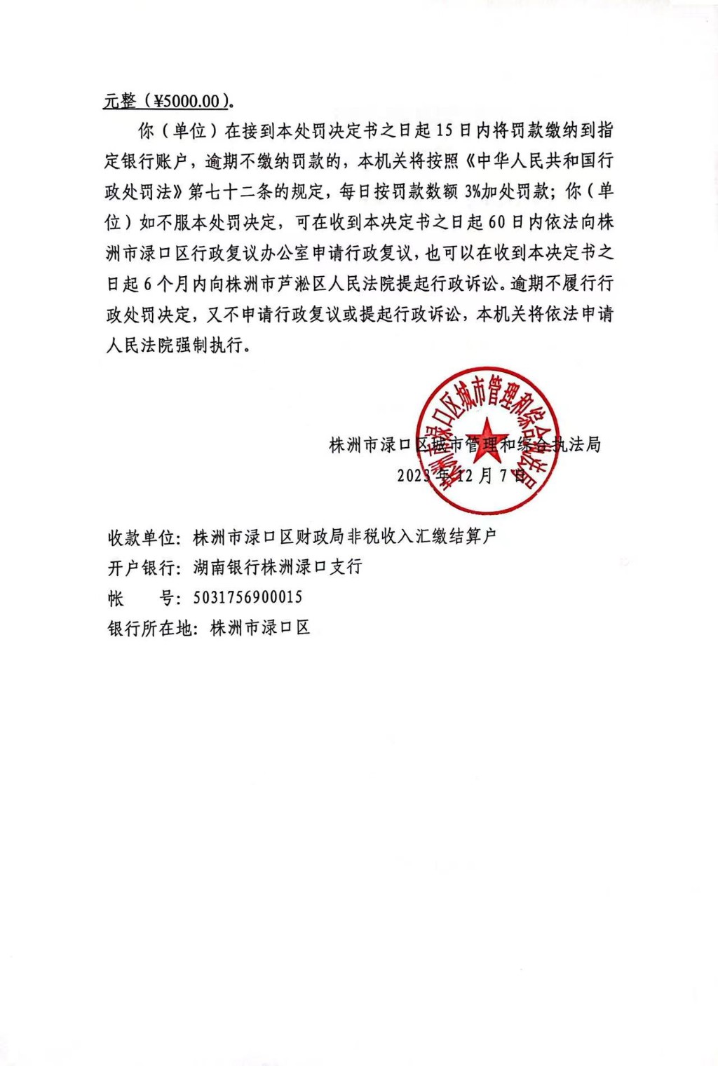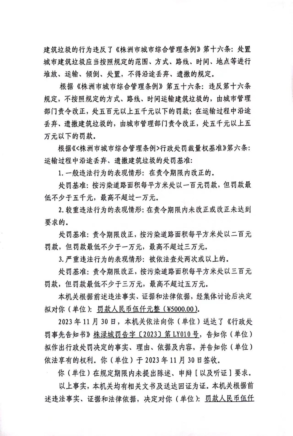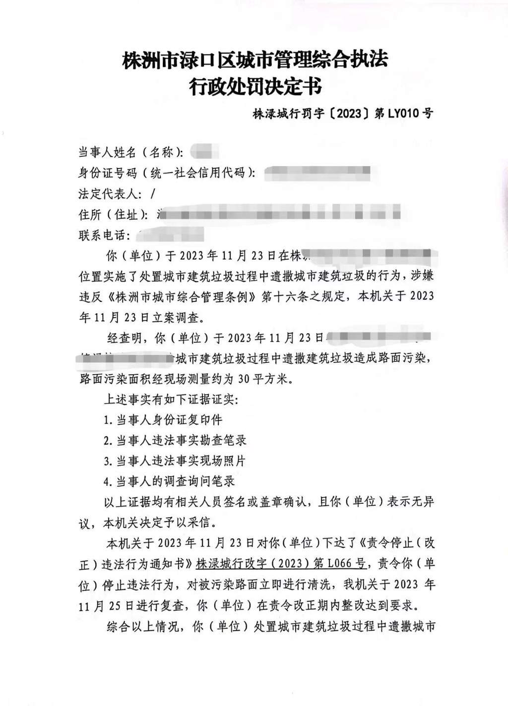 株洲市渌口区城市管理和综合执法局行政处罚决定书 株(渌)城行罚字〔2023〕第LY010号