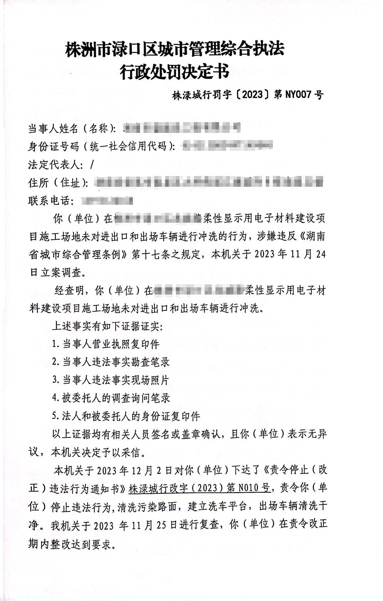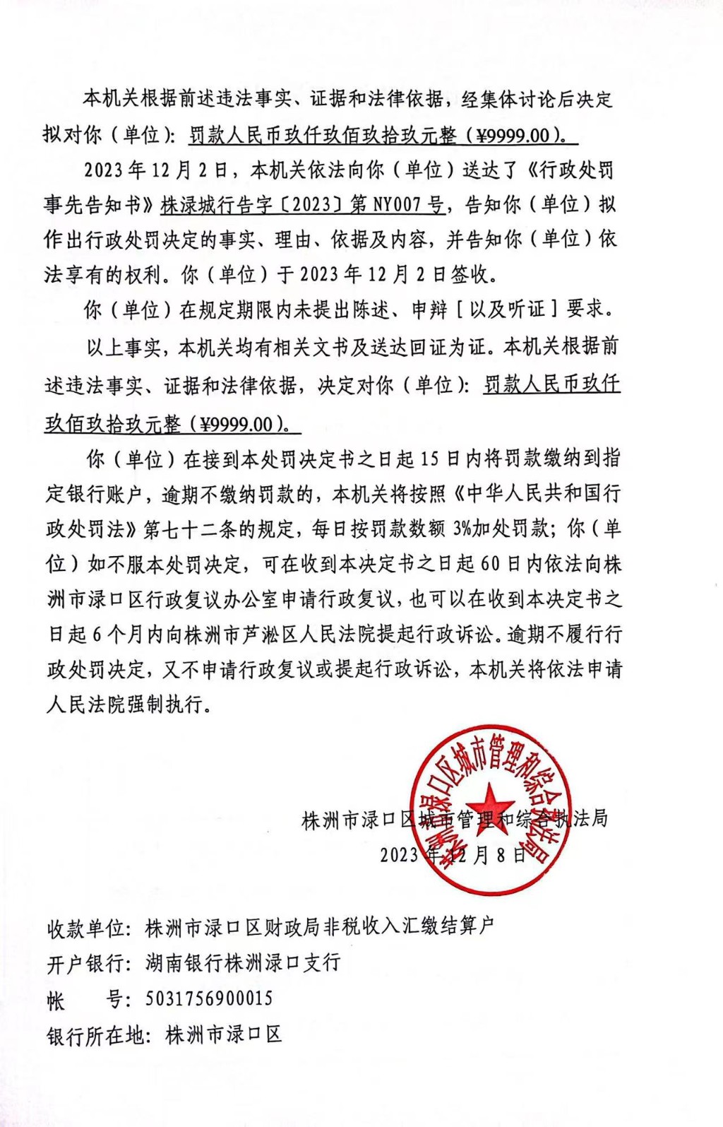 株洲市渌口区城市管理和综合执法局行政处罚决定书 株(渌)城行罚字〔2023〕第NY007号