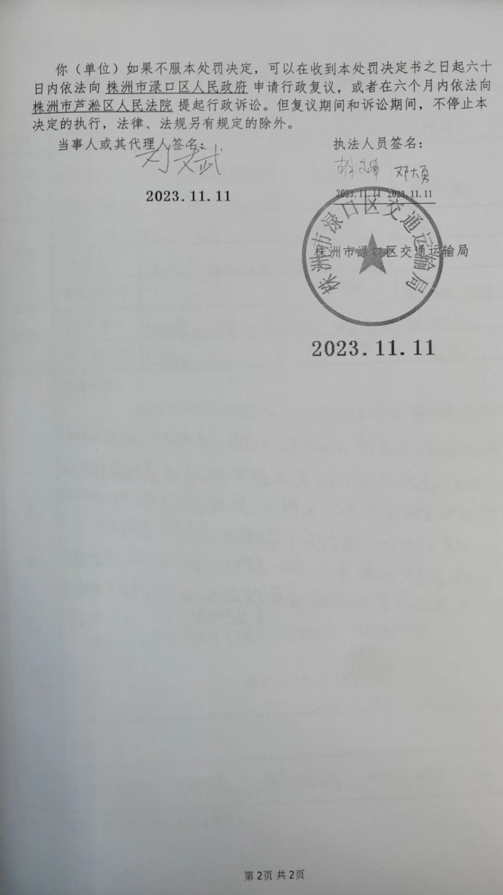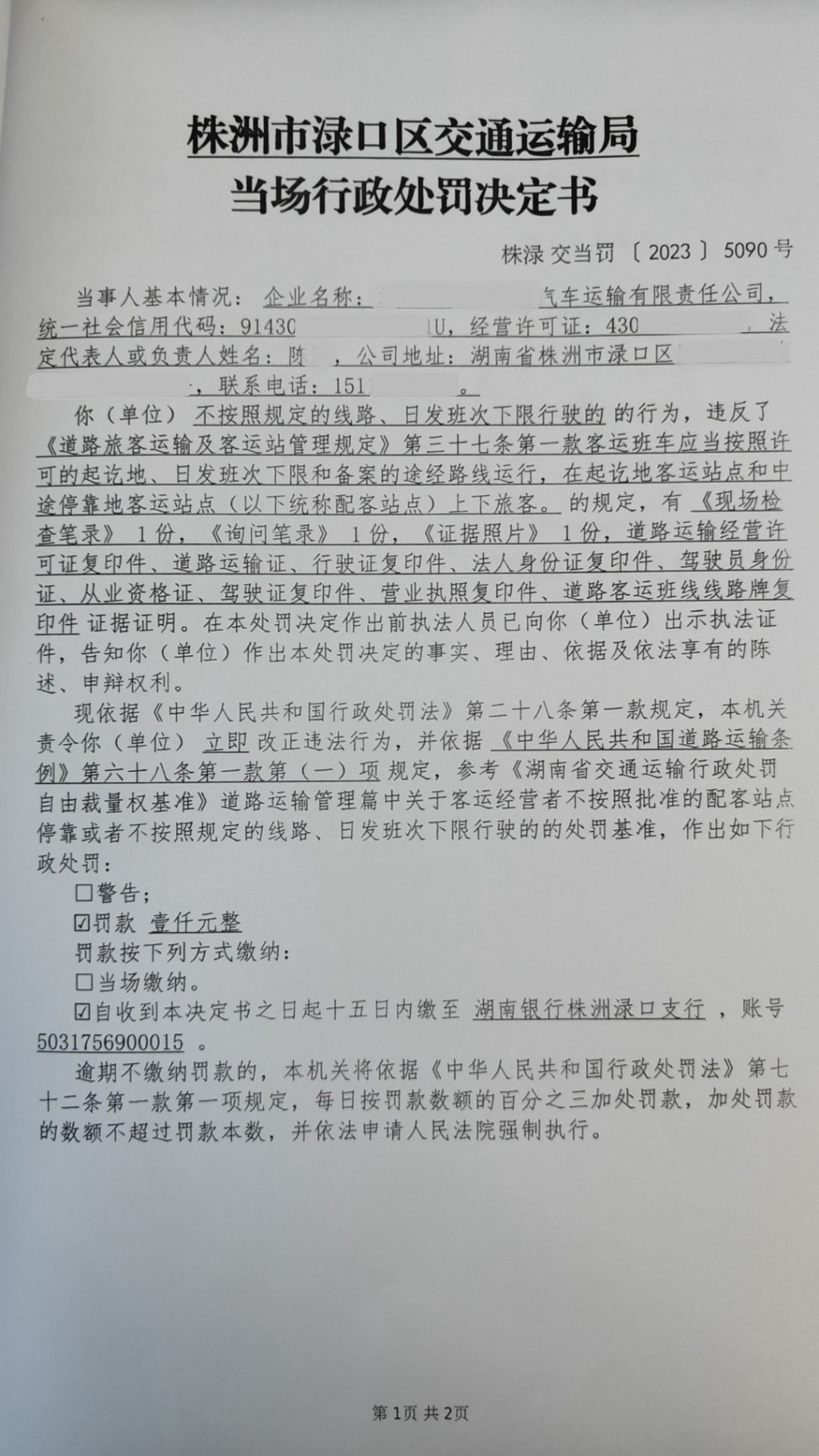 株洲市渌口区交通运输局行政处罚决定书株渌交处罚〔2023〕5090号