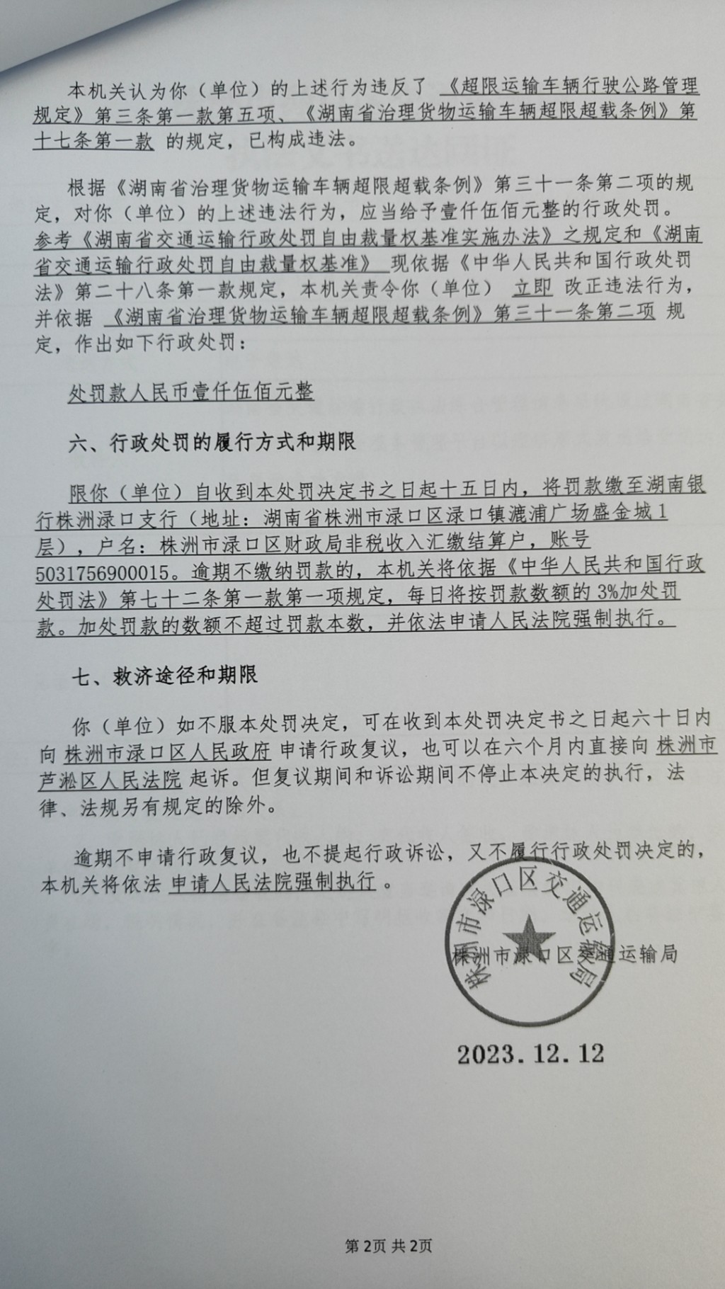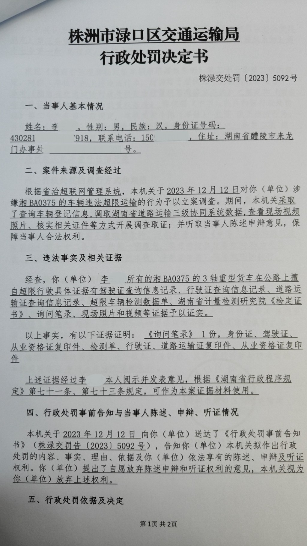 株洲市渌口区交通运输局行政处罚决定书株渌交处罚〔2023〕5092号