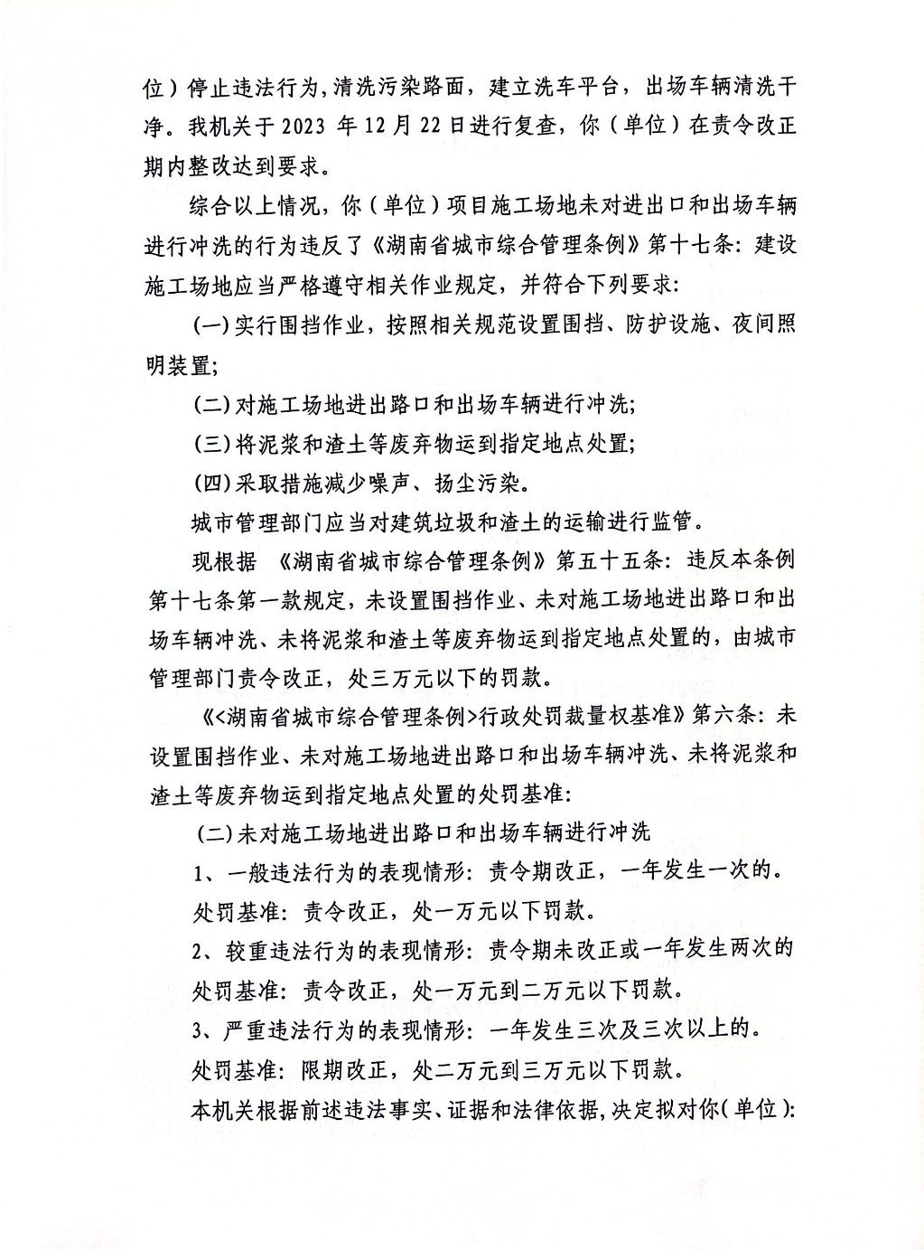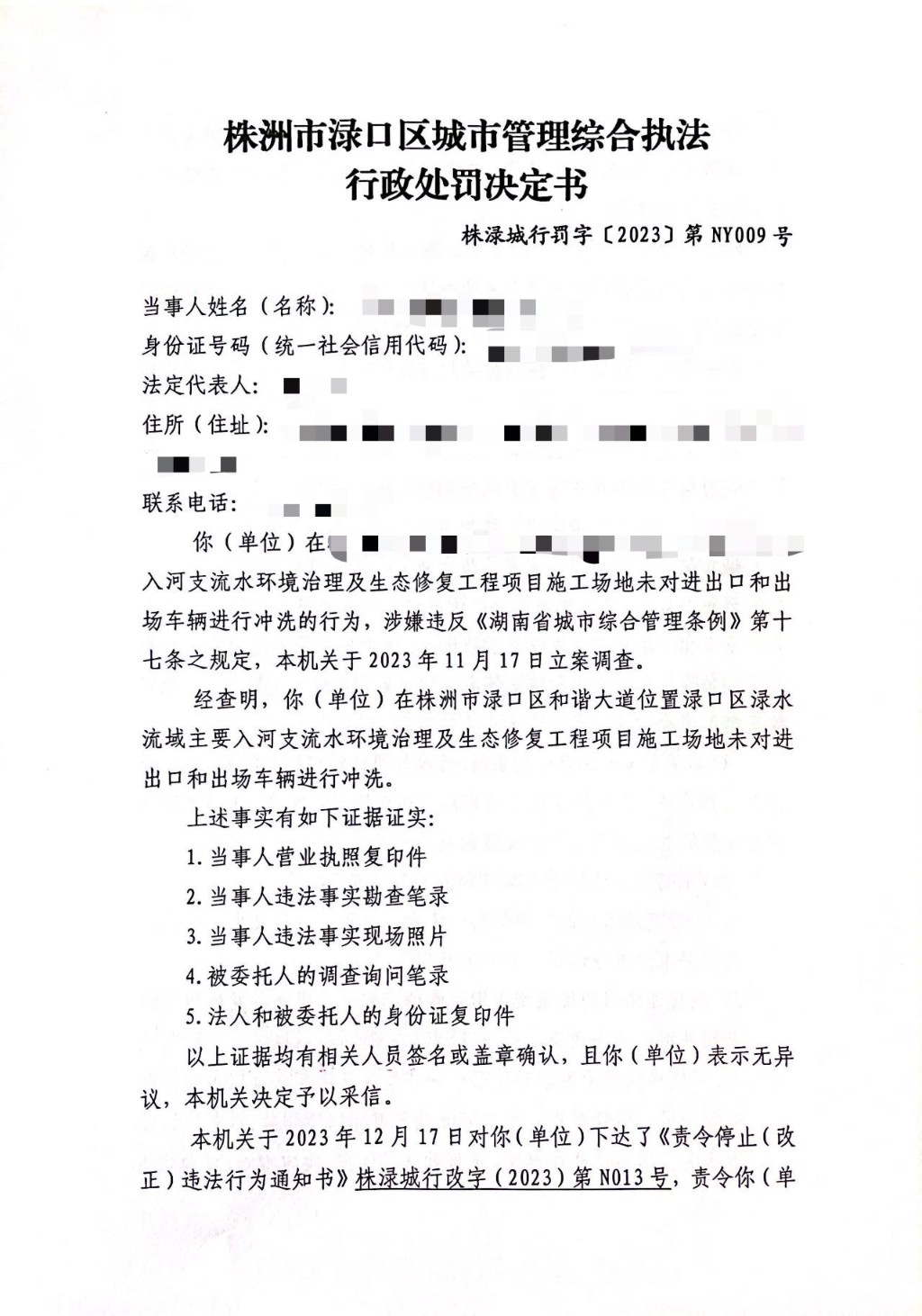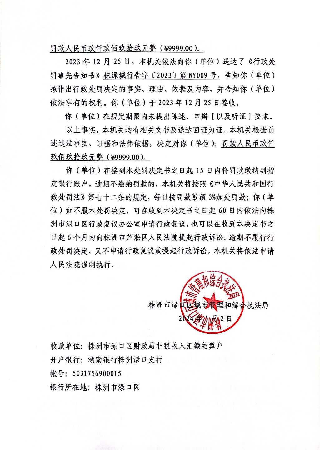 株洲市渌口区城市管理和综合执法局行政处罚决定书 株(渌)城行罚字〔2023〕第NY009号