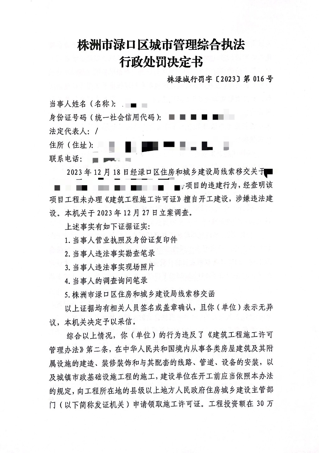 株洲市渌口区城市管理和综合执法局行政处罚决定书 株(渌)城行罚字〔2023〕第016号