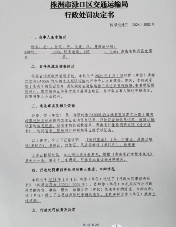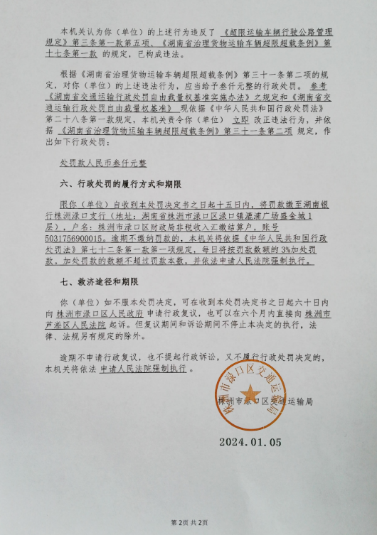 株洲市渌口区交通运输局当场行政处罚决定书株渌交当罚〔2024〕5002号
