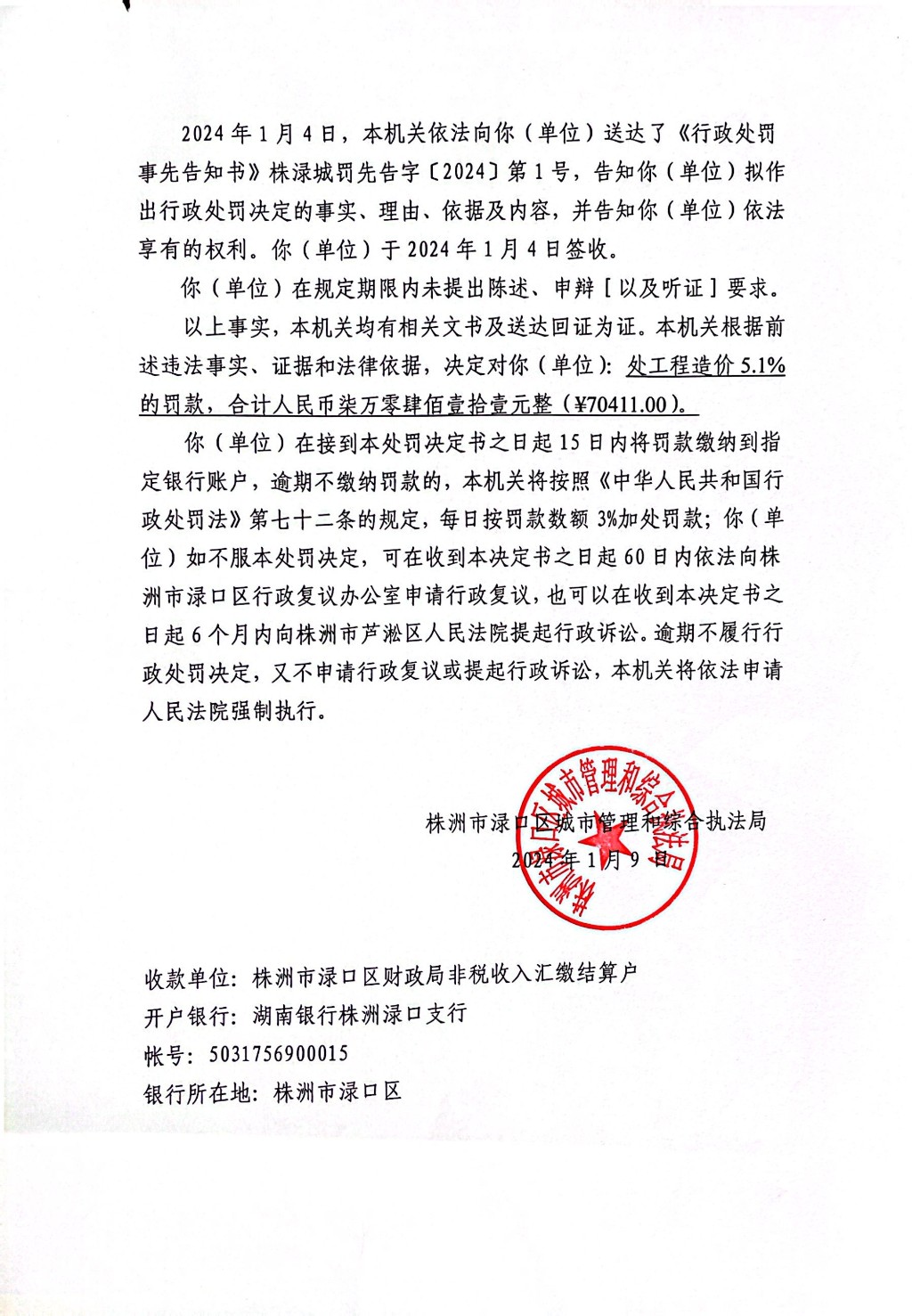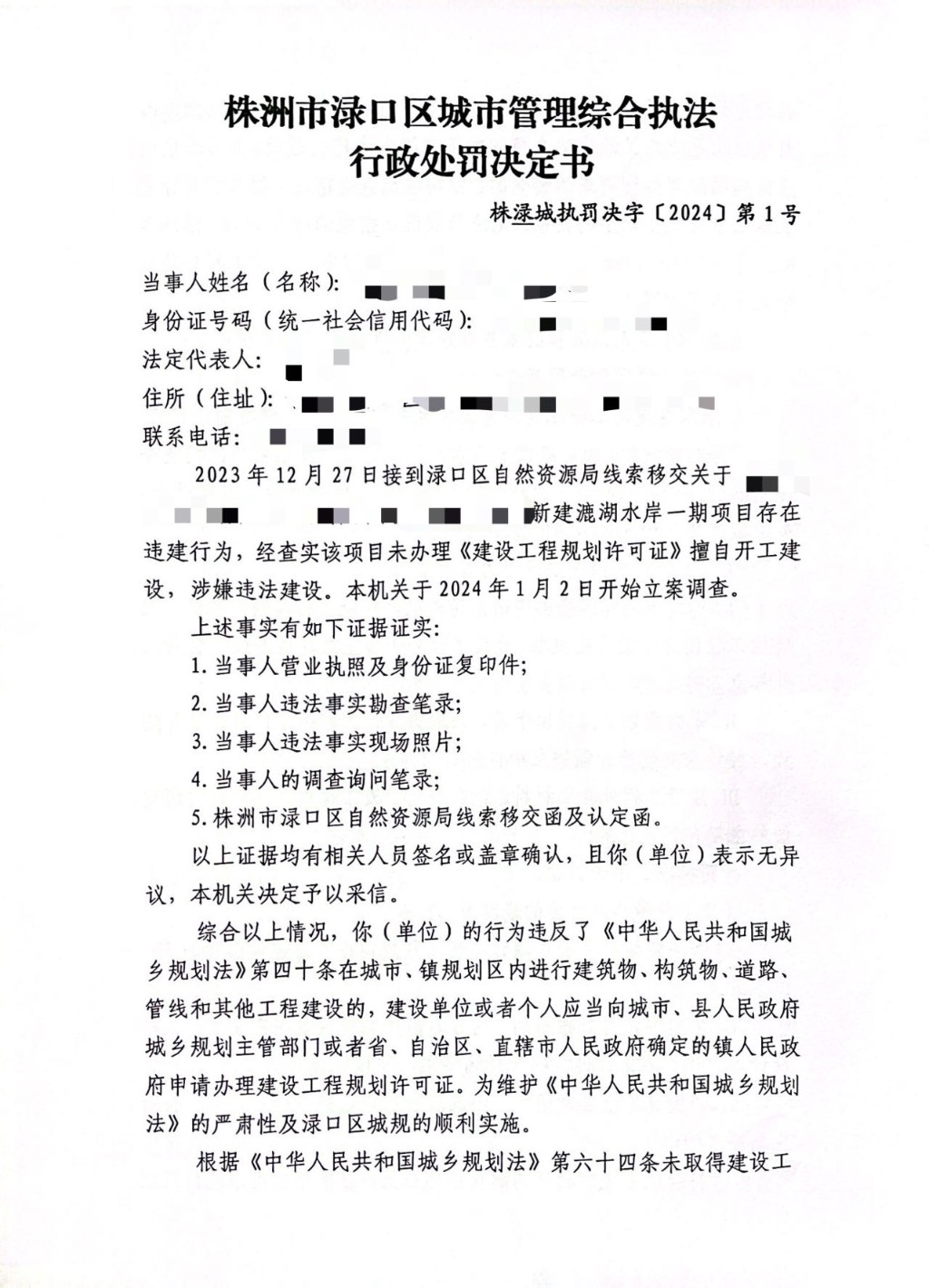 株洲市渌口区城市管理和综合执法局行政处罚决定书 株(渌)城执罚决字〔2024〕第1号