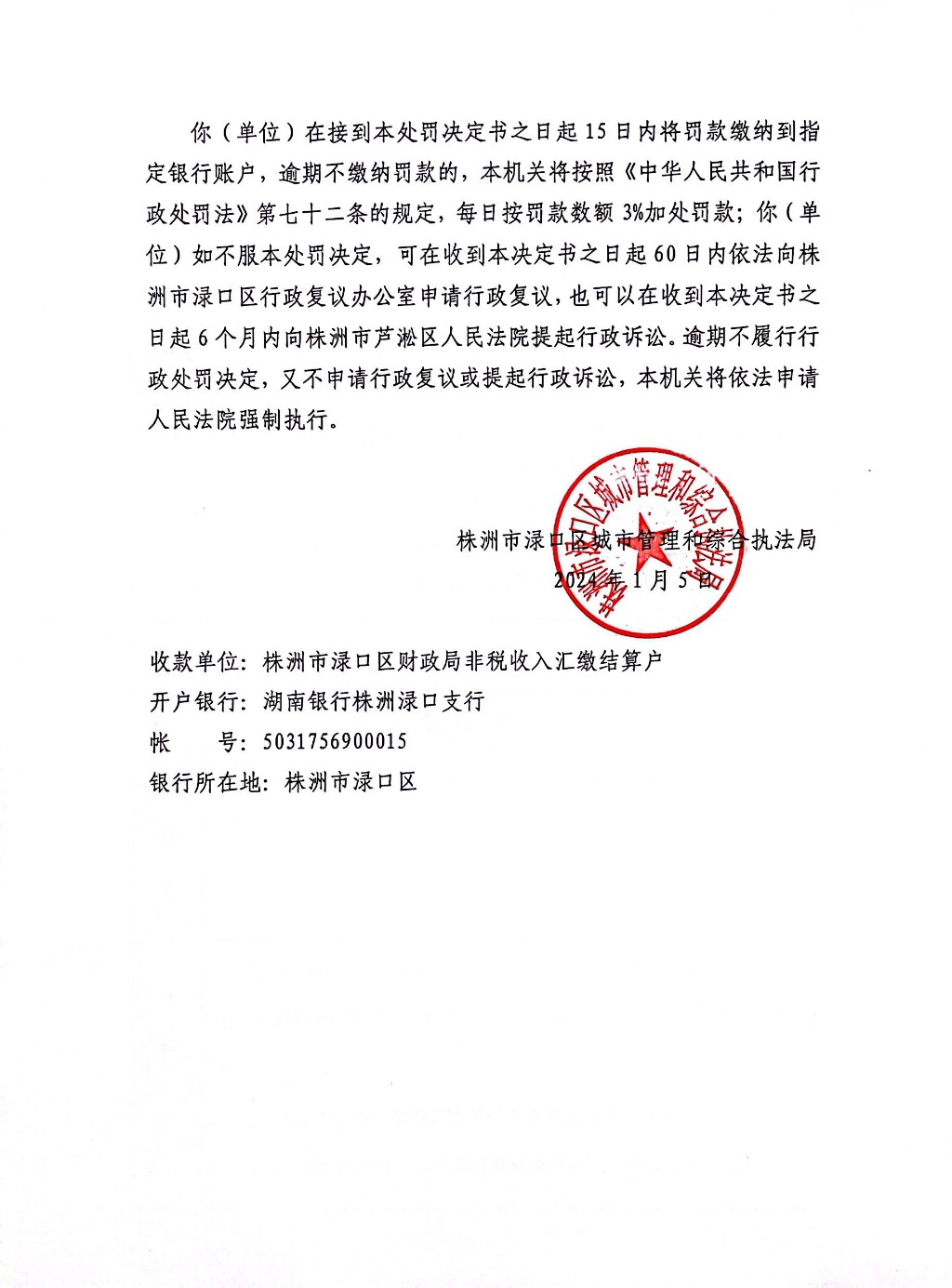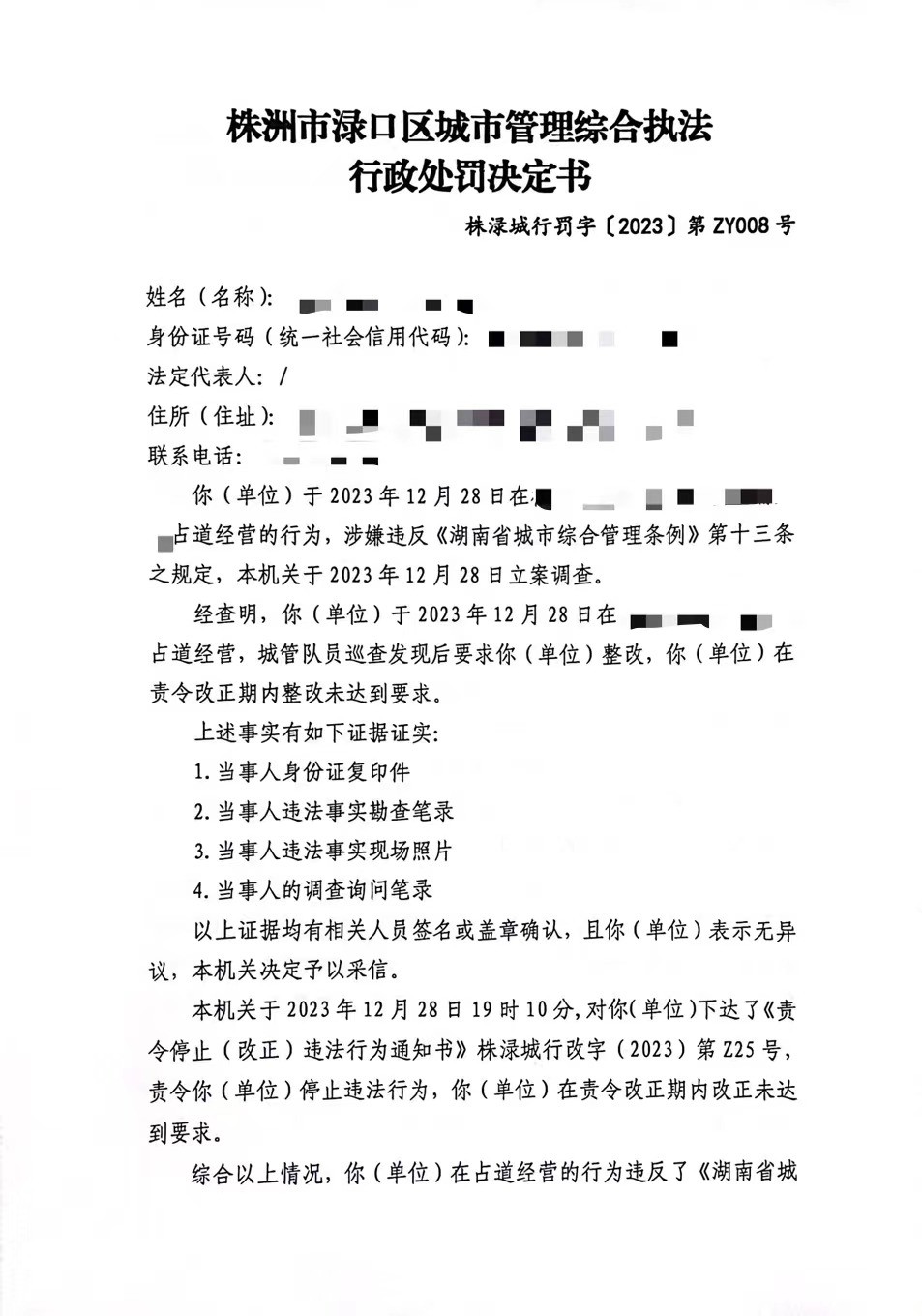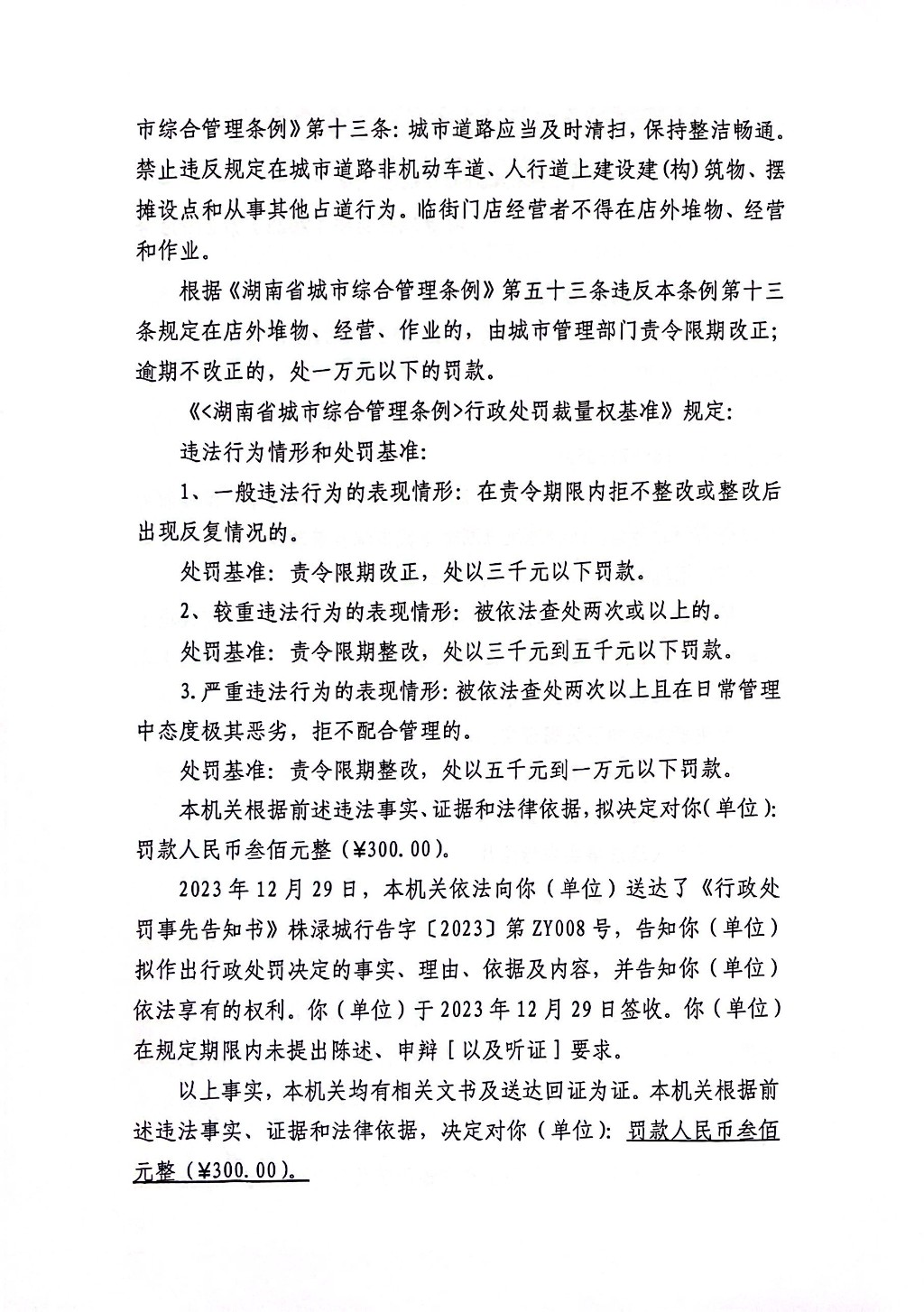 株洲市渌口区城市管理和综合执法局行政处罚决定书 株(渌)城行罚字〔2023〕第ZY008号