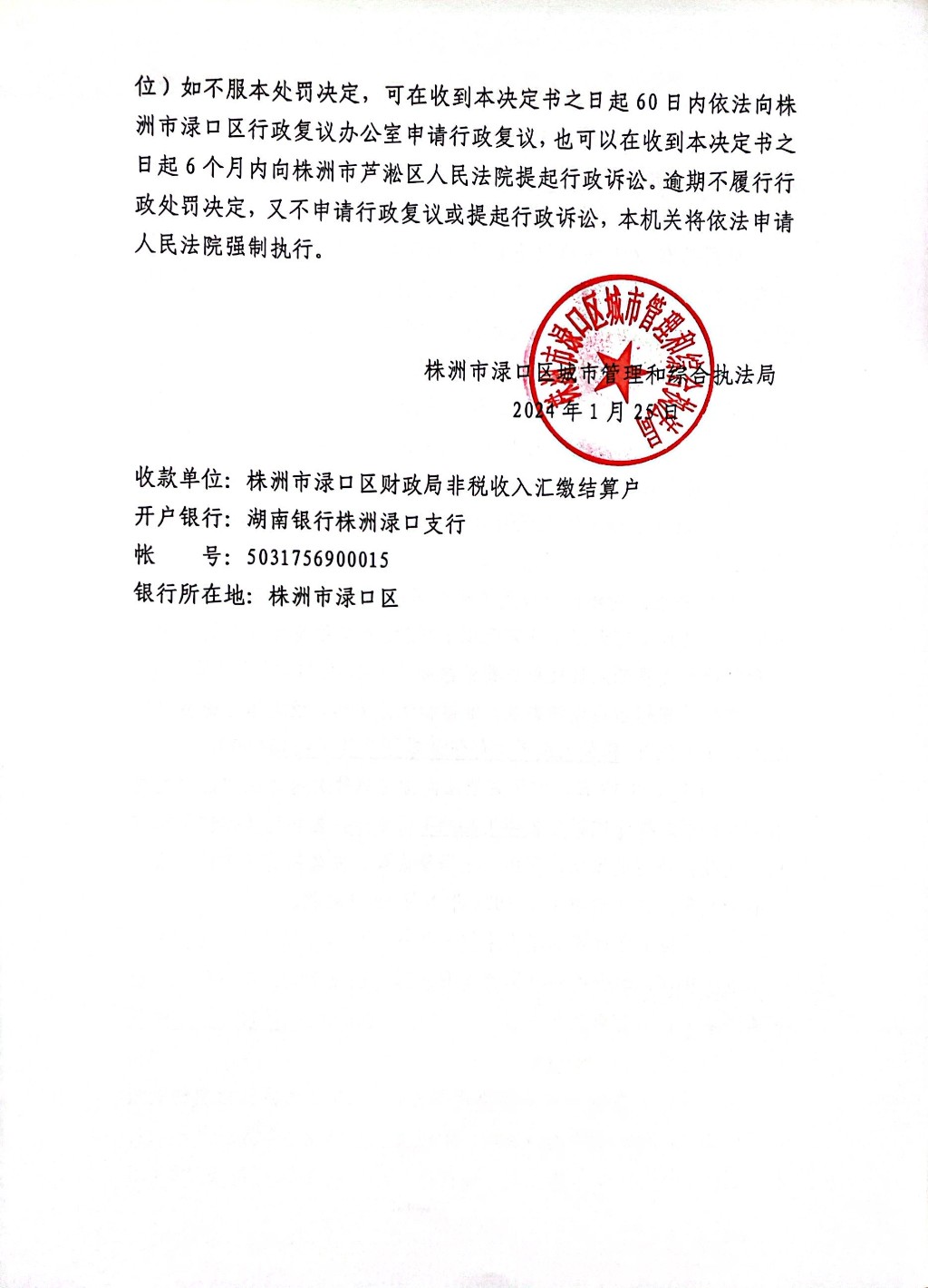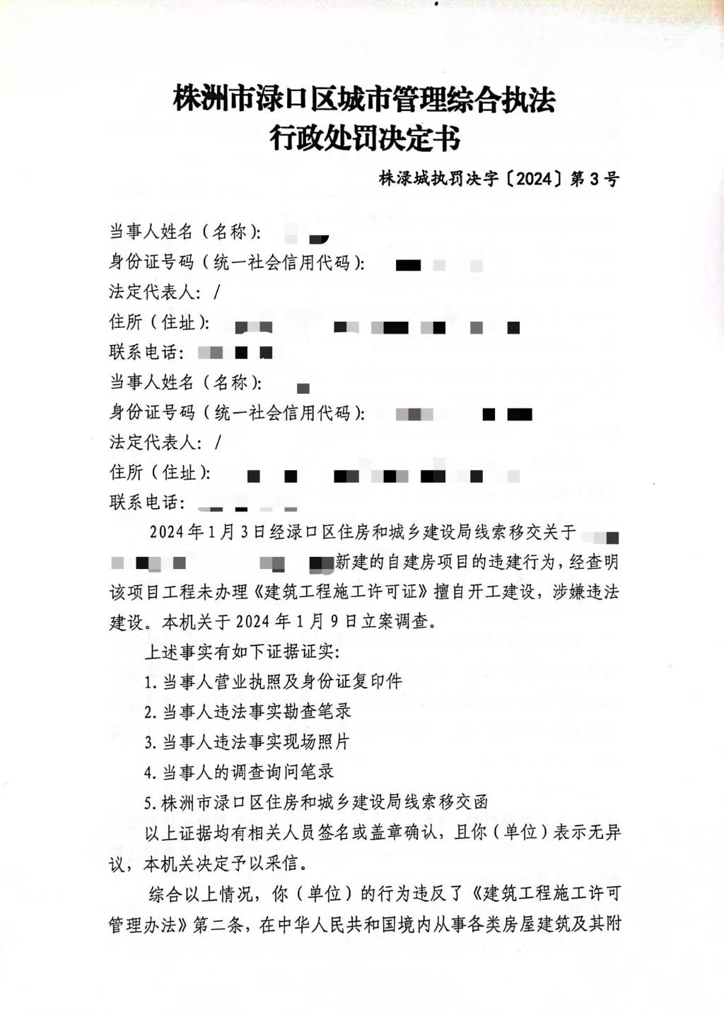 株洲市渌口区城市管理和综合执法局行政处罚决定书 株(渌)城行罚字〔2024〕第3号