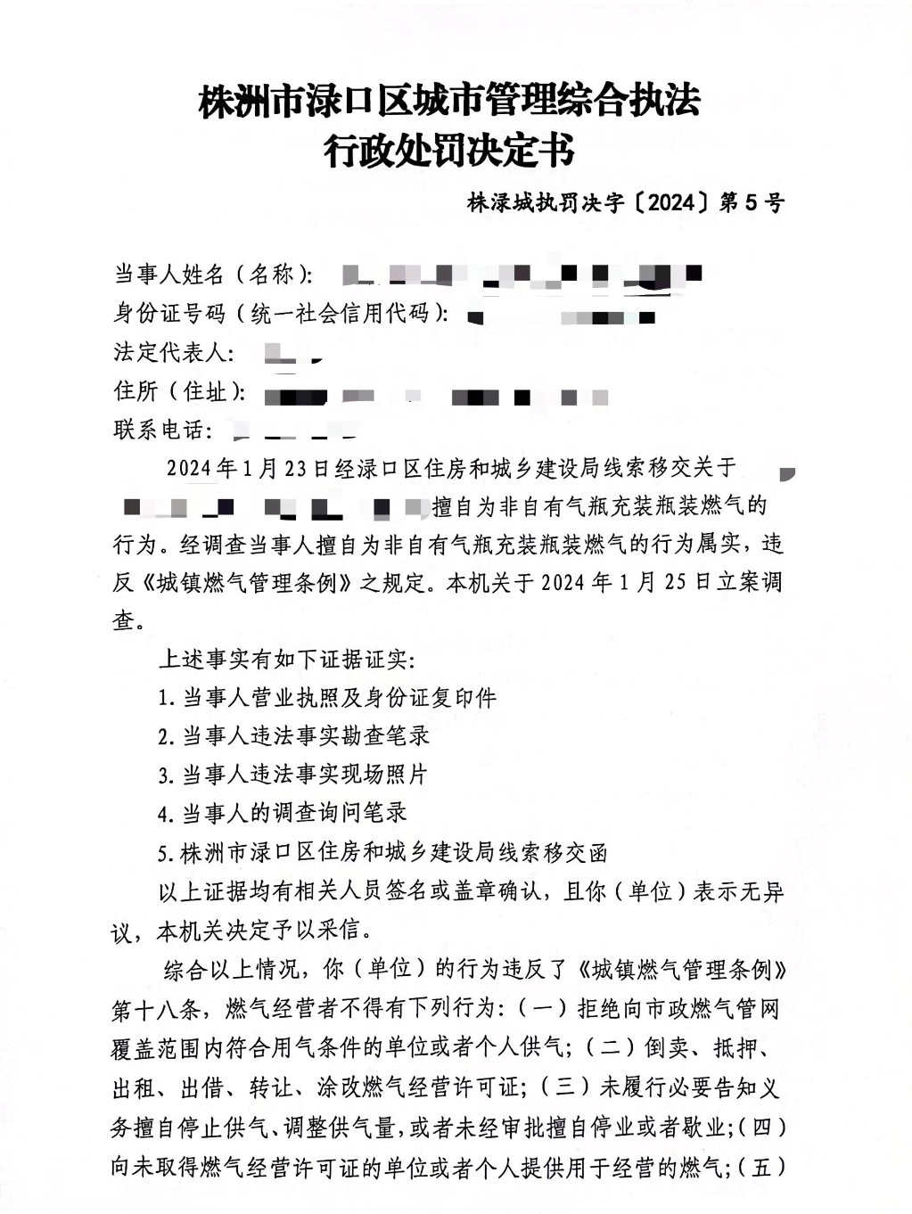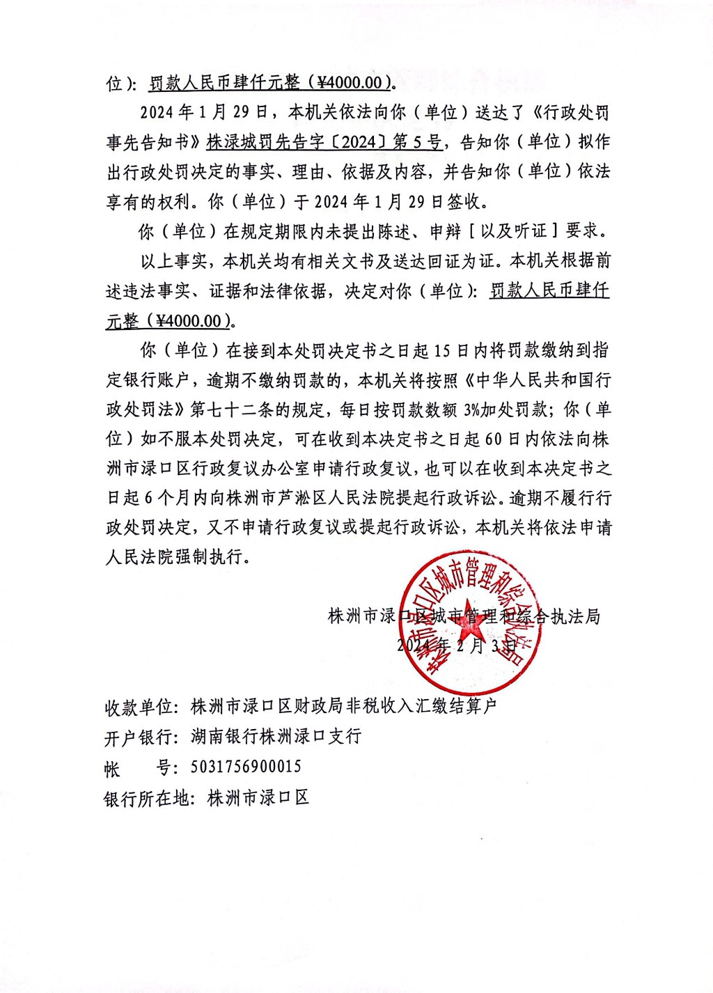 株洲市渌口区城市管理和综合执法局行政处罚决定书 株(渌)城行罚字〔2024〕第5号