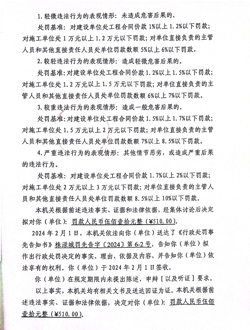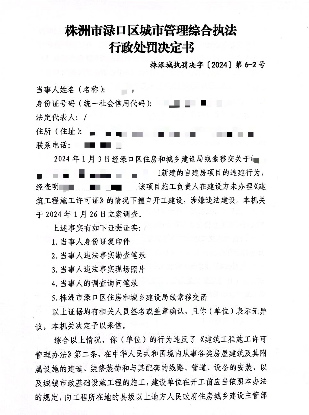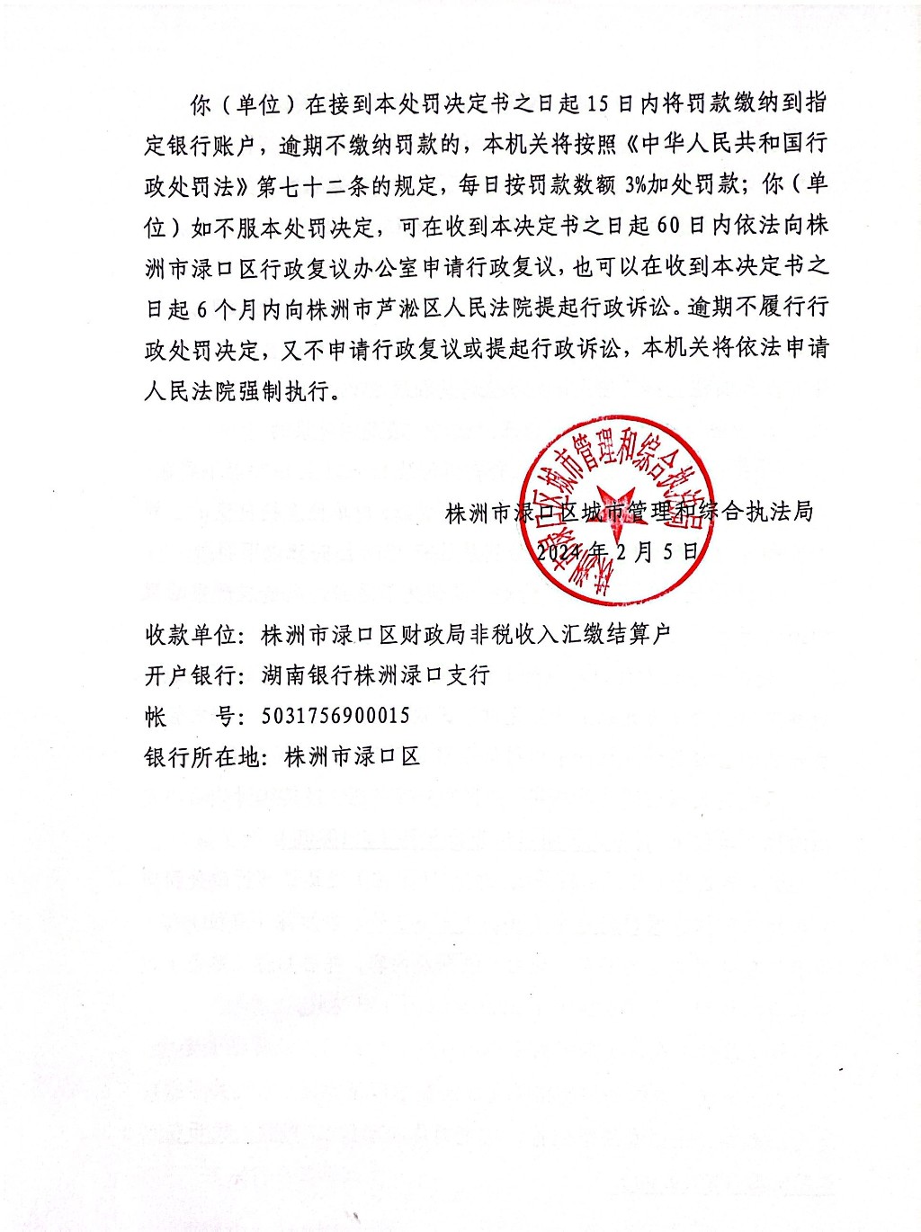 株洲市渌口区城市管理和综合执法局行政处罚决定书 株(渌)城行罚字〔2024〕第6-2号