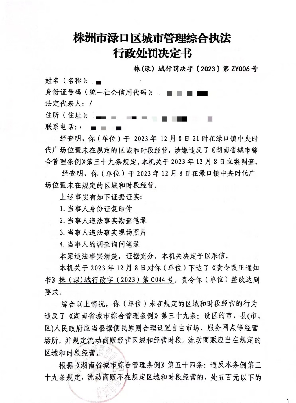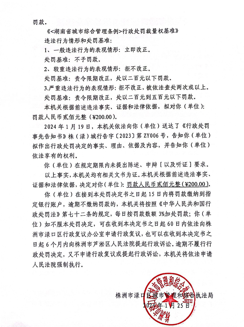株洲市渌口区城市管理和综合执法局行政处罚决定书 株(渌)城行罚字〔2023〕第ZY006号