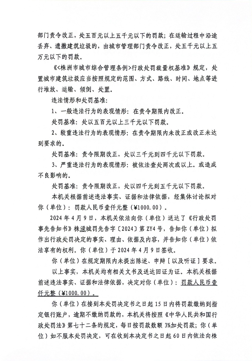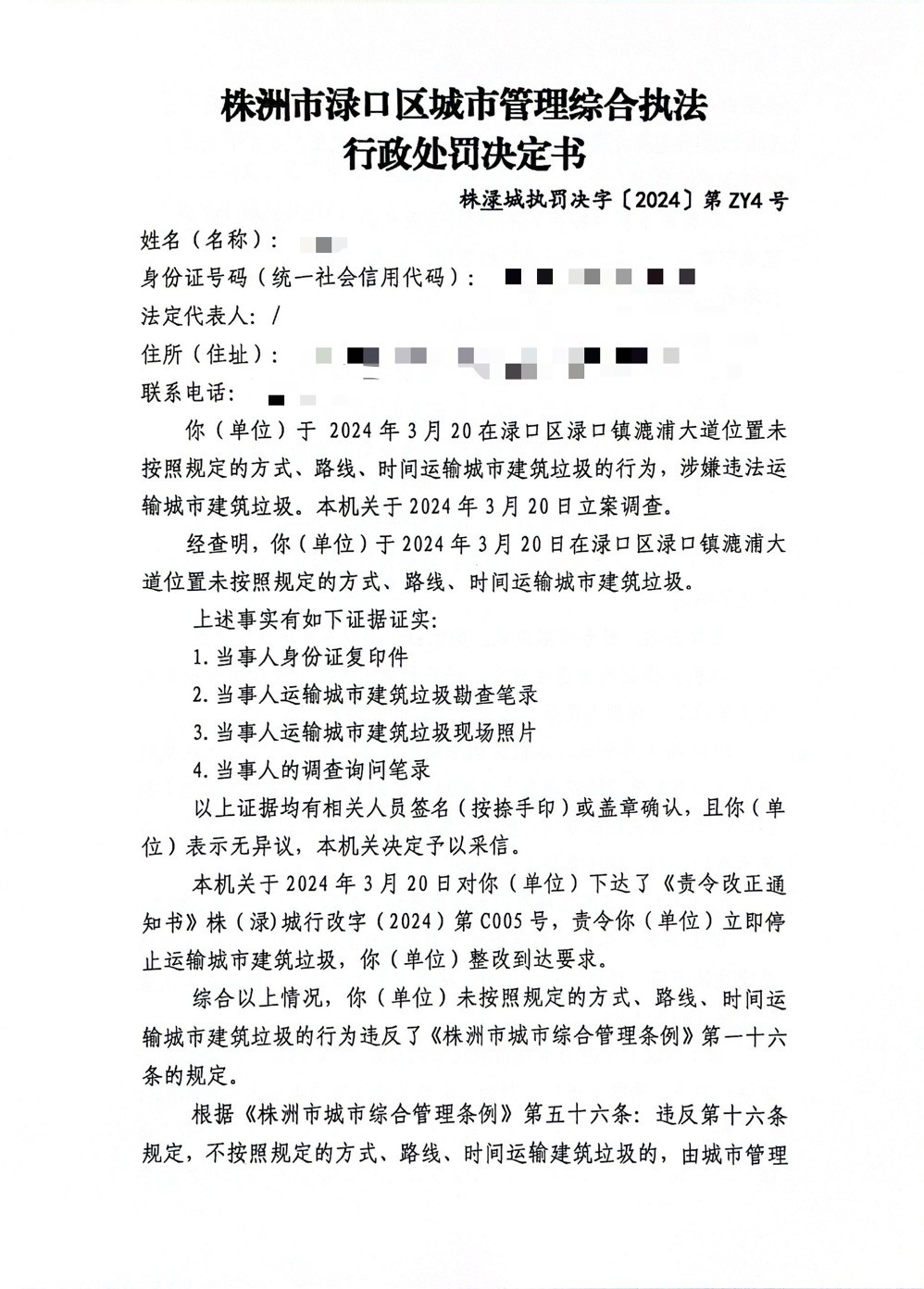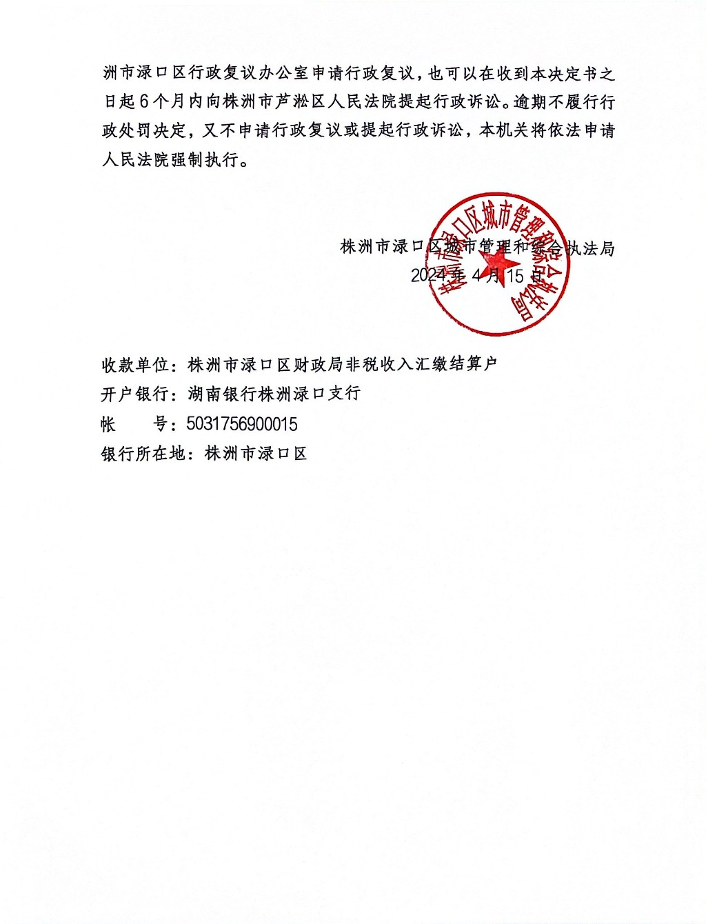 株洲市渌口区城市管理和综合执法局行政处罚决定书 株(渌)城行罚字〔2024〕第ZY4号