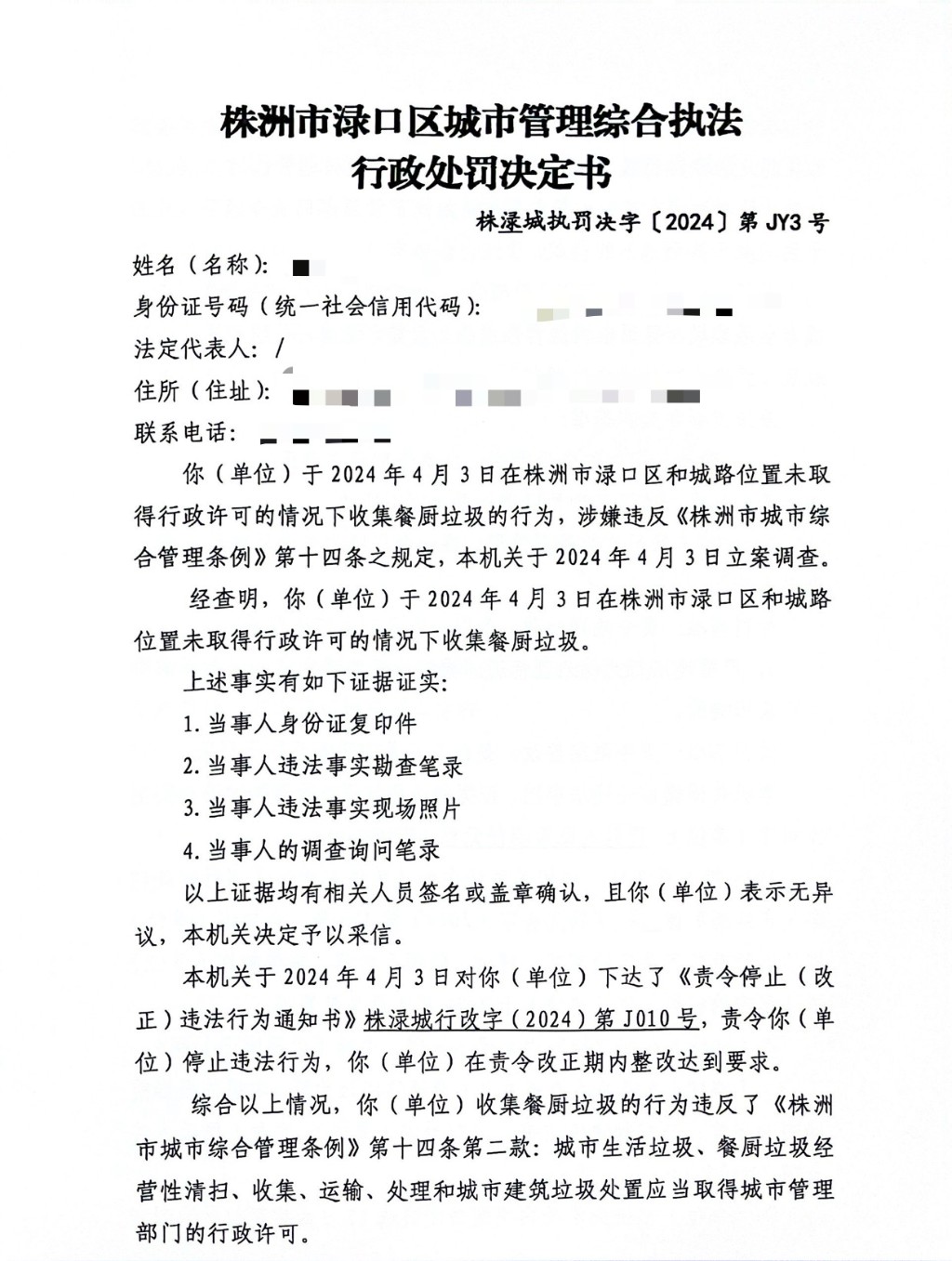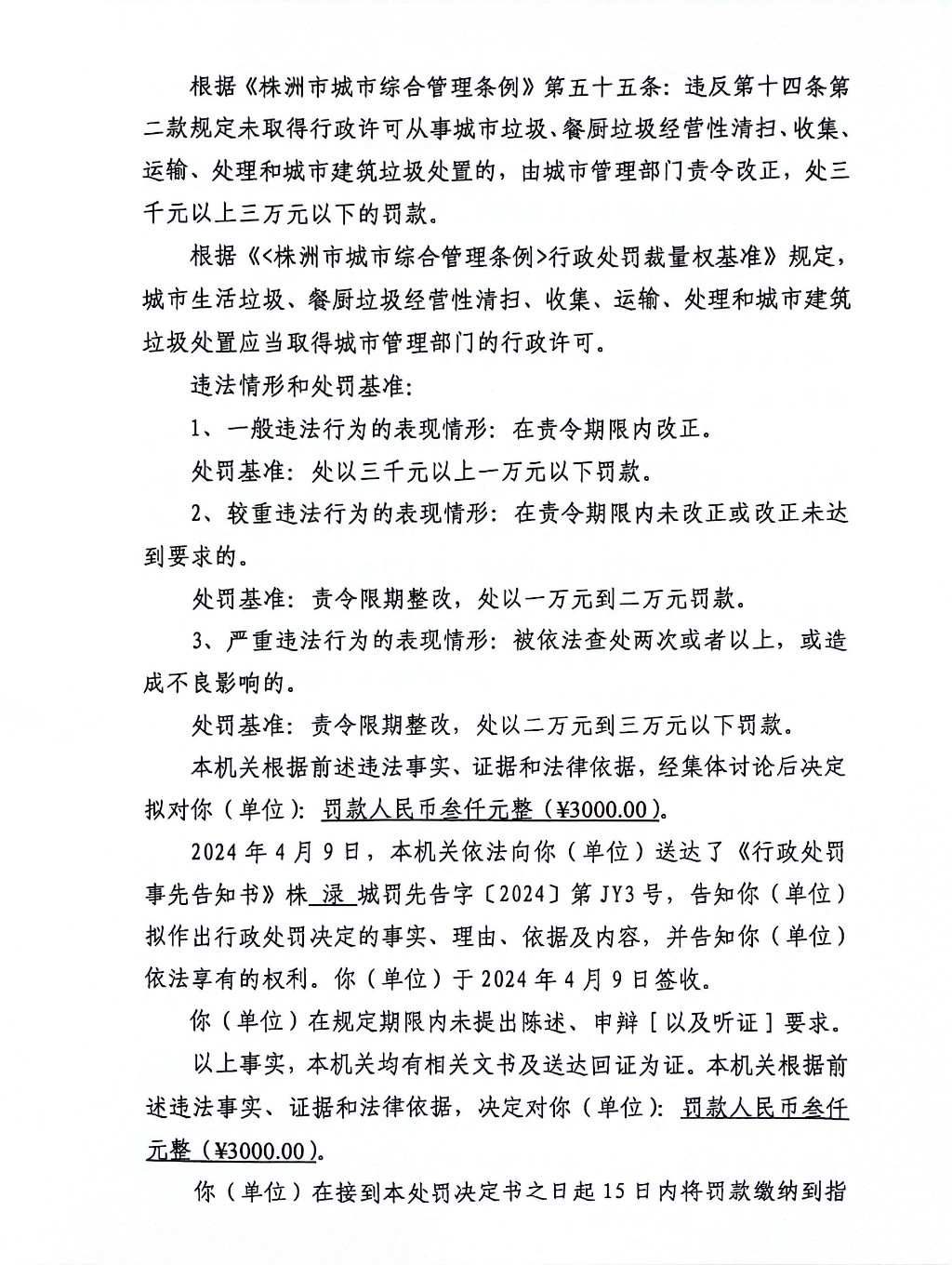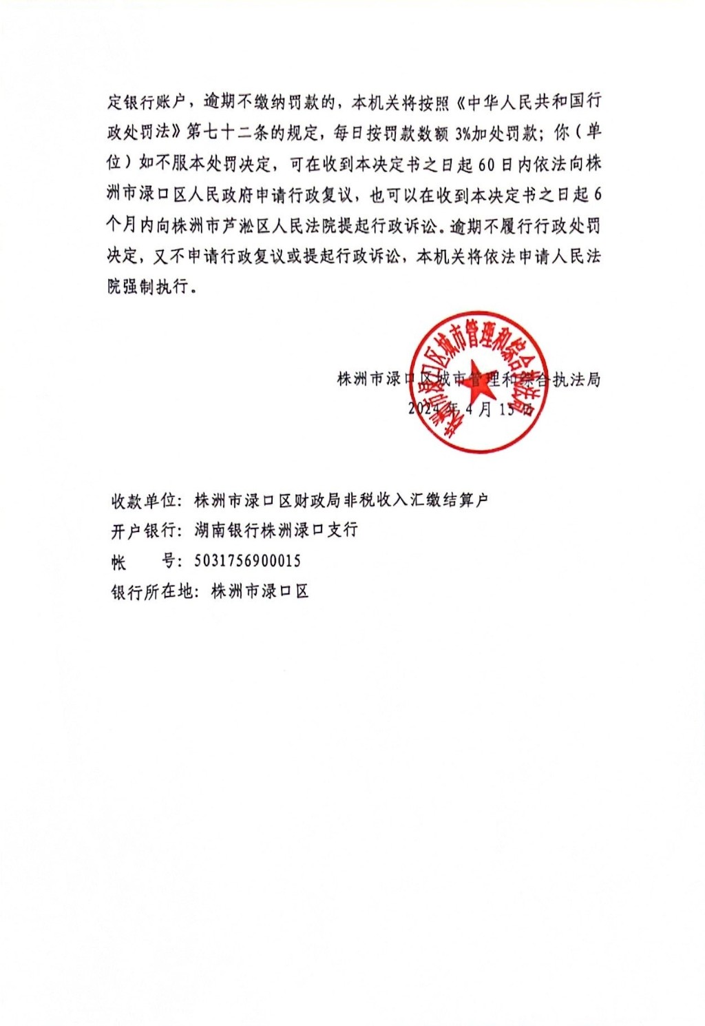 株洲市渌口区城市管理和综合执法局行政处罚决定书 株(渌)城行罚字〔2024〕第JY3号