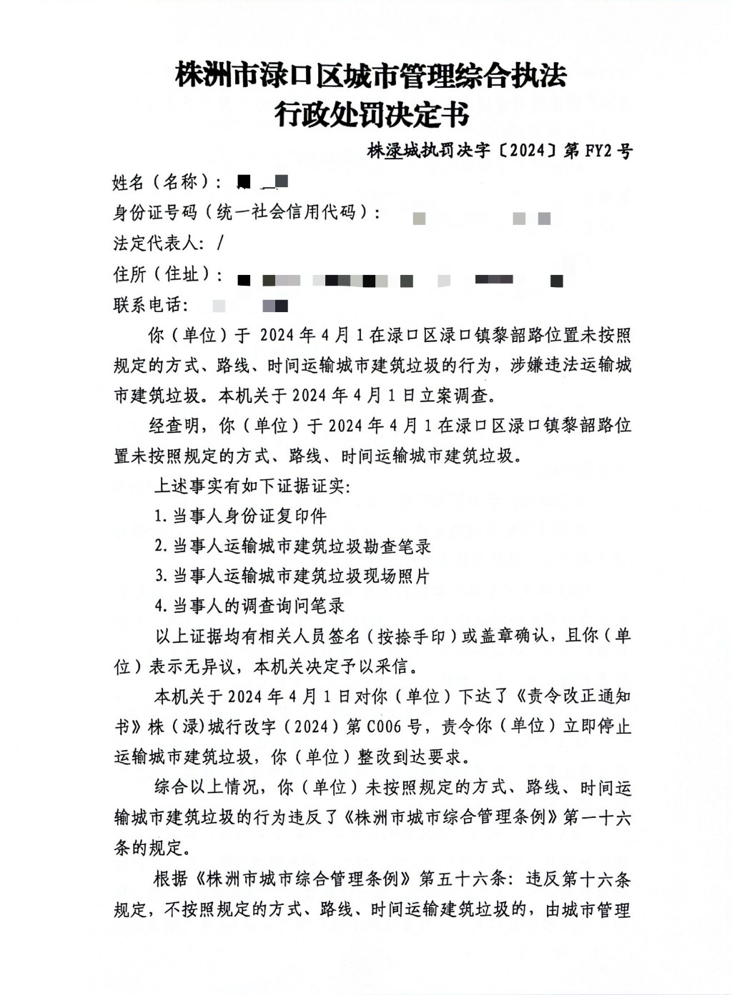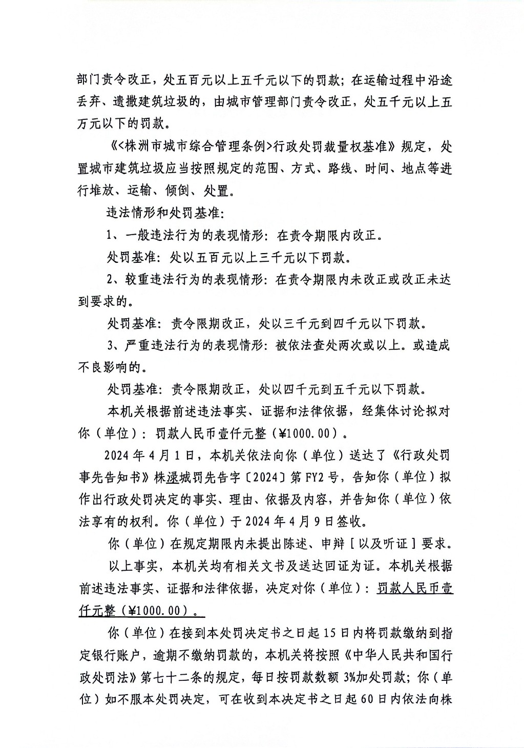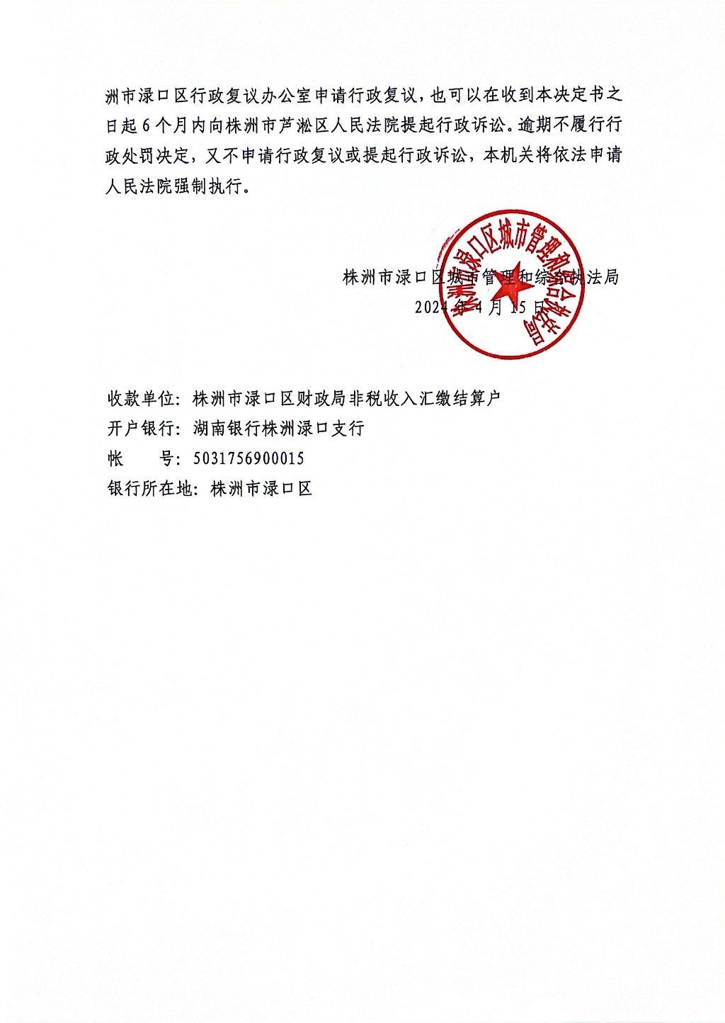 株洲市渌口区城市管理和综合执法局行政处罚决定书 株(渌)城行罚字〔2024〕第FY2号