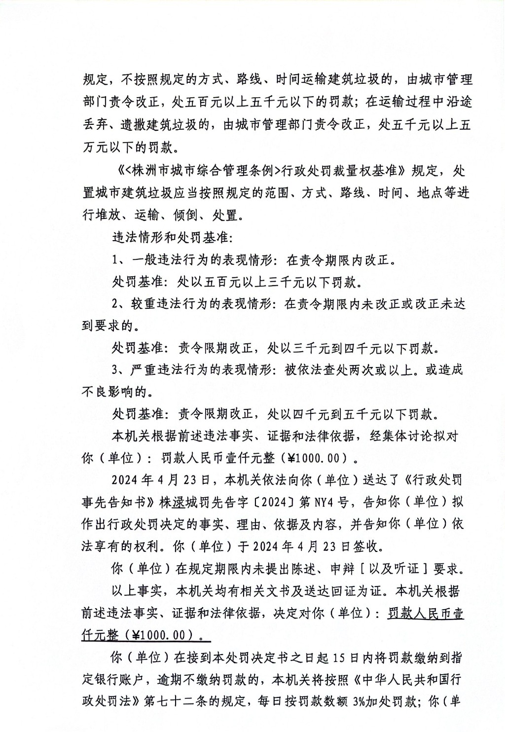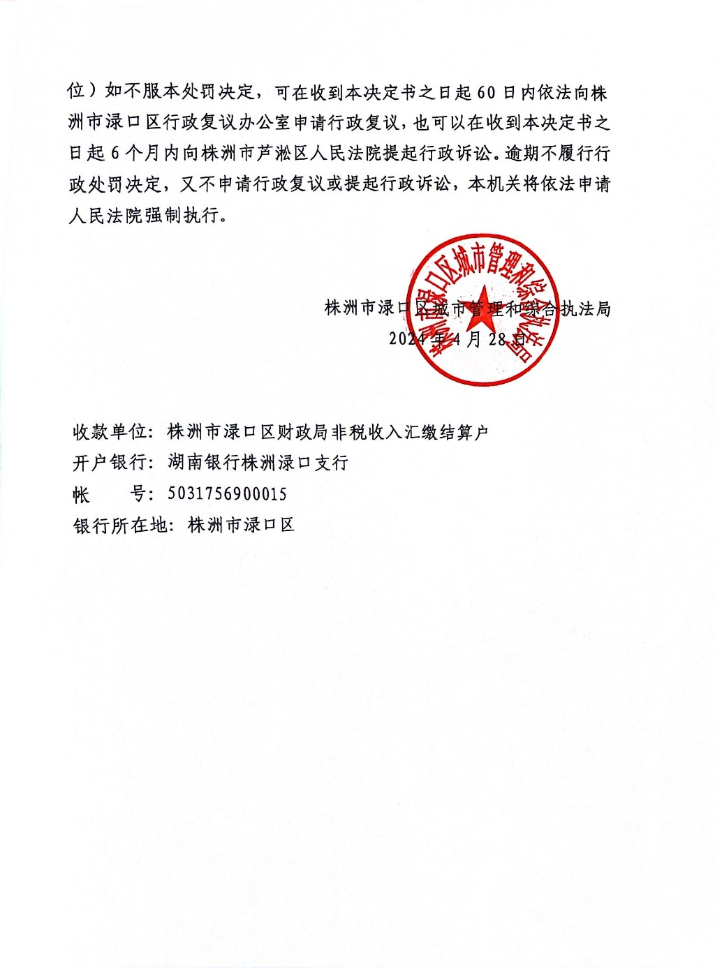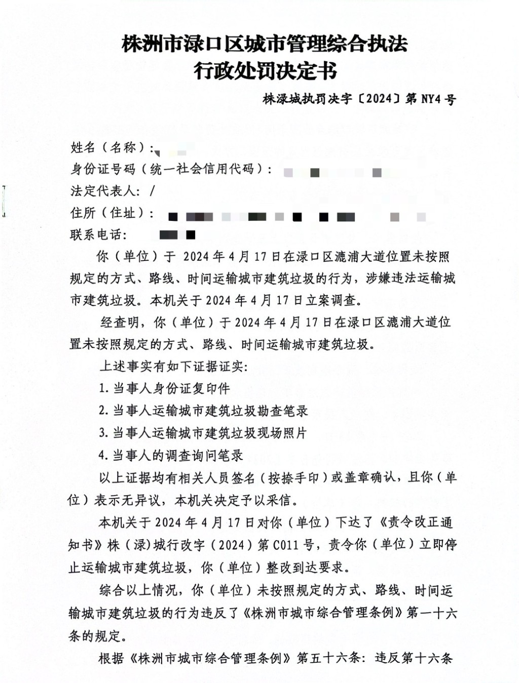 株洲市渌口区城市管理和综合执法局行政处罚决定书 株(渌)城行罚字〔2024〕第NY4号