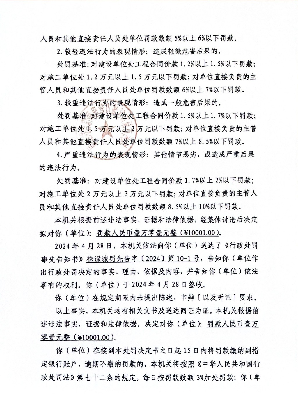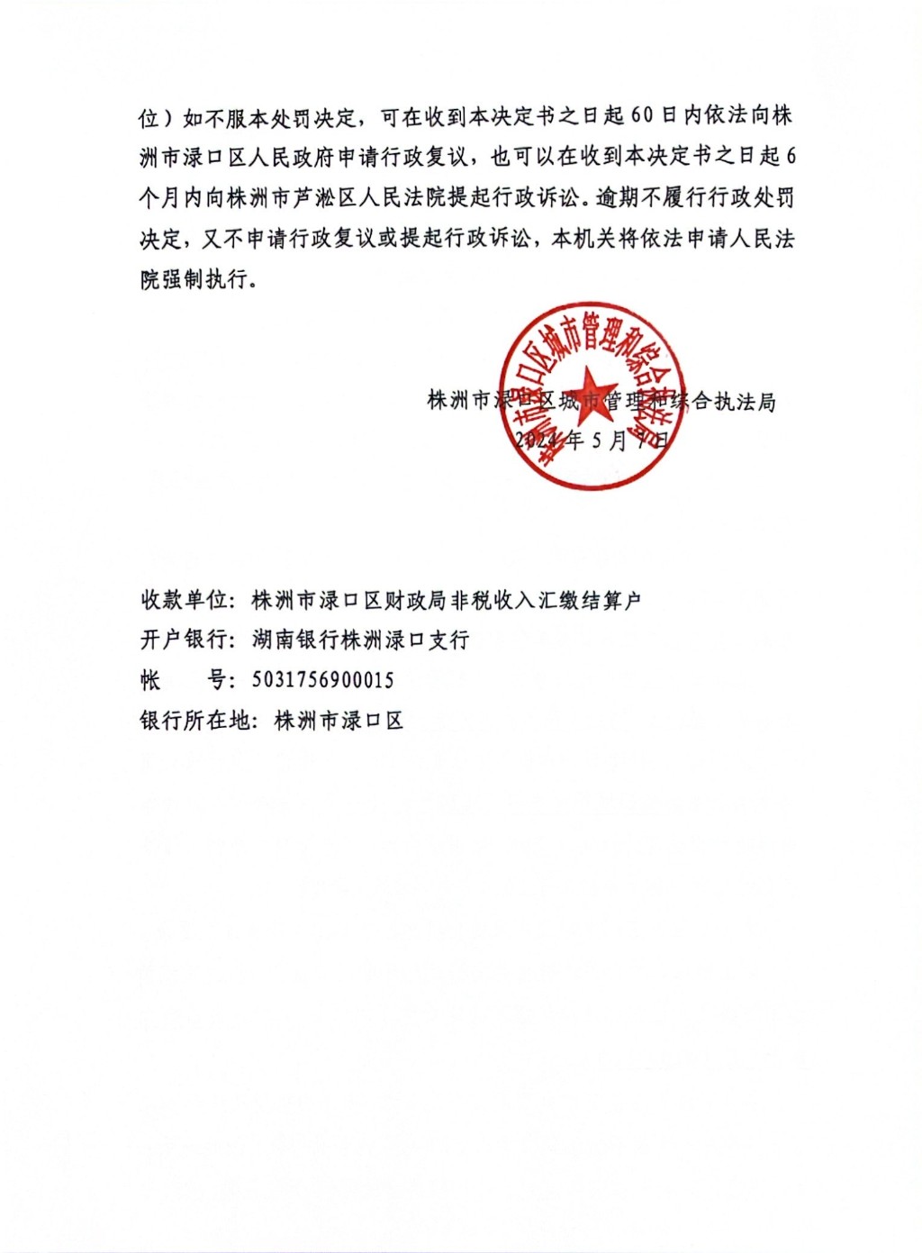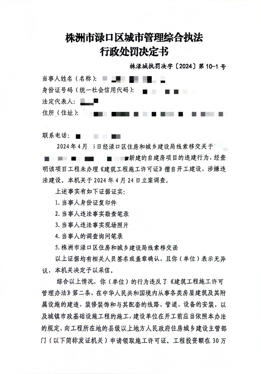 株洲市渌口区城市管理和综合执法局行政处罚决定书 株(渌)城行罚字〔2024〕第10-1号