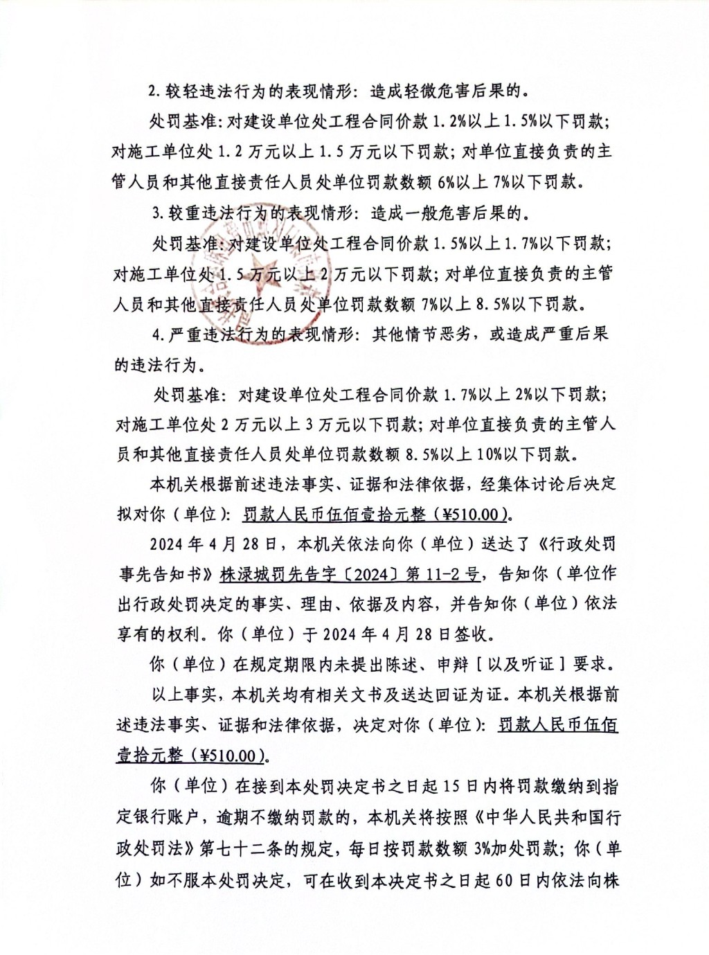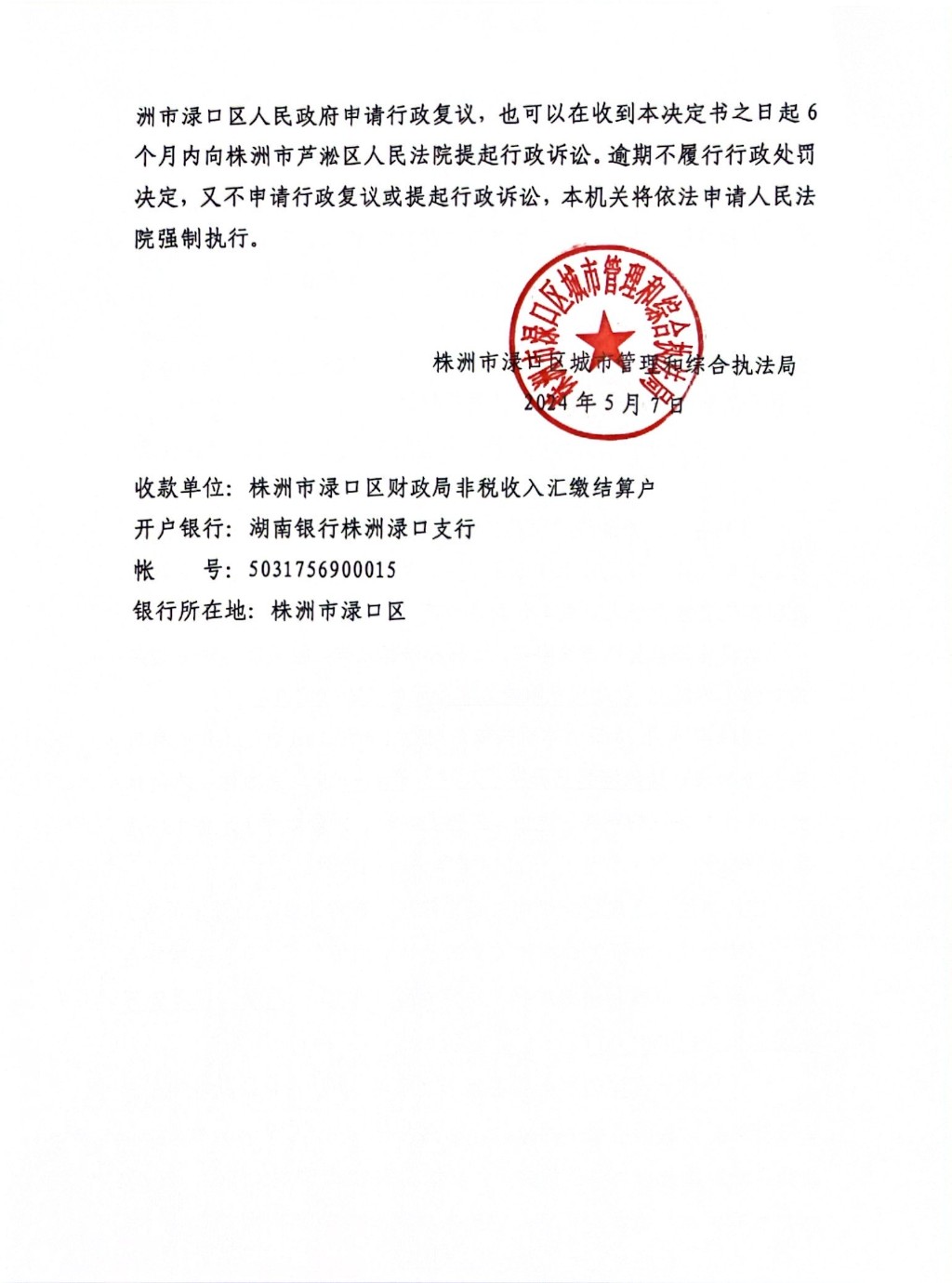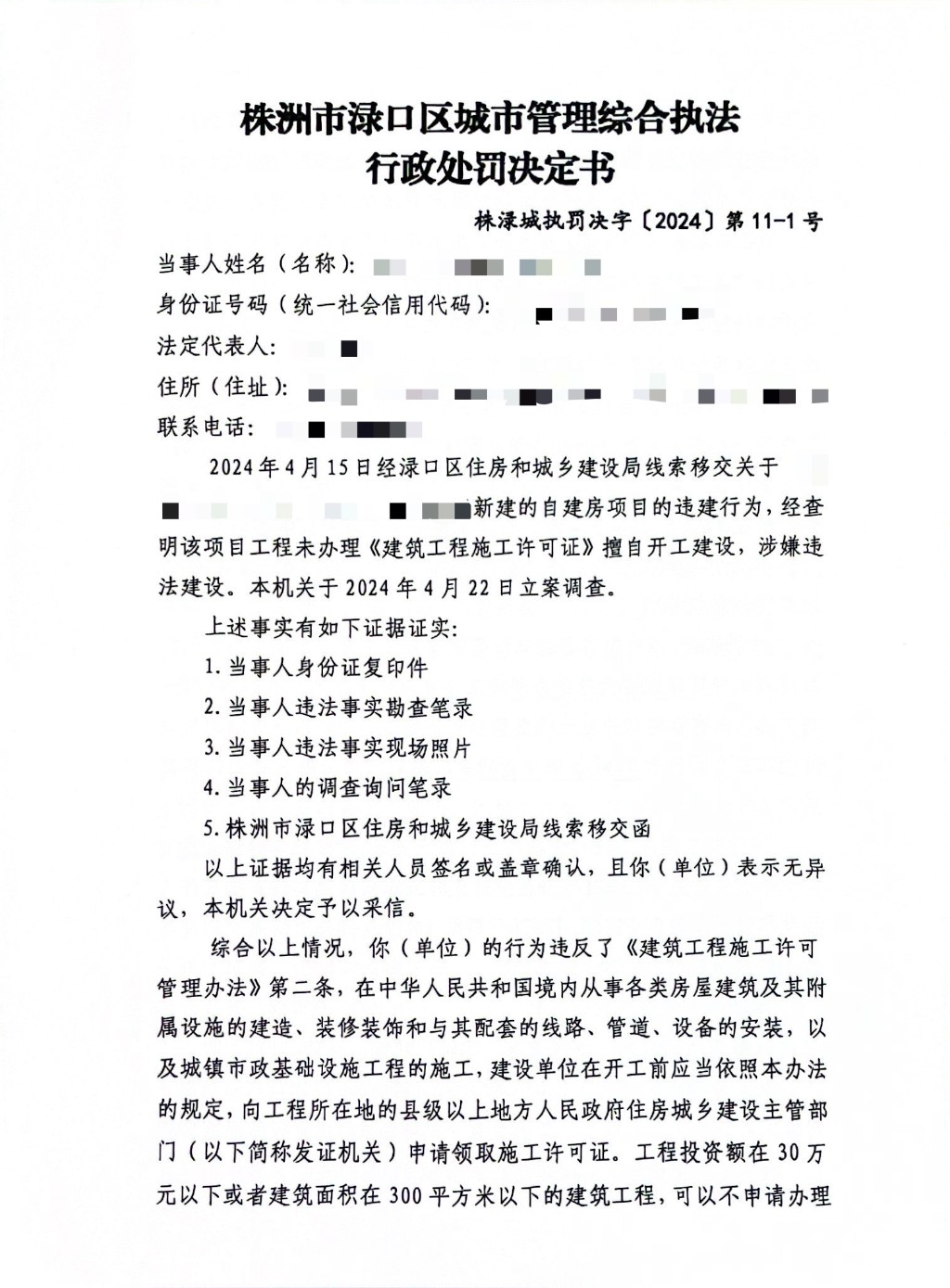 株洲市渌口区城市管理和综合执法局行政处罚决定书 株(渌)城行罚字〔2024〕第11-1号