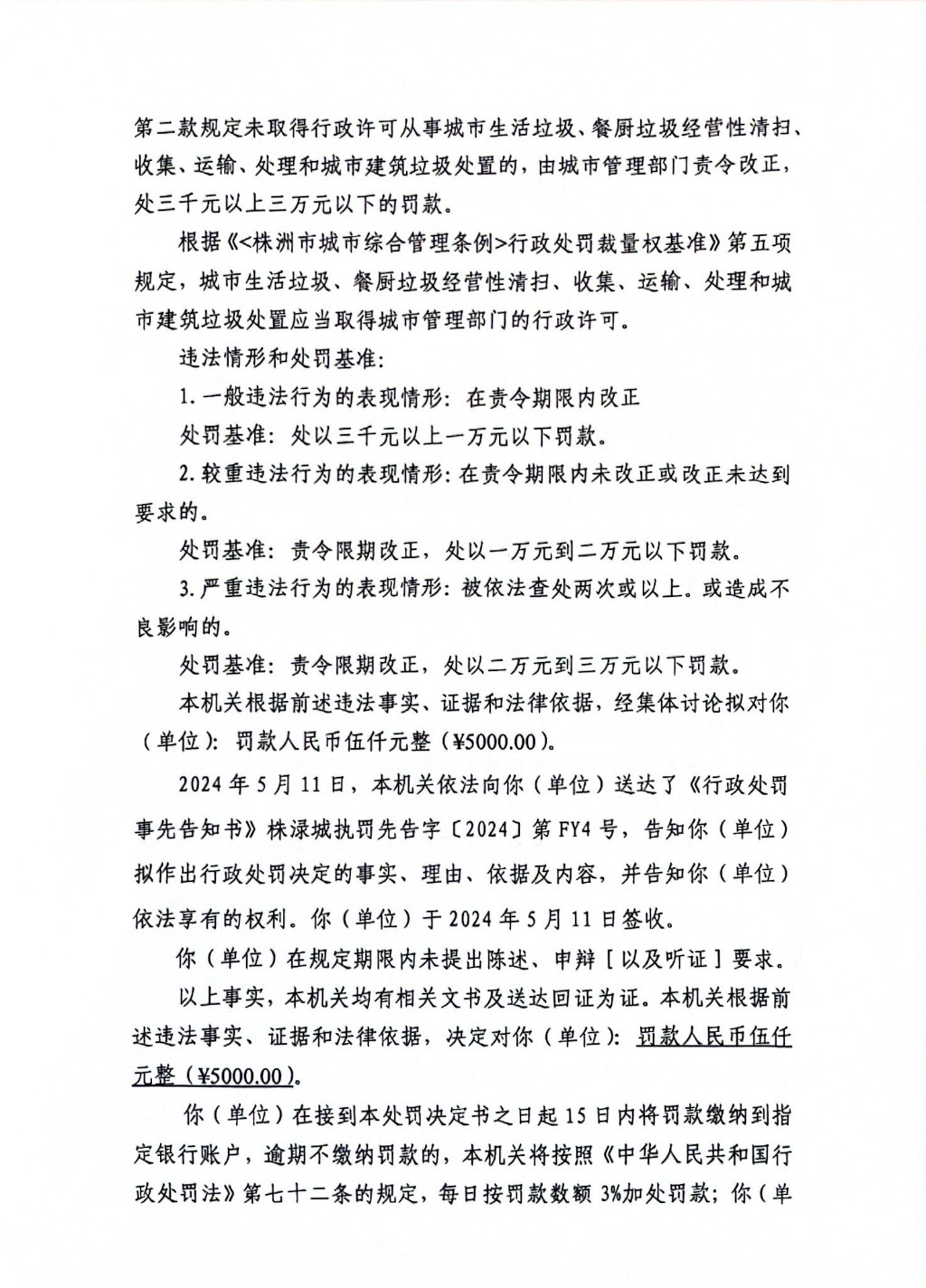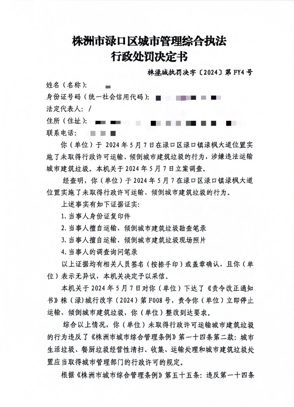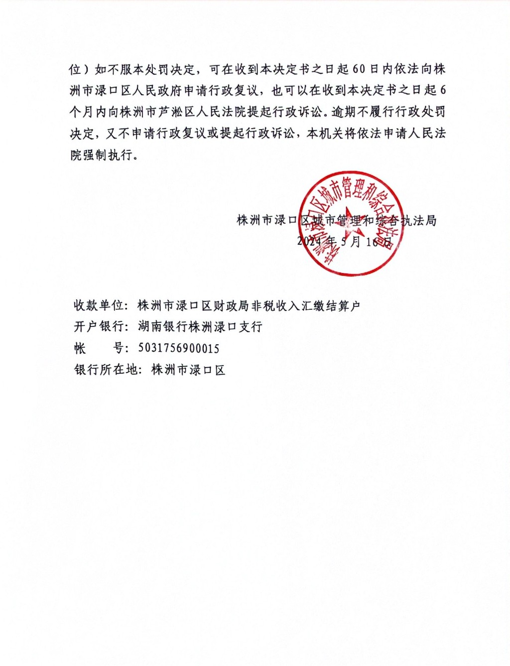 株洲市渌口区城市管理和综合执法局行政处罚决定书 株(渌)城行罚字〔2024〕第FY4号