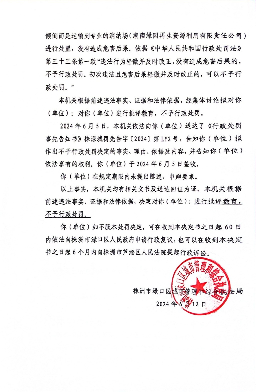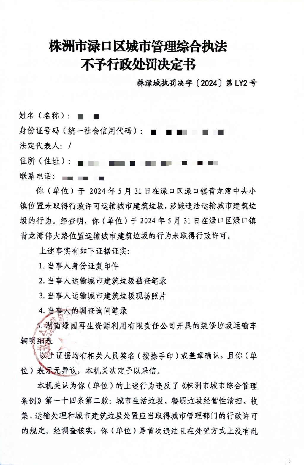 株洲市渌口区城市管理和综合执法局行政处罚决定书 株(渌)城行罚字〔2024〕第LY2号