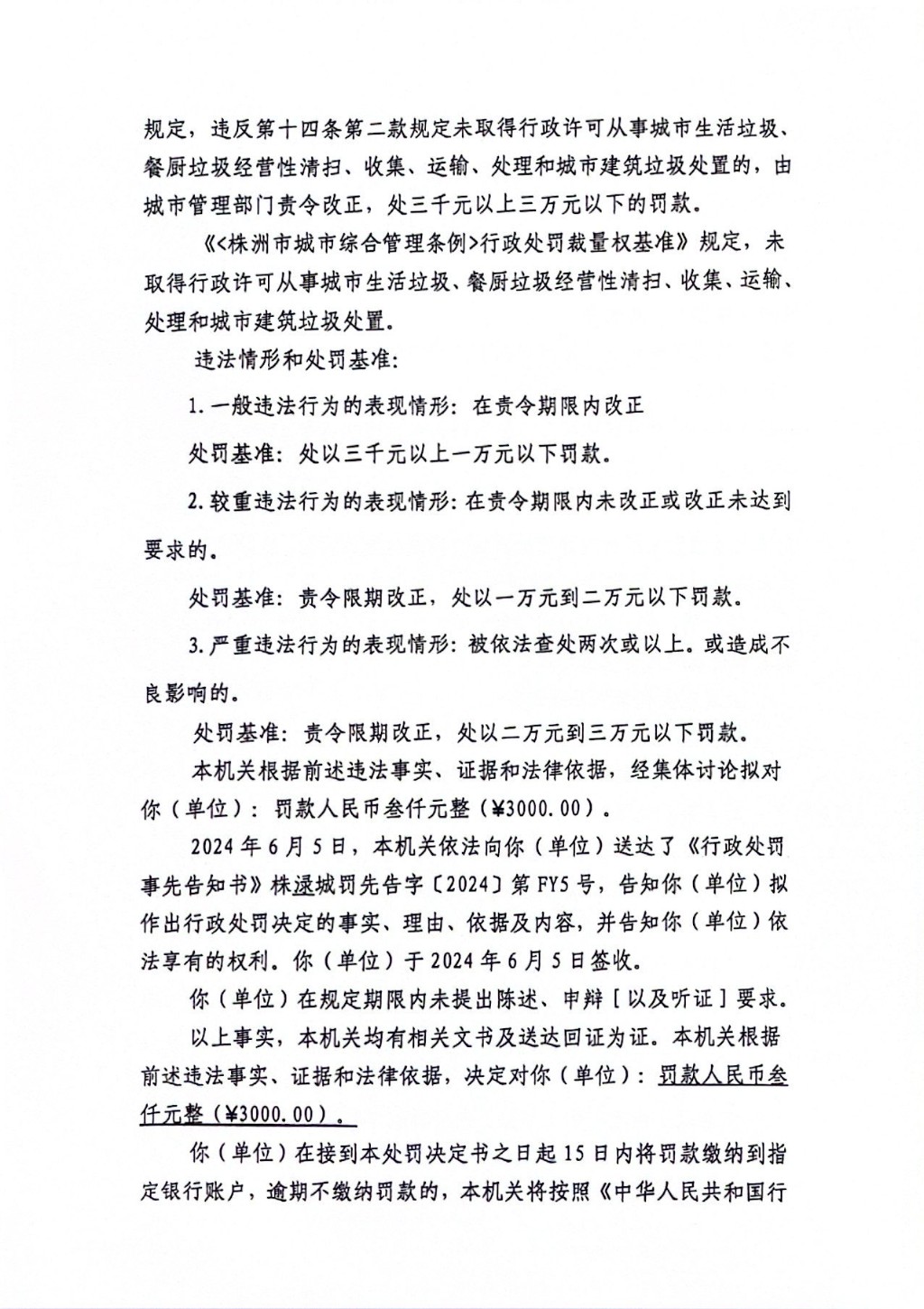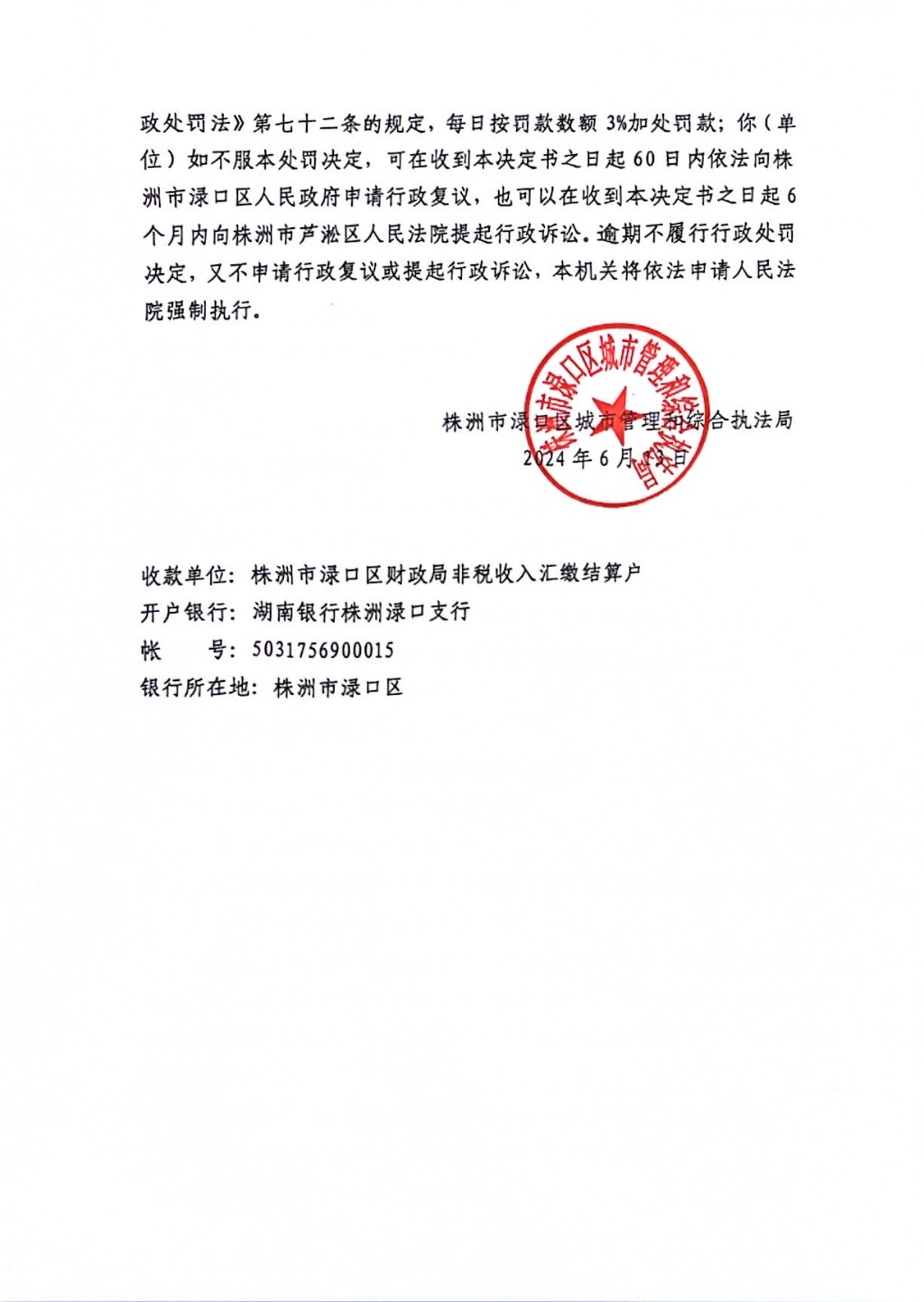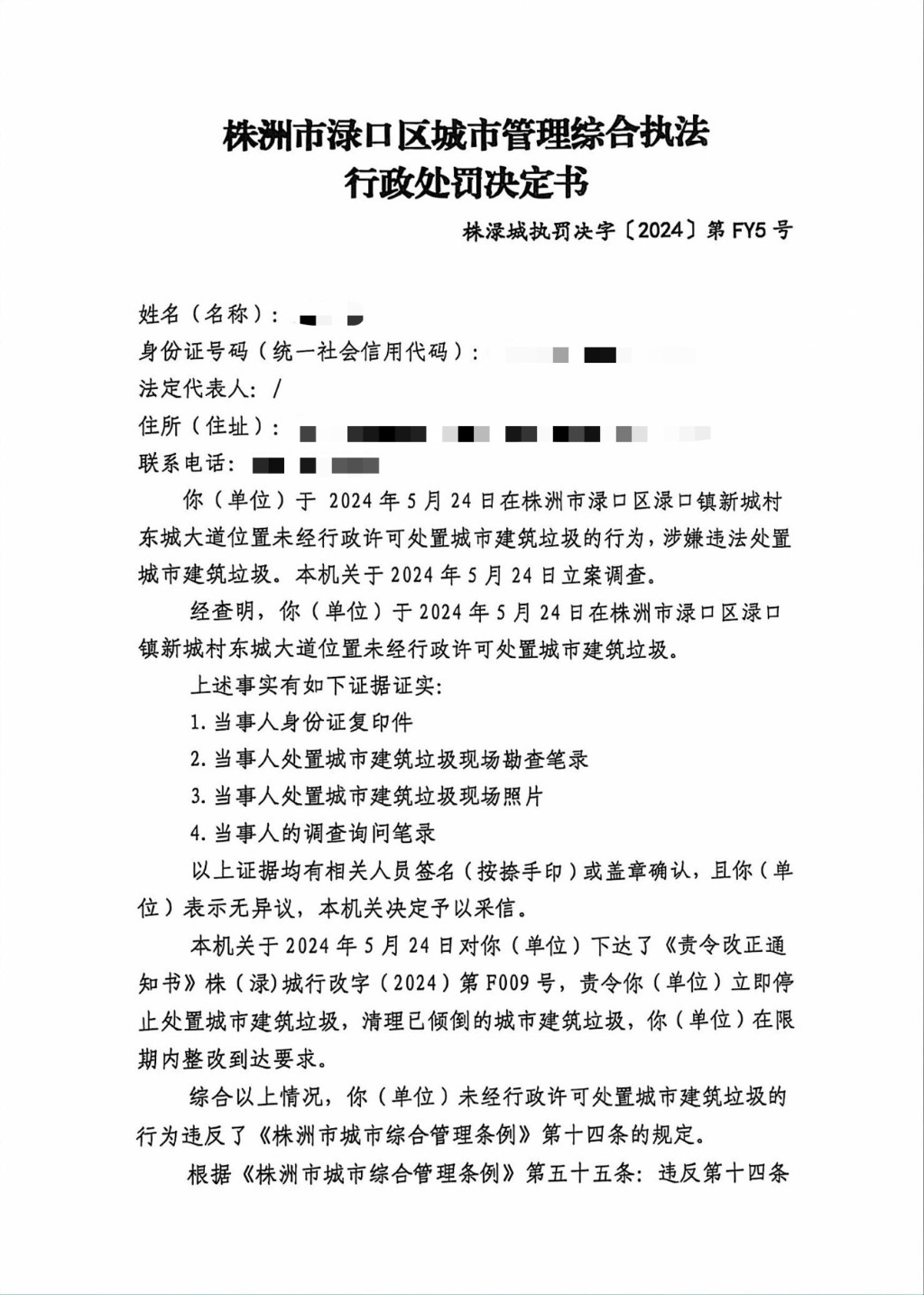 株洲市渌口区城市管理和综合执法局行政处罚决定书 株(渌)城行罚字〔2024〕第FY5号