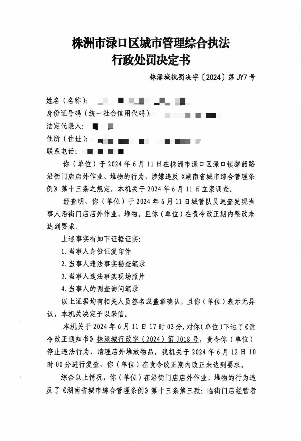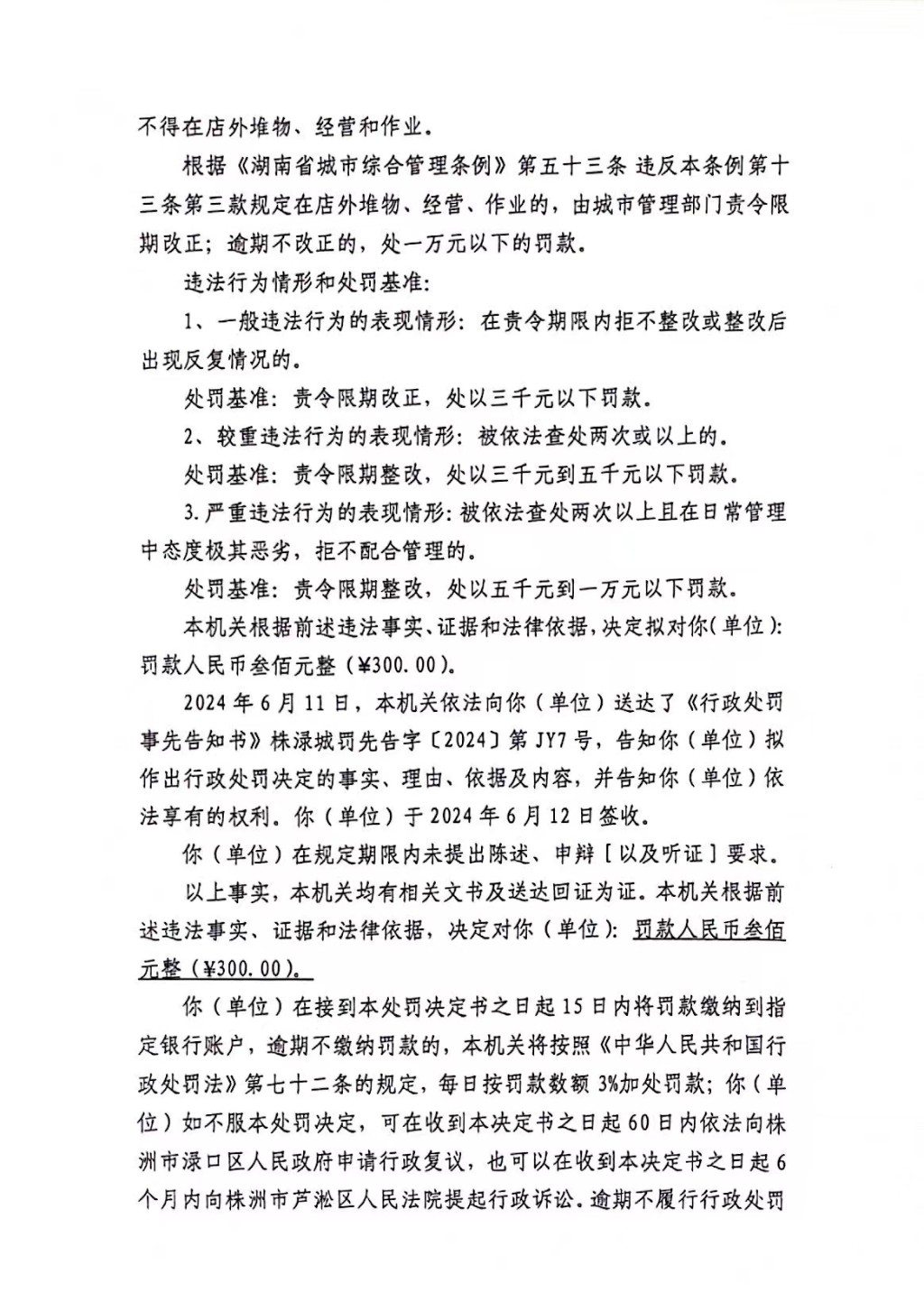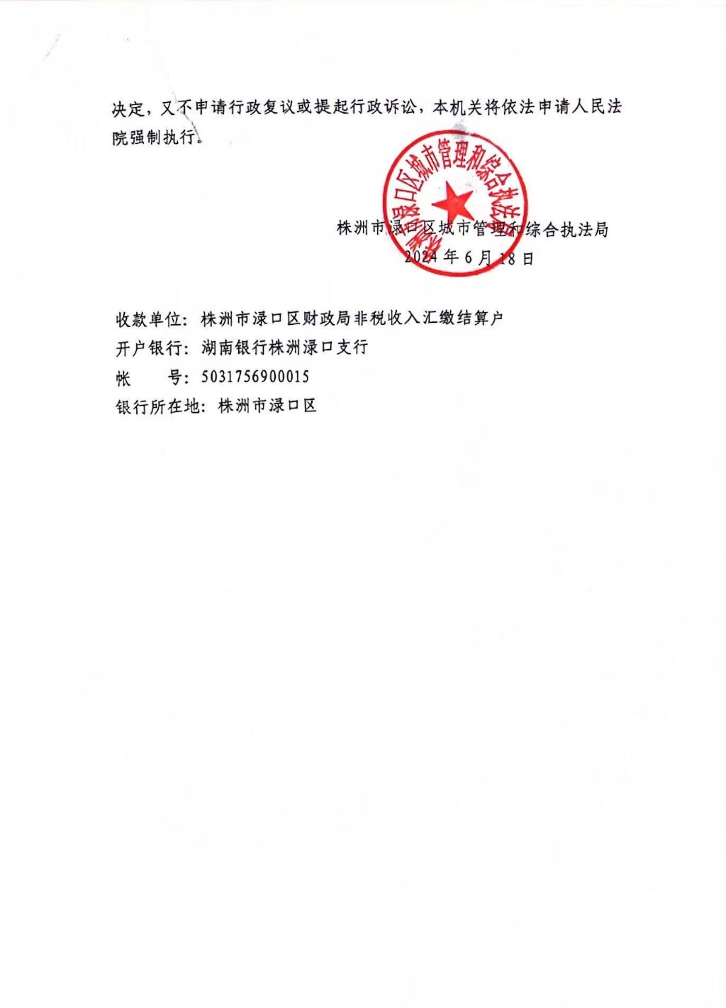 株洲市渌口区城市管理和综合执法局行政处罚决定书 株(渌)城行罚字〔2024〕第JY7号