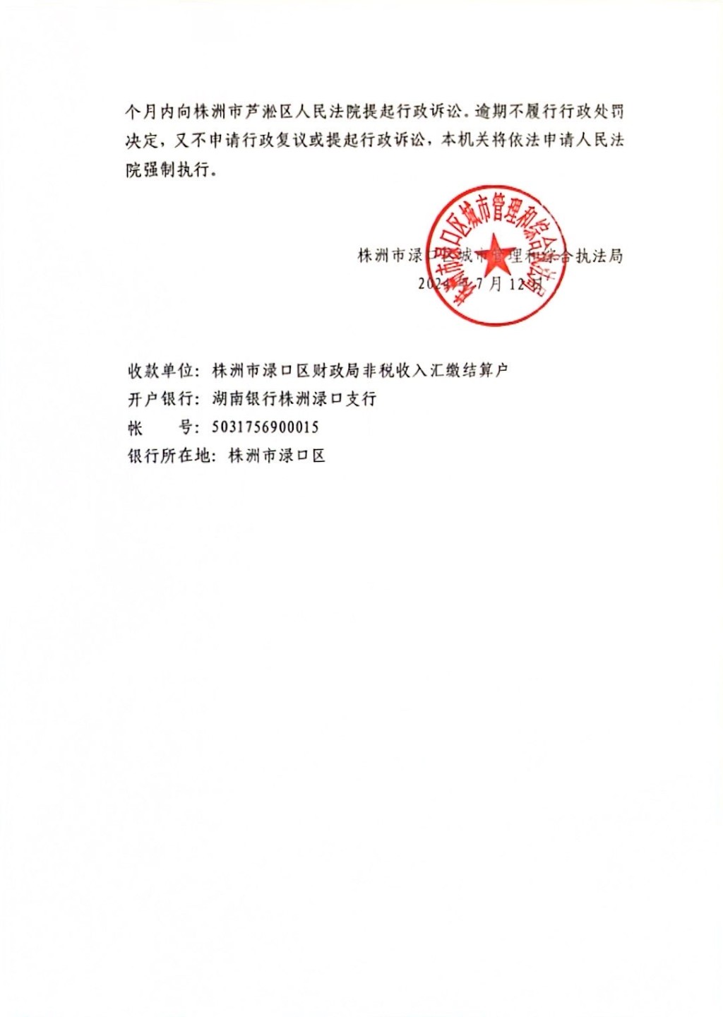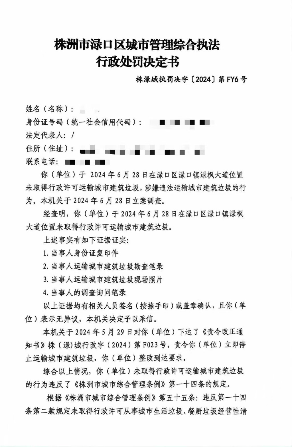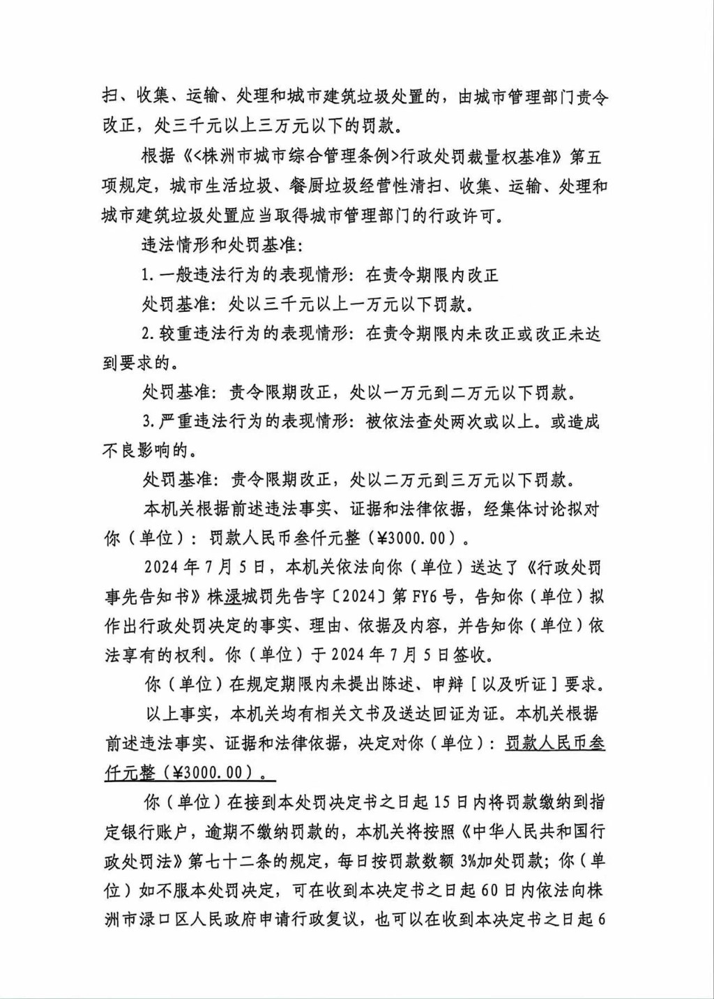 株洲市渌口区城市管理和综合执法局行政处罚决定书 株(渌)城执罚决字〔2024〕第FY6号