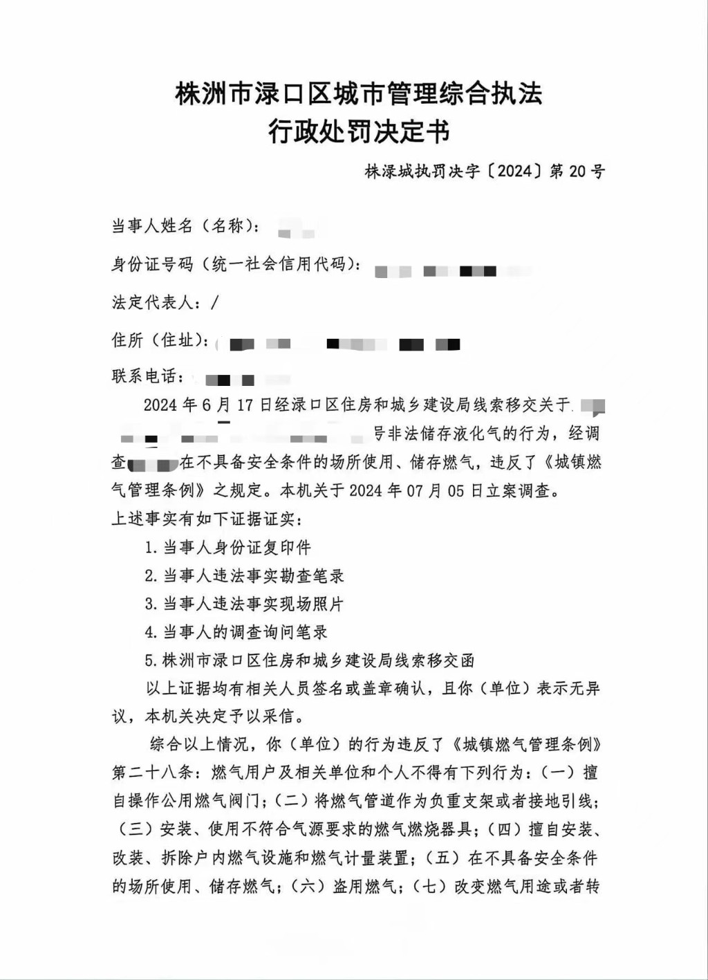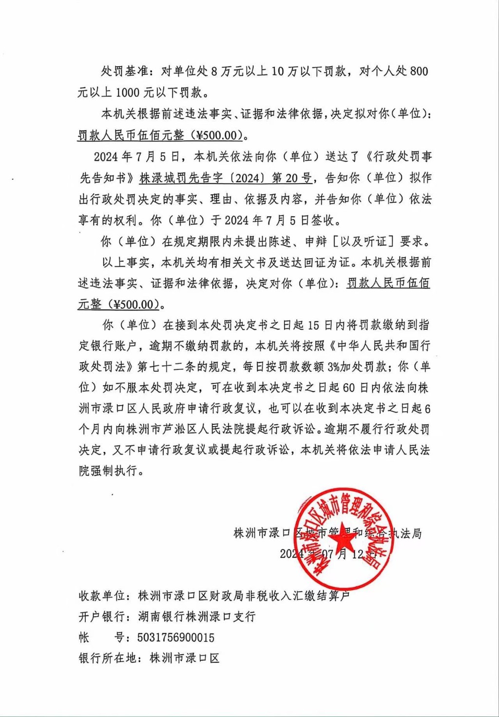 株洲市渌口区城市管理和综合执法局行政处罚决定书 株(渌)城执罚决字〔2024〕第20号