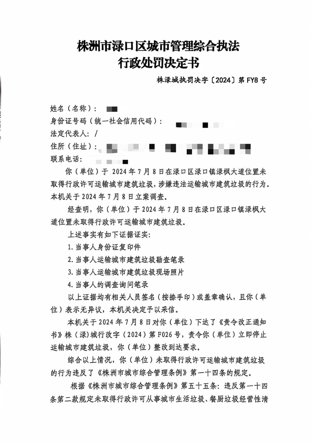 株洲市渌口区城市管理和综合执法局行政处罚决定书 株(渌)城执罚决字〔2024〕第FY8号
