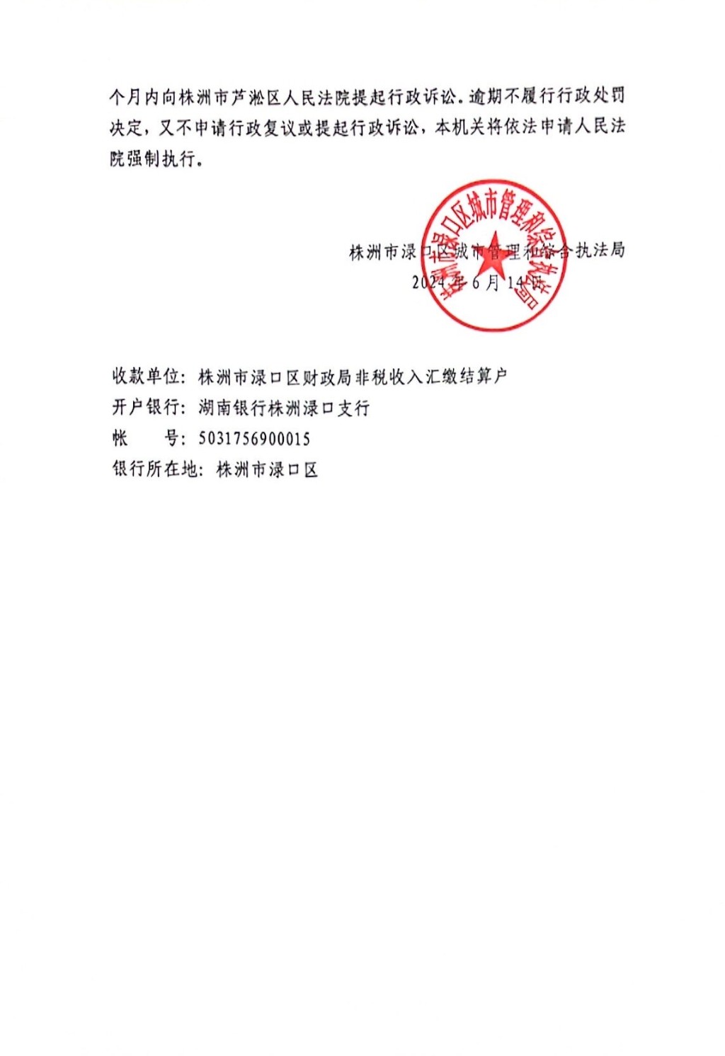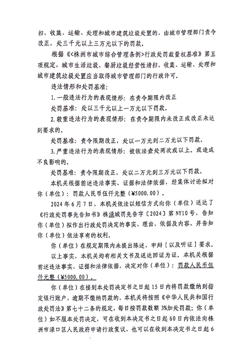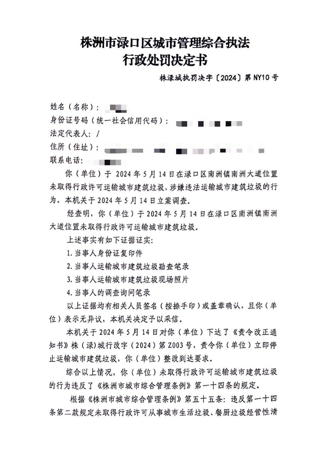 株洲市渌口区城市管理和综合执法局行政处罚决定书 株(渌)城行罚字〔2024〕第NY10号