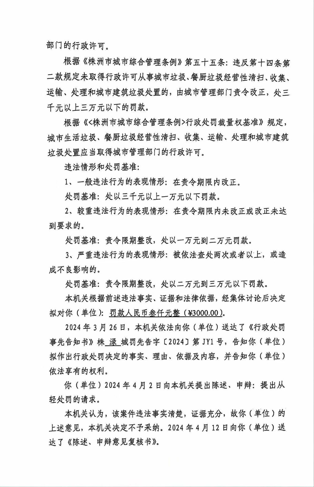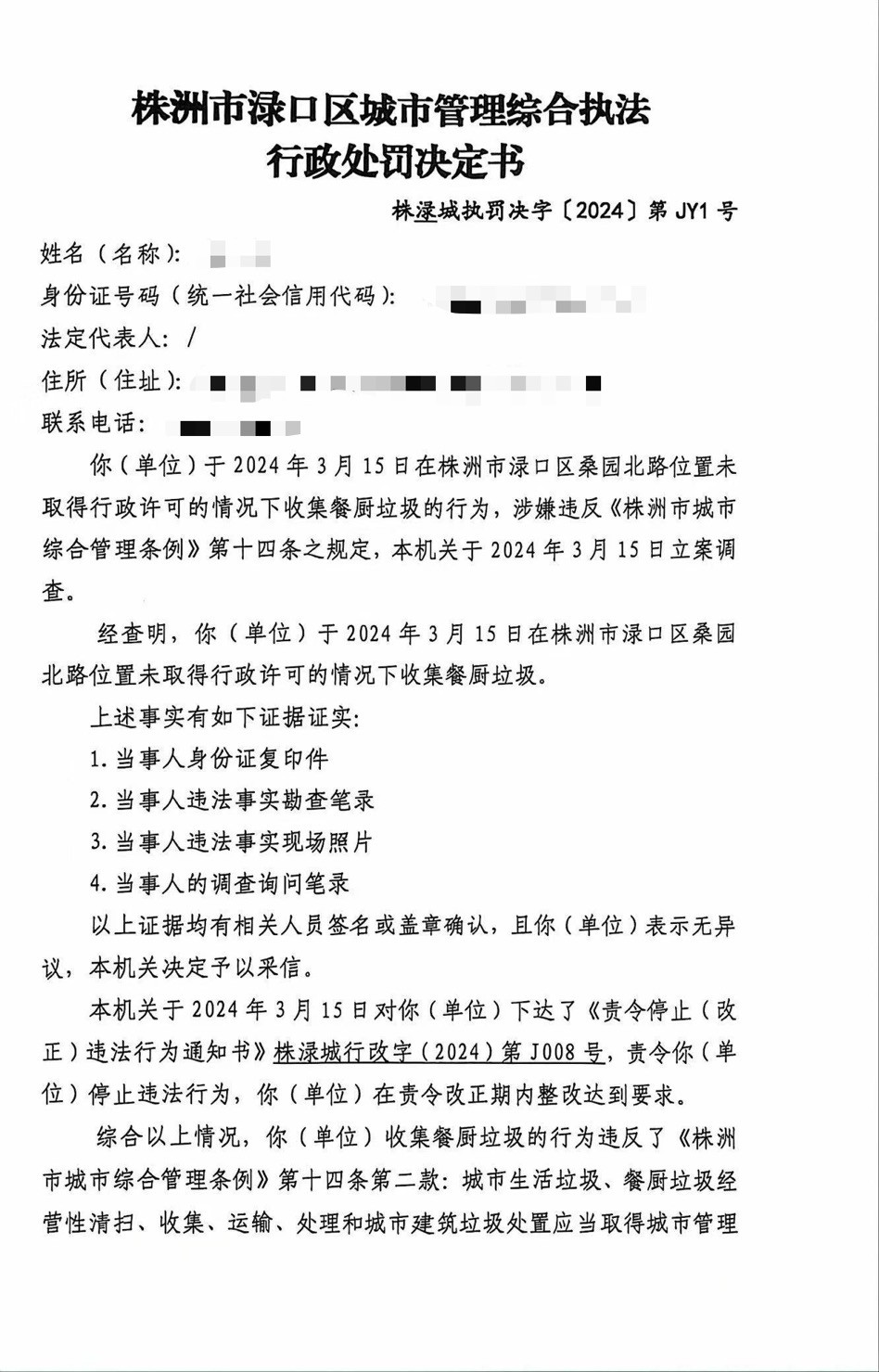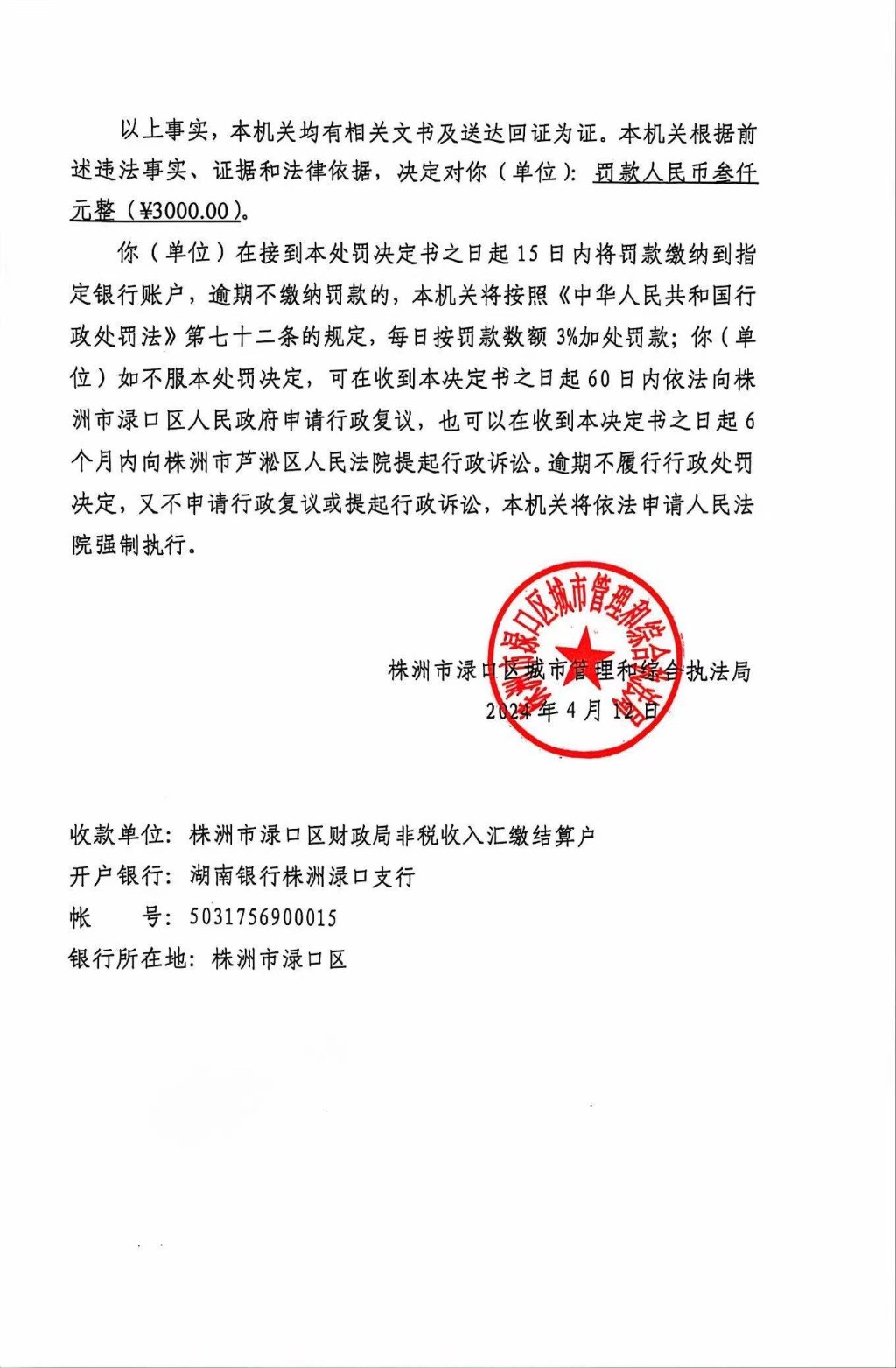 株洲市渌口区城市管理和综合执法局行政处罚决定书 株(渌)城行罚字〔2024〕第JY1号