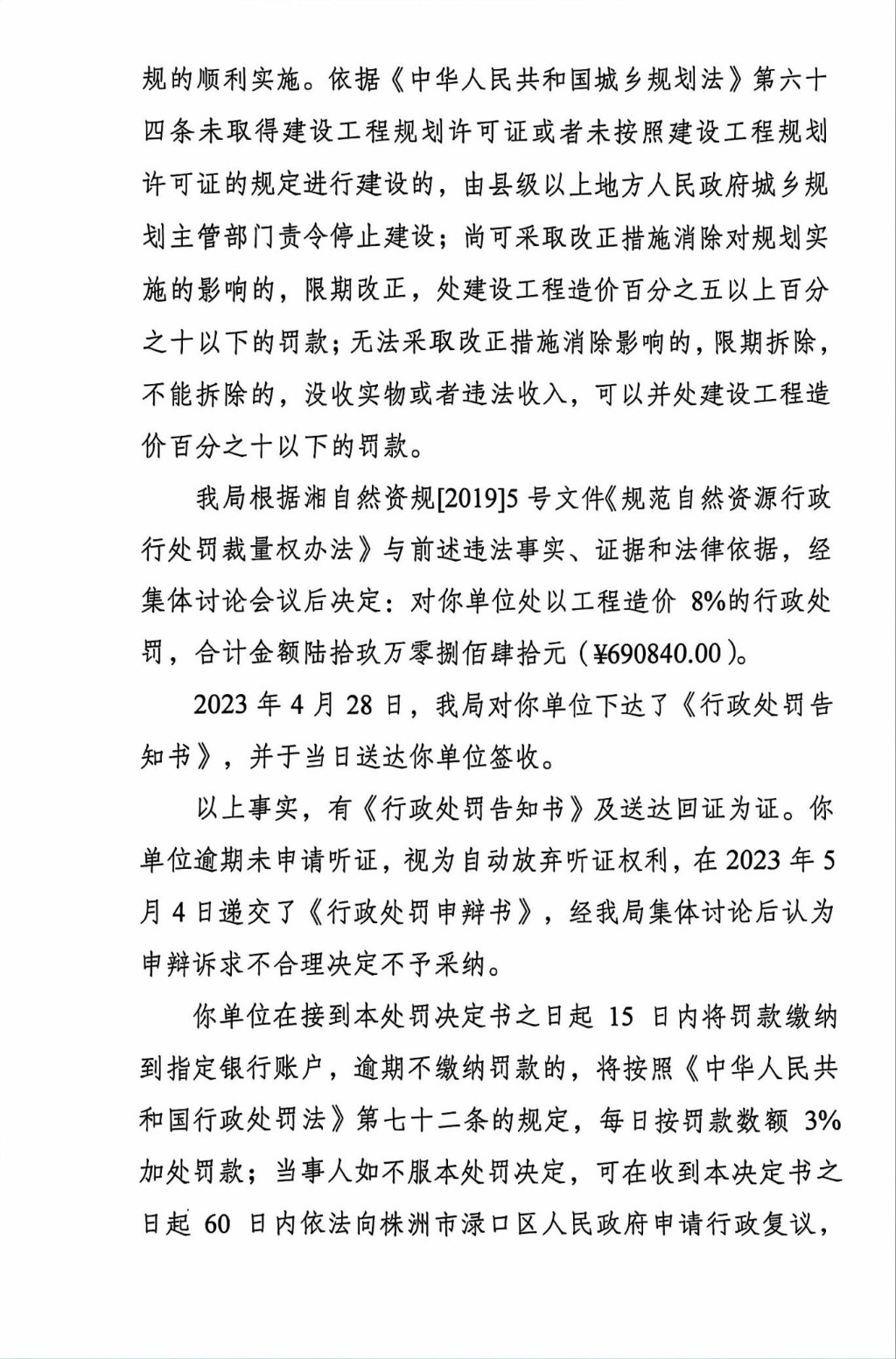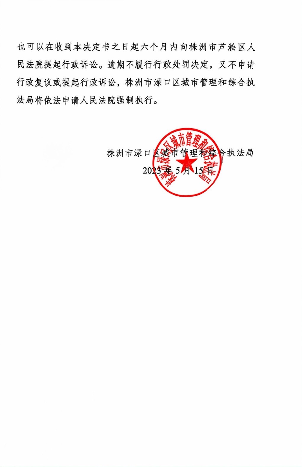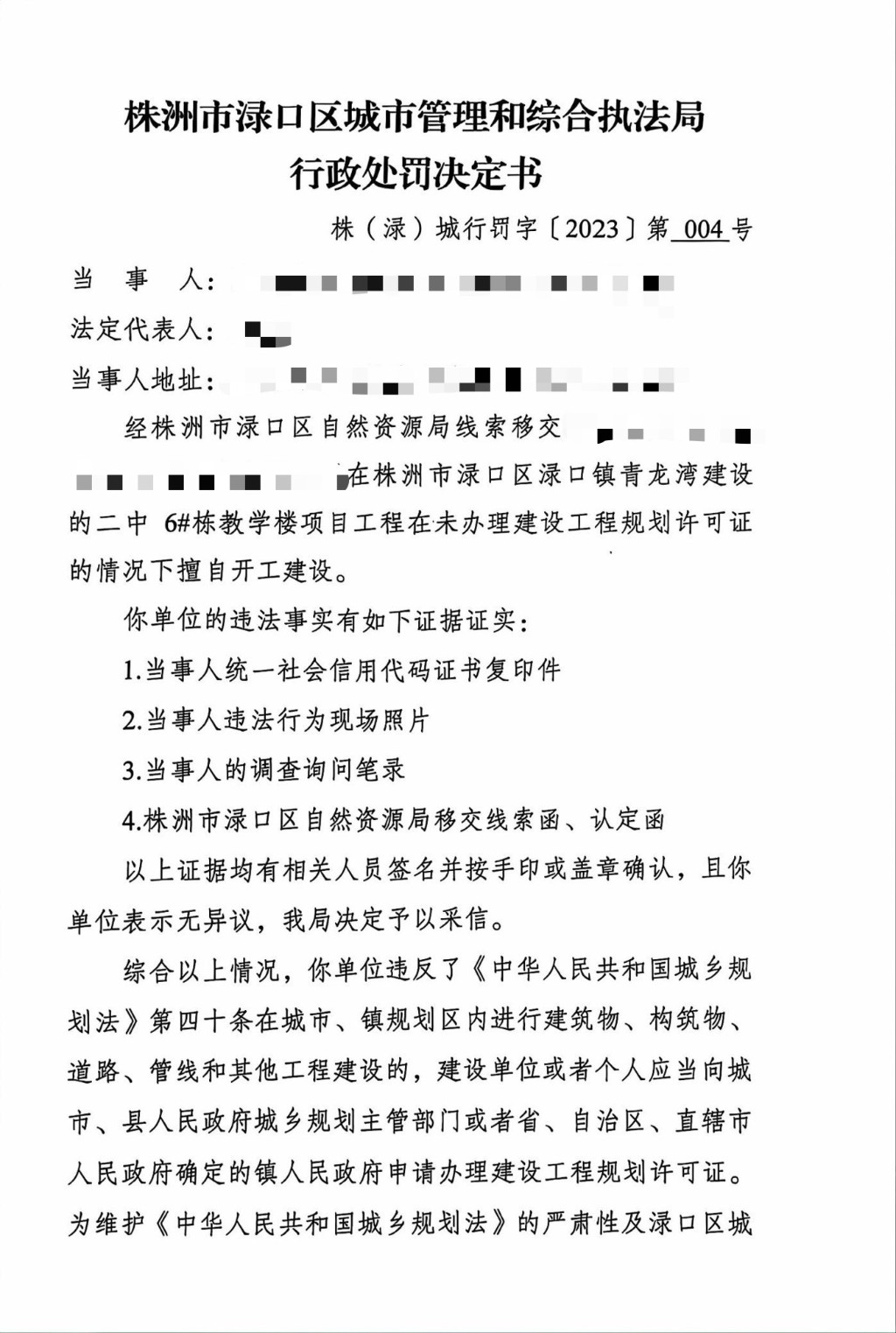 株洲市渌口区城市管理和综合执法局行政处罚决定书 株(渌)城执罚决字〔2023〕第004号