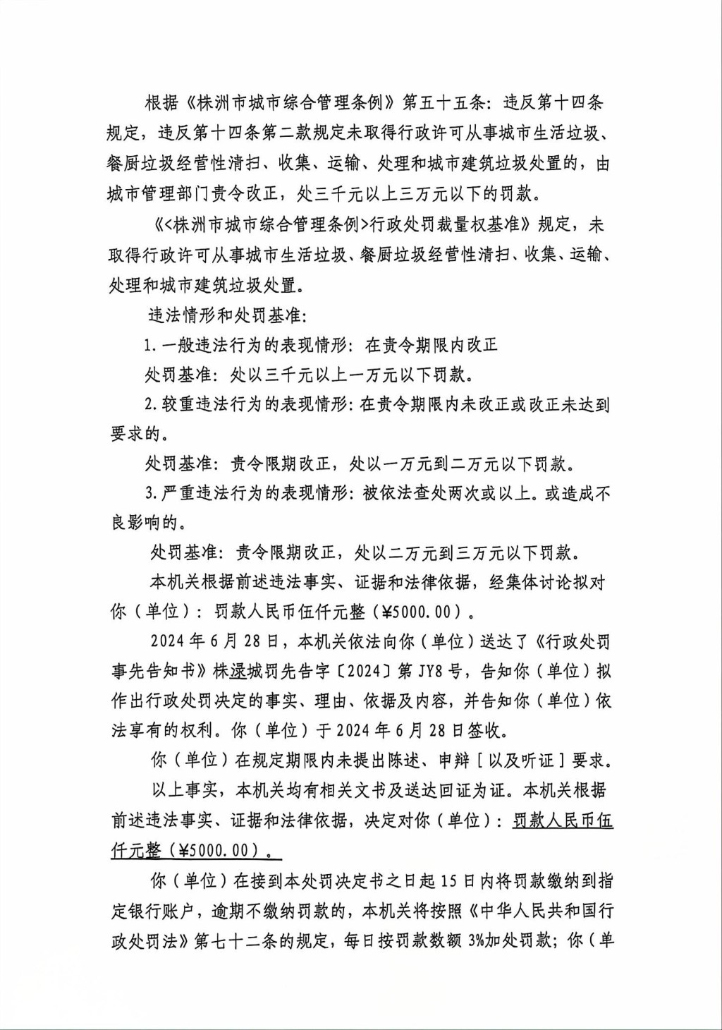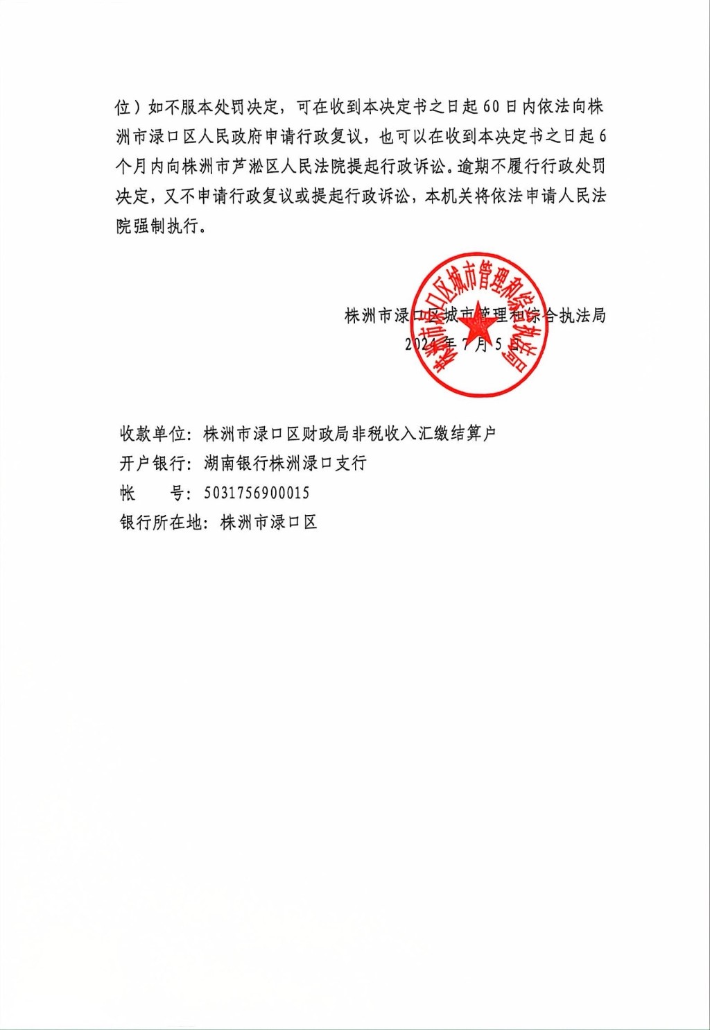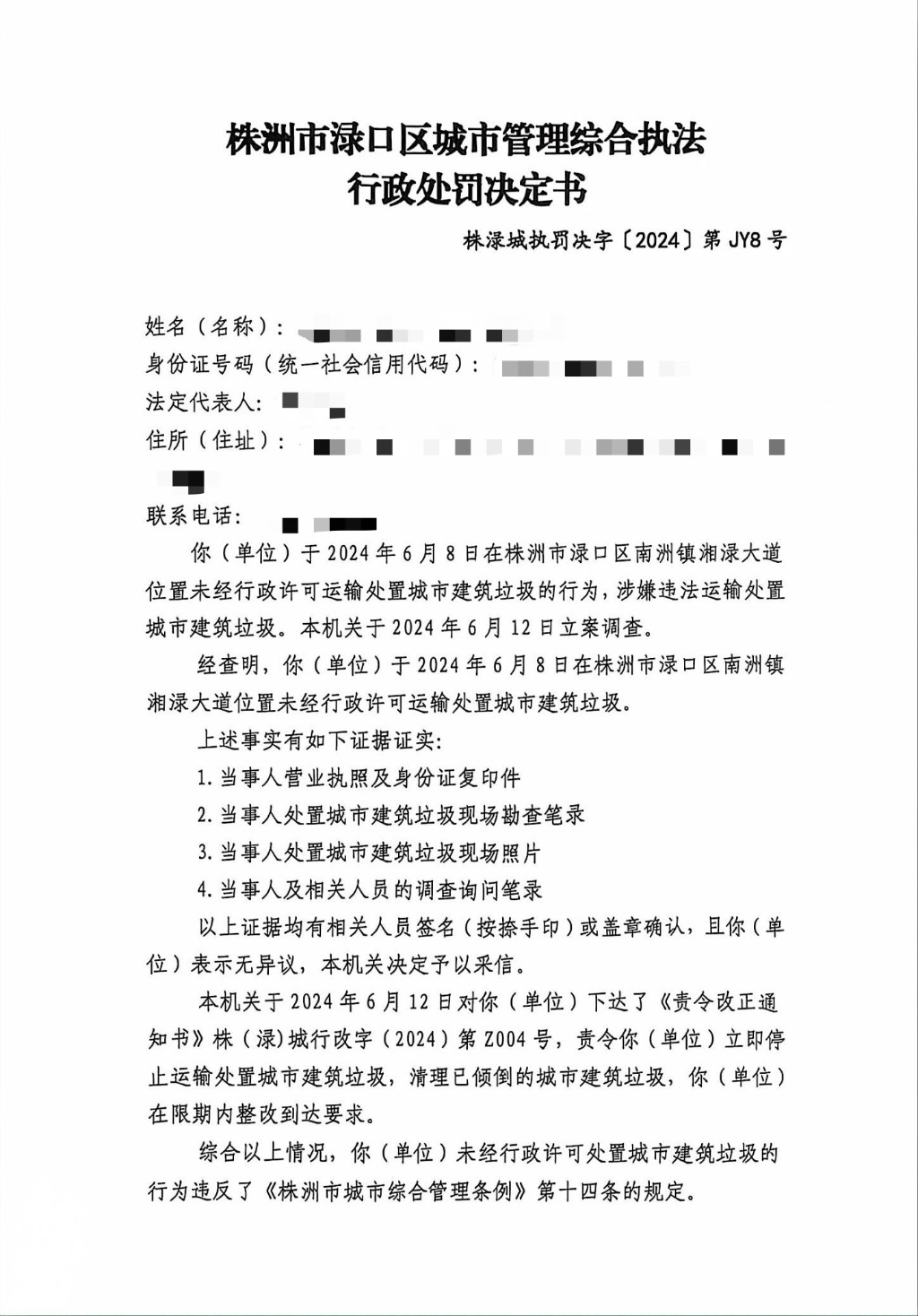 株洲市渌口区城市管理和综合执法局行政处罚决定书 株(渌)城执罚决字〔2024〕第JY8号