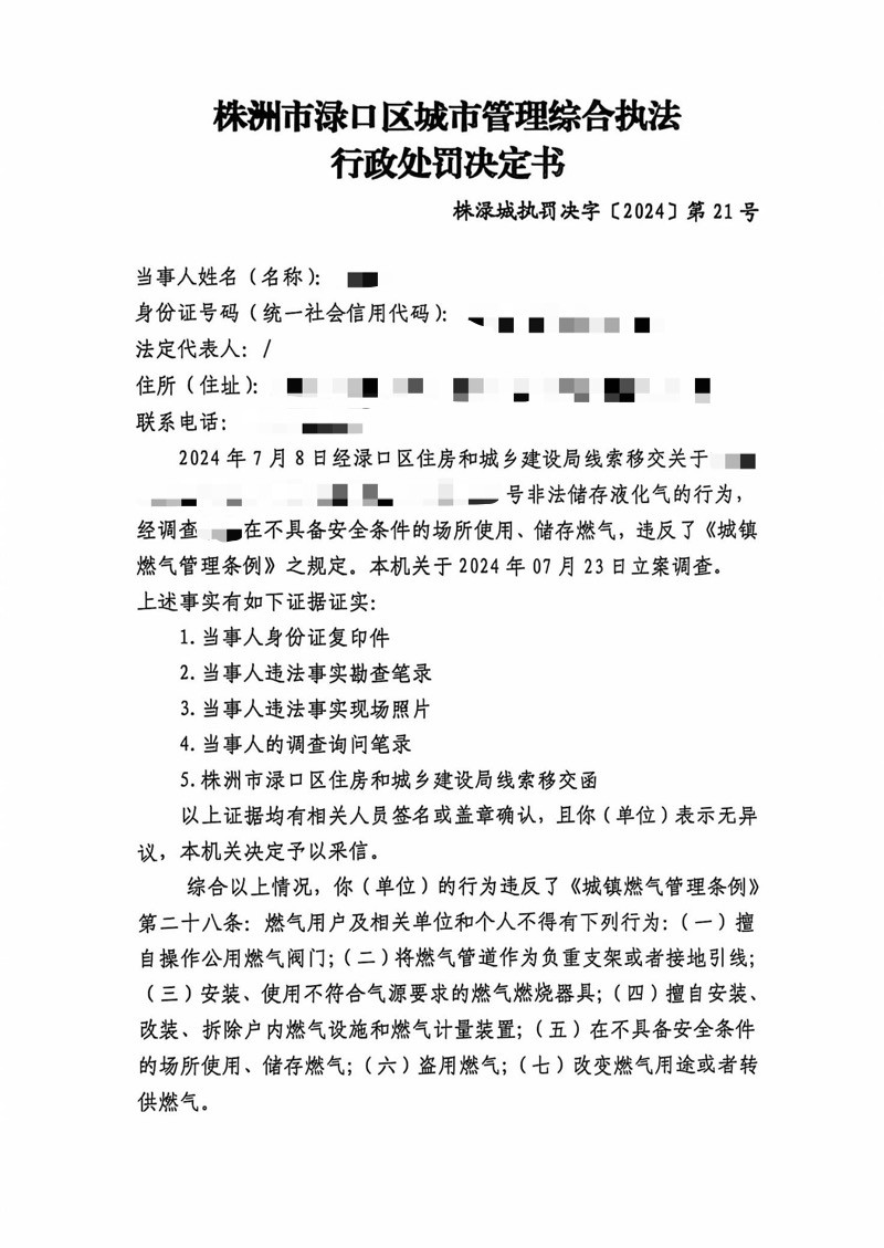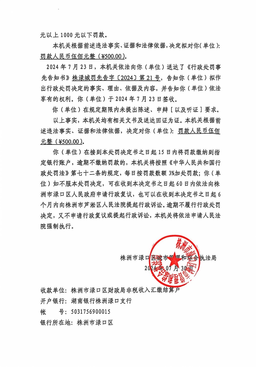 株洲市渌口区城市管理和综合执法局行政处罚决定书 株(渌)城执罚决字〔2024〕第21号