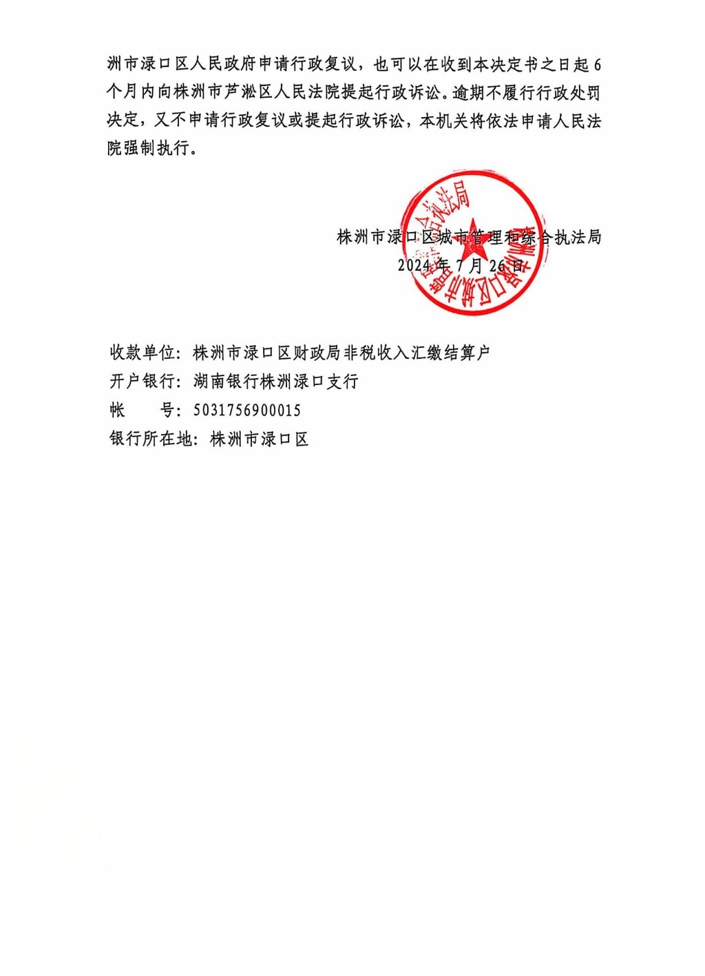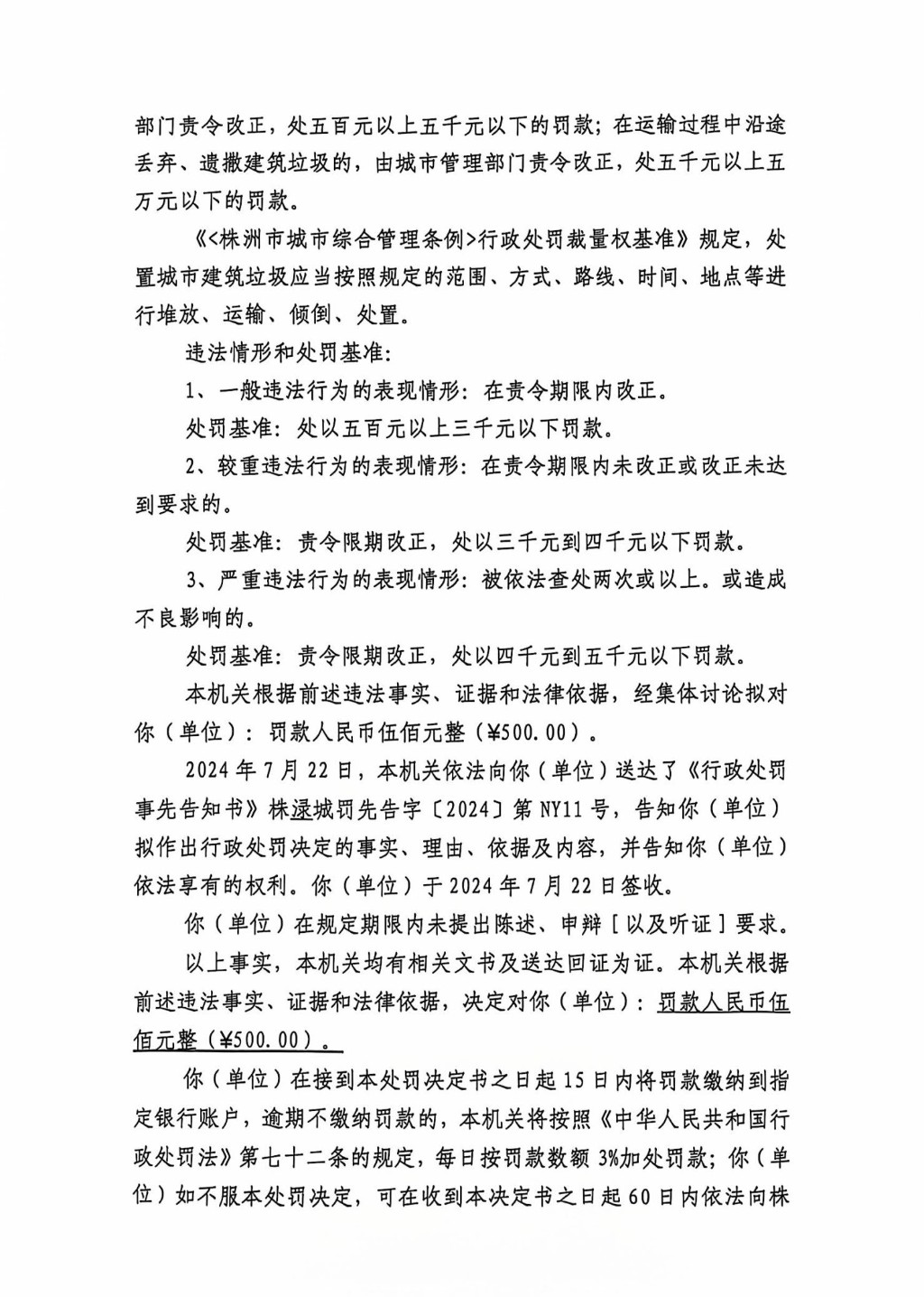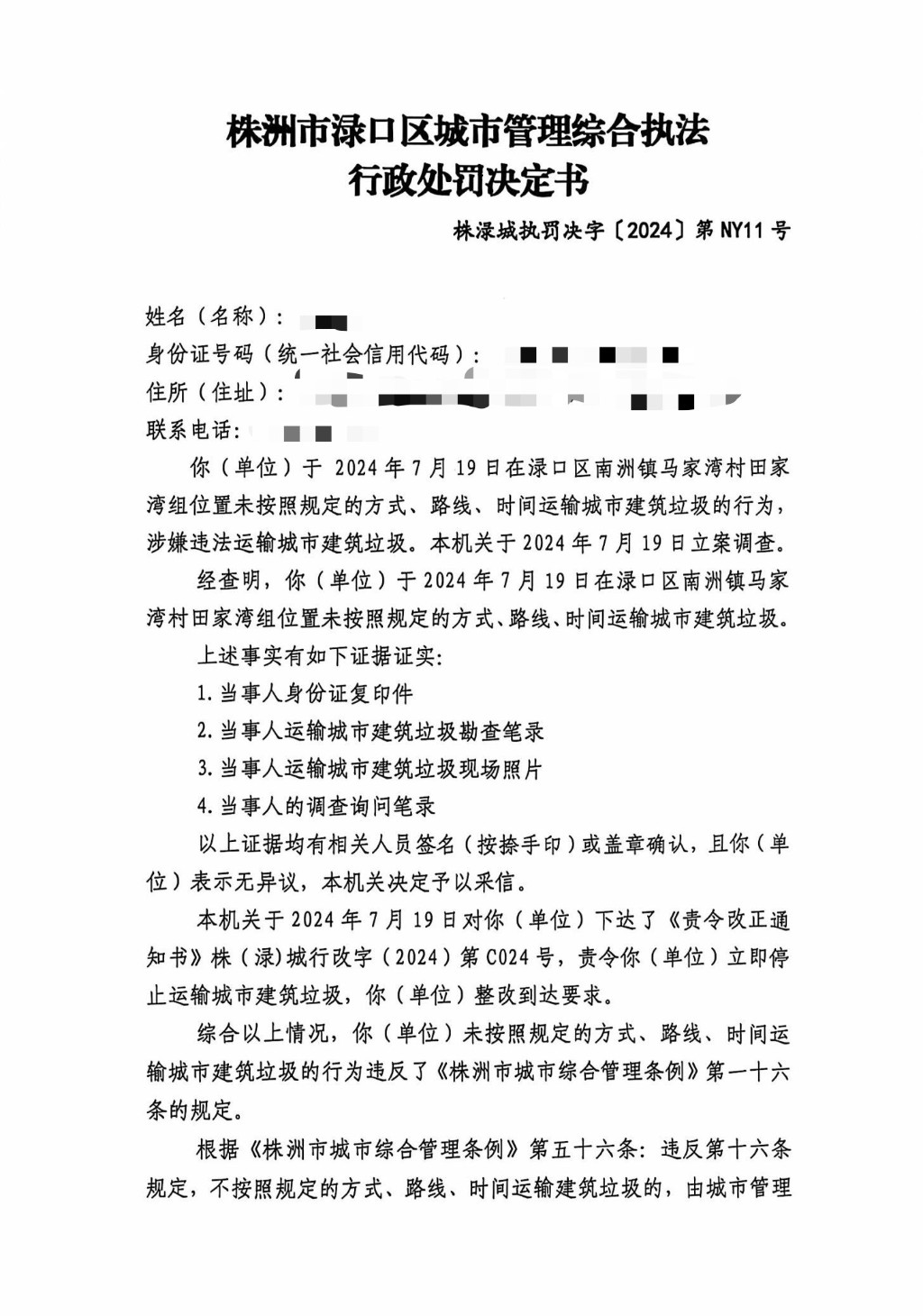 株洲市渌口区城市管理和综合执法局行政处罚决定书 株(渌)城执罚决字〔2024〕第NY11号