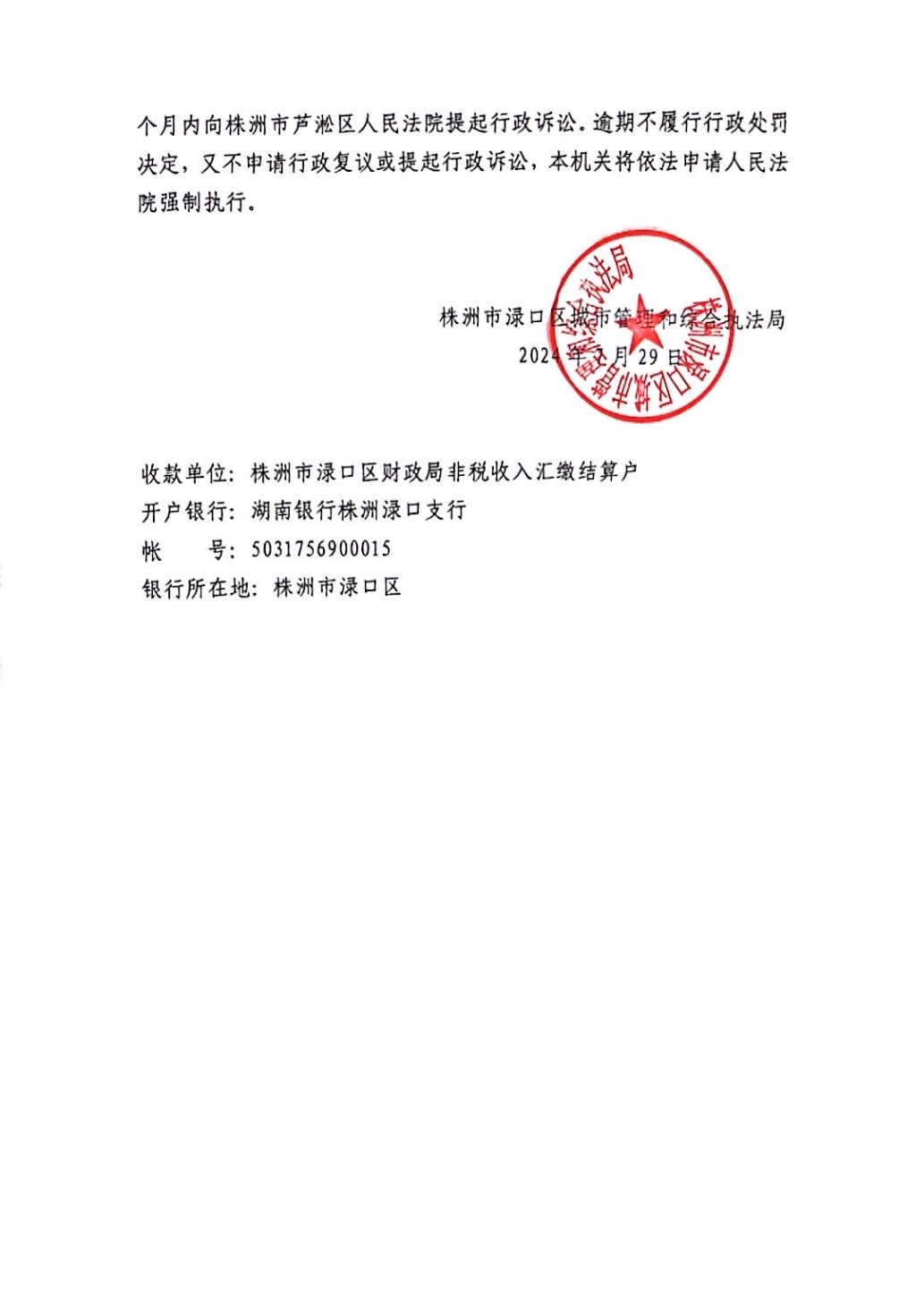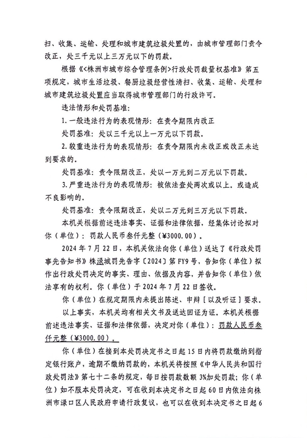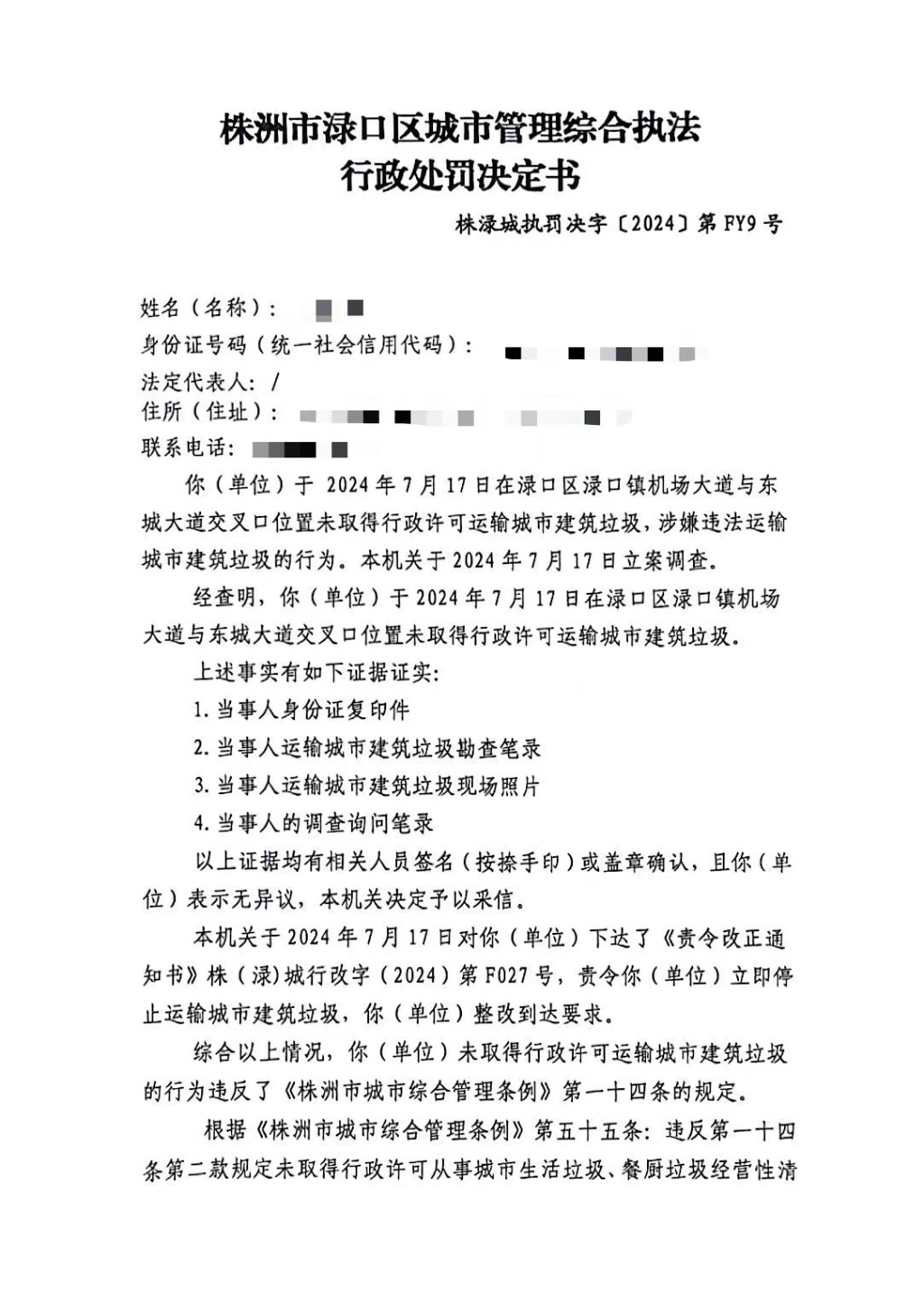 株洲市渌口区城市管理和综合执法局行政处罚决定书 株(渌)城执罚决字〔2024〕第FY9号