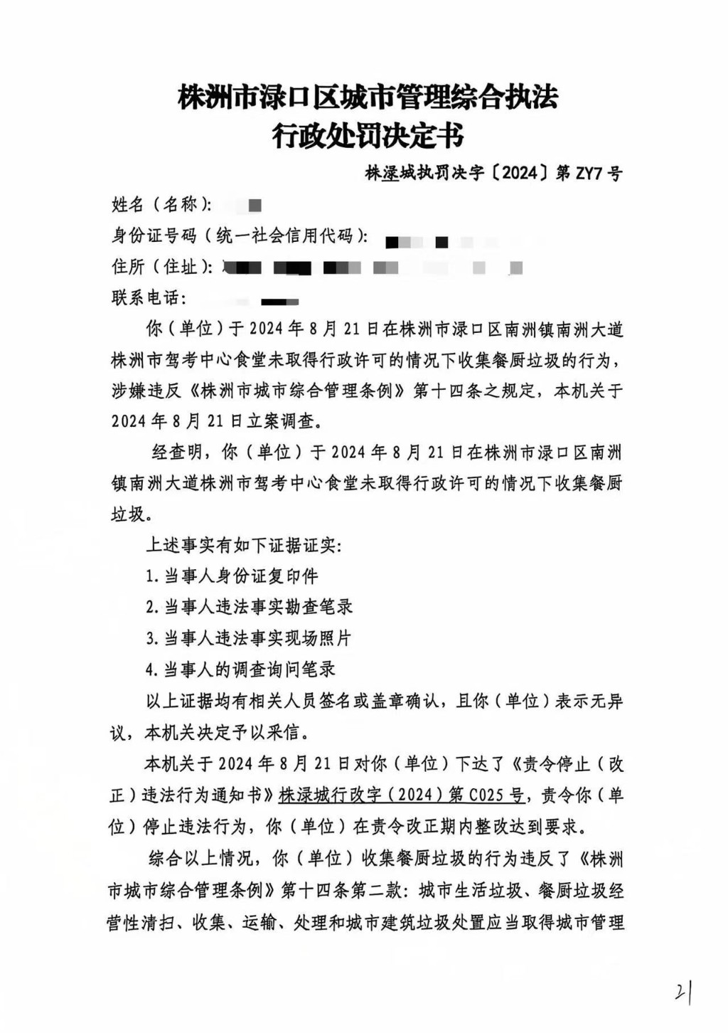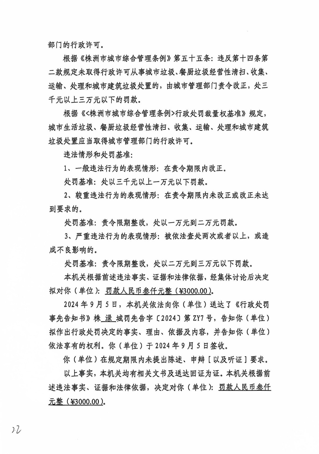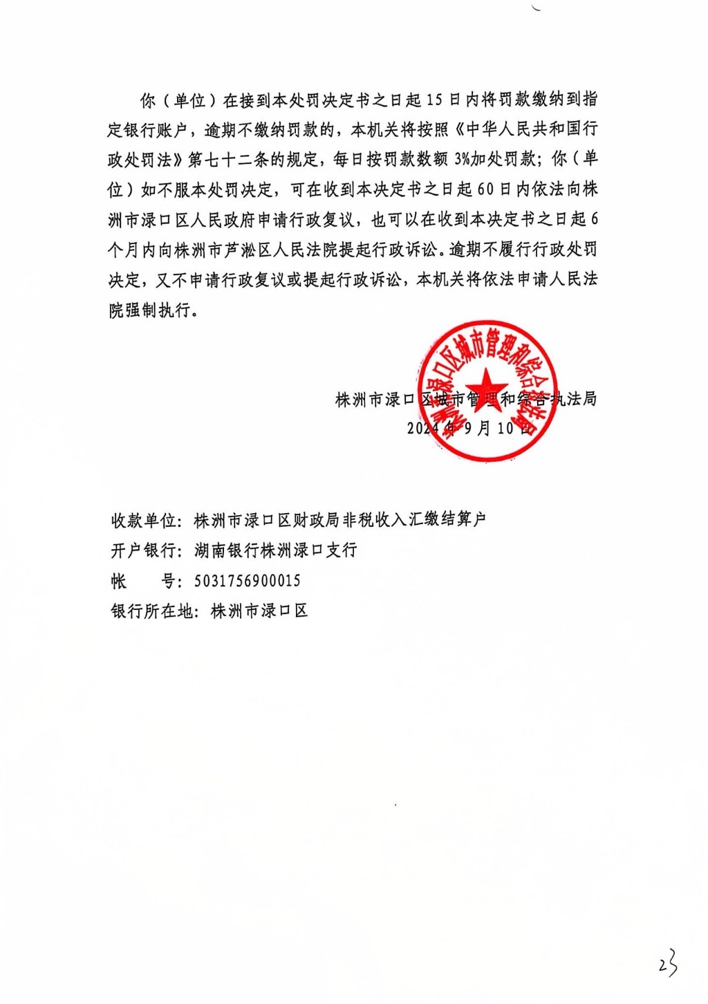 株洲市渌口区城市管理和综合执法局行政处罚决定书 株(渌)城执罚决字〔2024〕第ZY7号