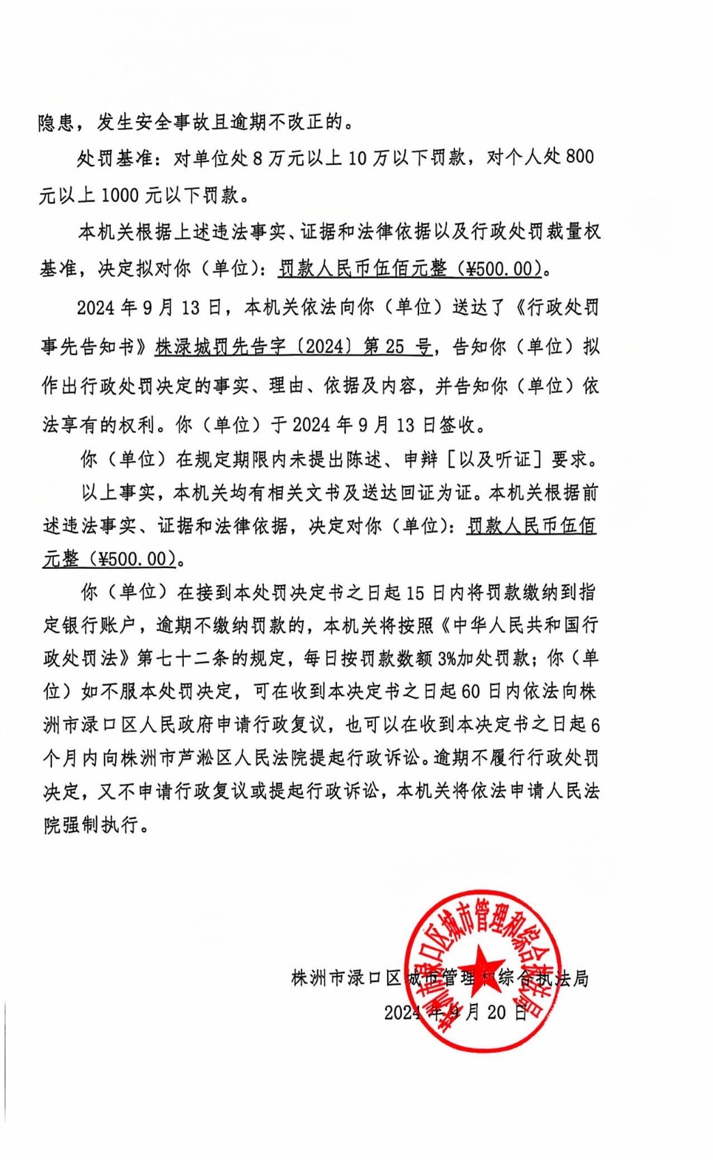 株洲市渌口区城市管理和综合执法局行政处罚决定书 株(渌)城执罚决字〔2024〕第25号