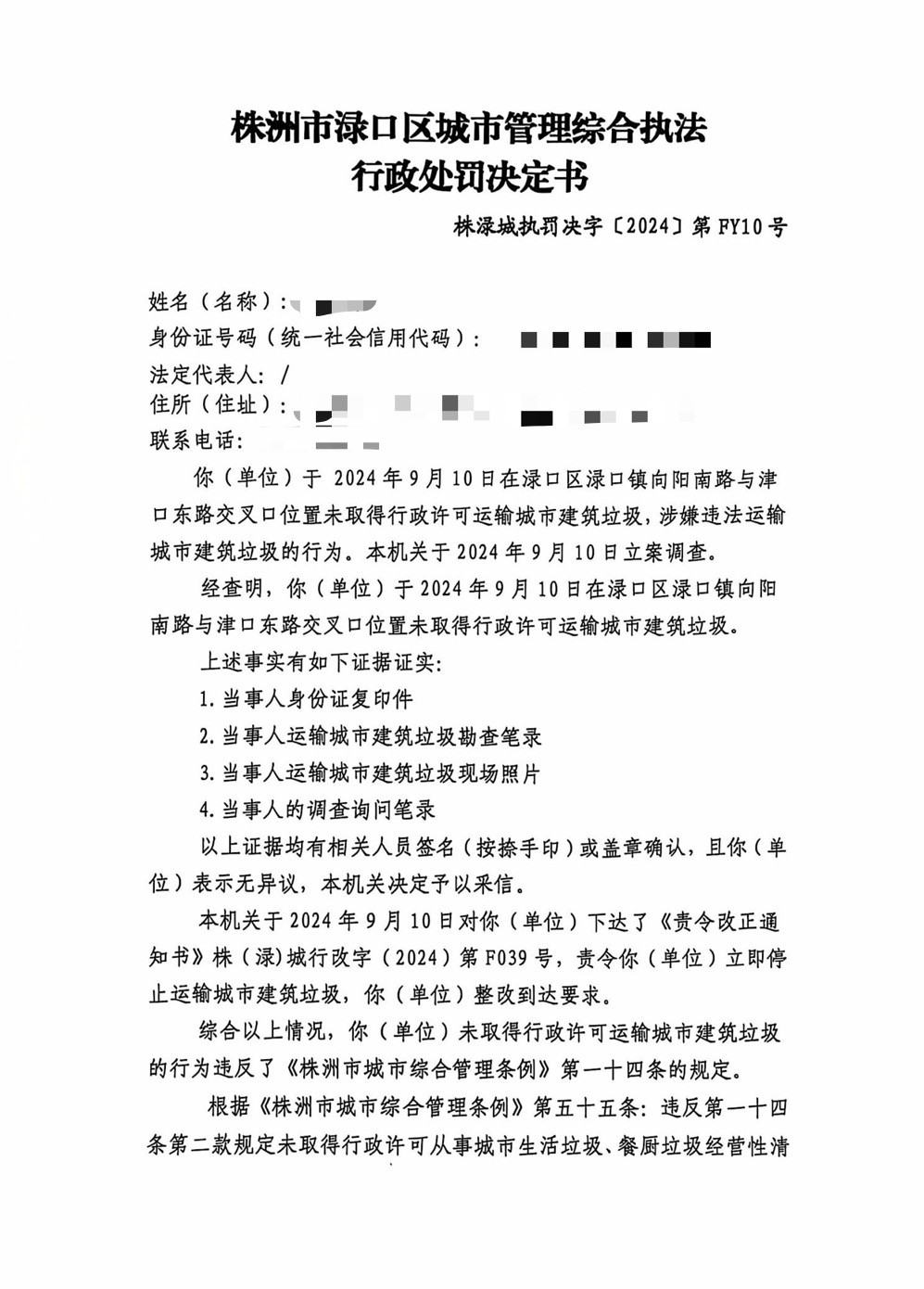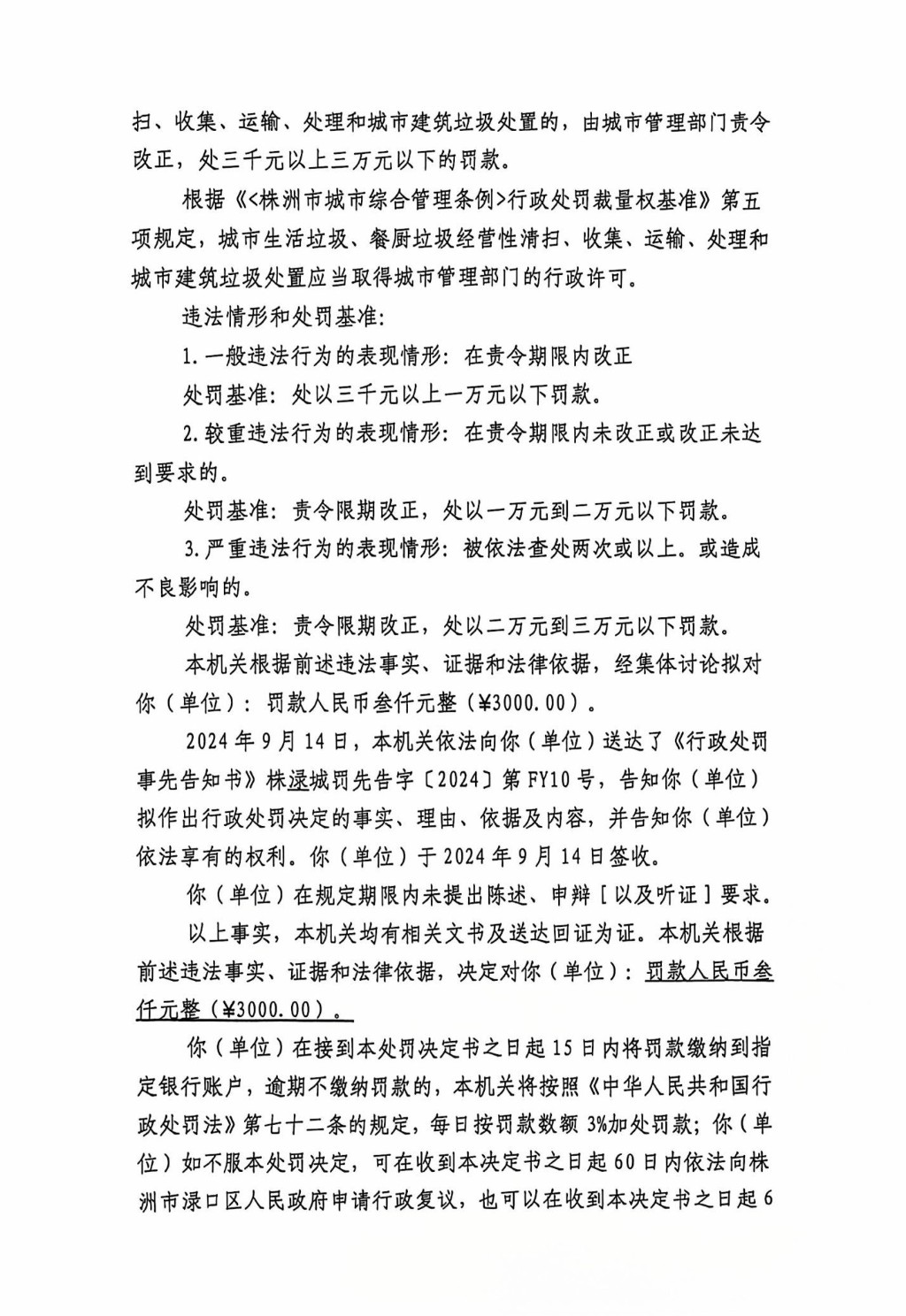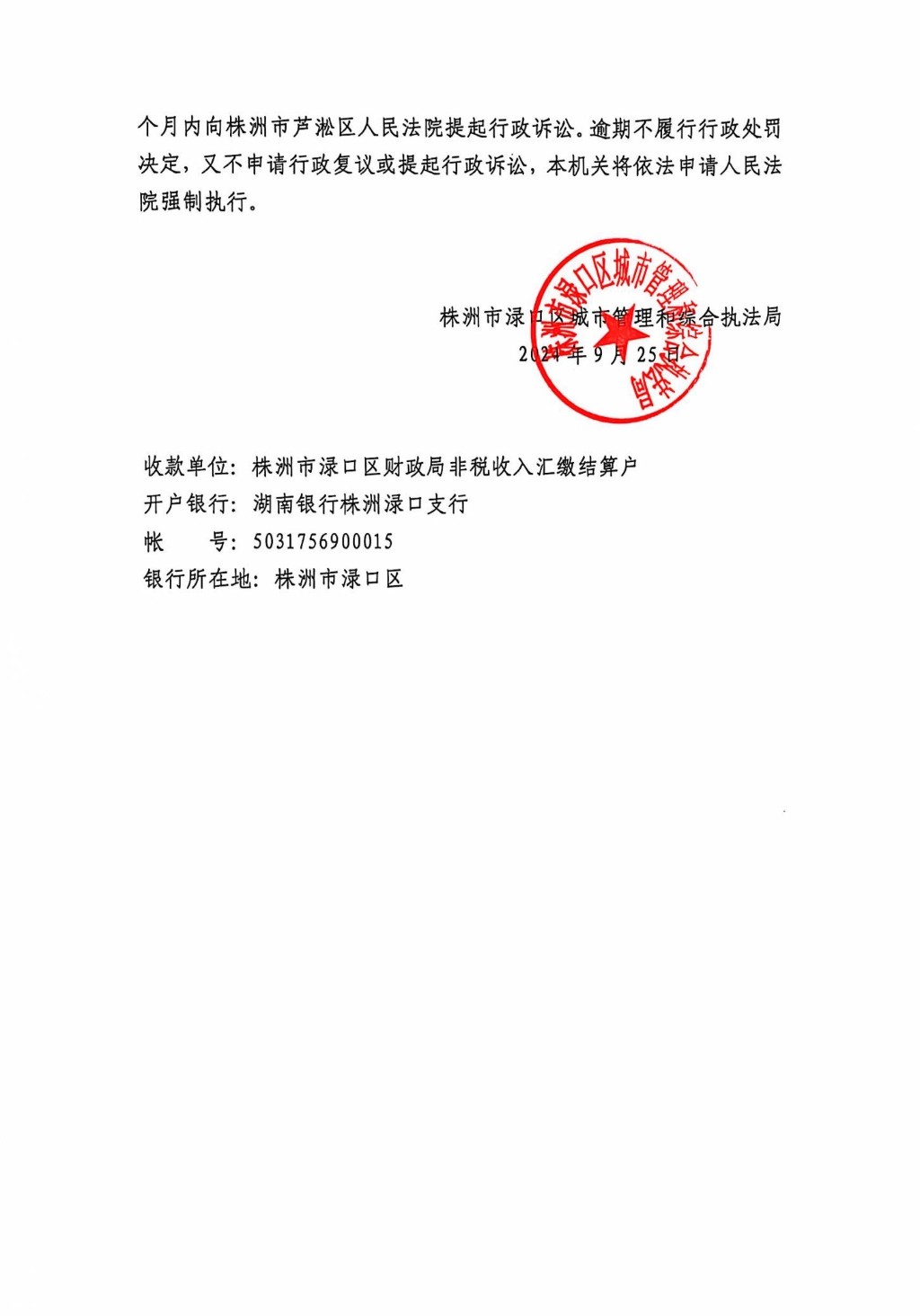 株洲市渌口区城市管理和综合执法局行政处罚决定书 株(渌)城执罚决字〔2024〕第FY10号