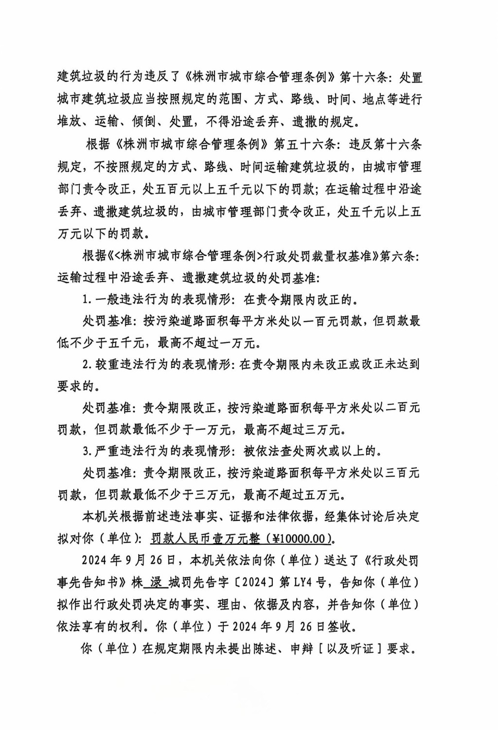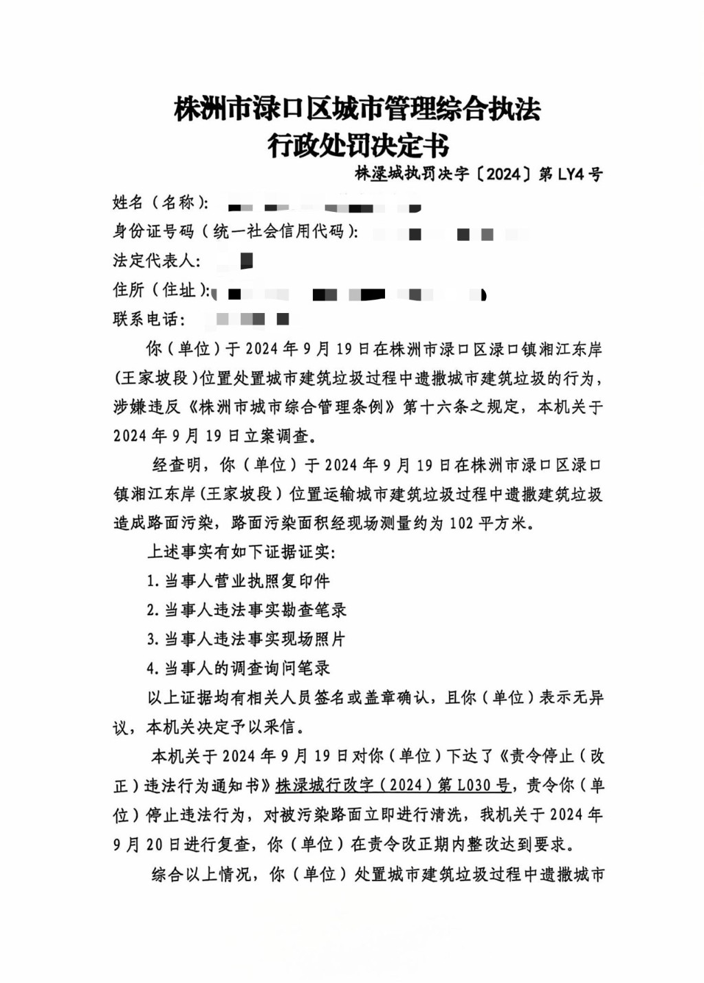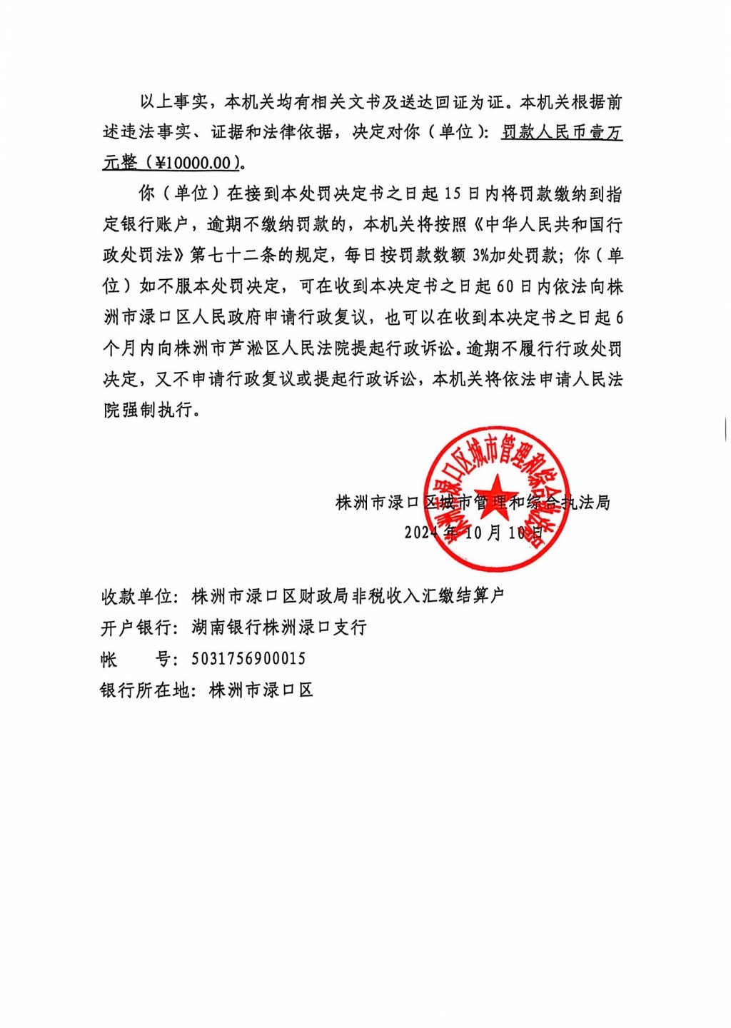 株洲市渌口区城市管理和综合执法局行政处罚决定书 株(渌)城执罚决字〔2024〕第LY4号