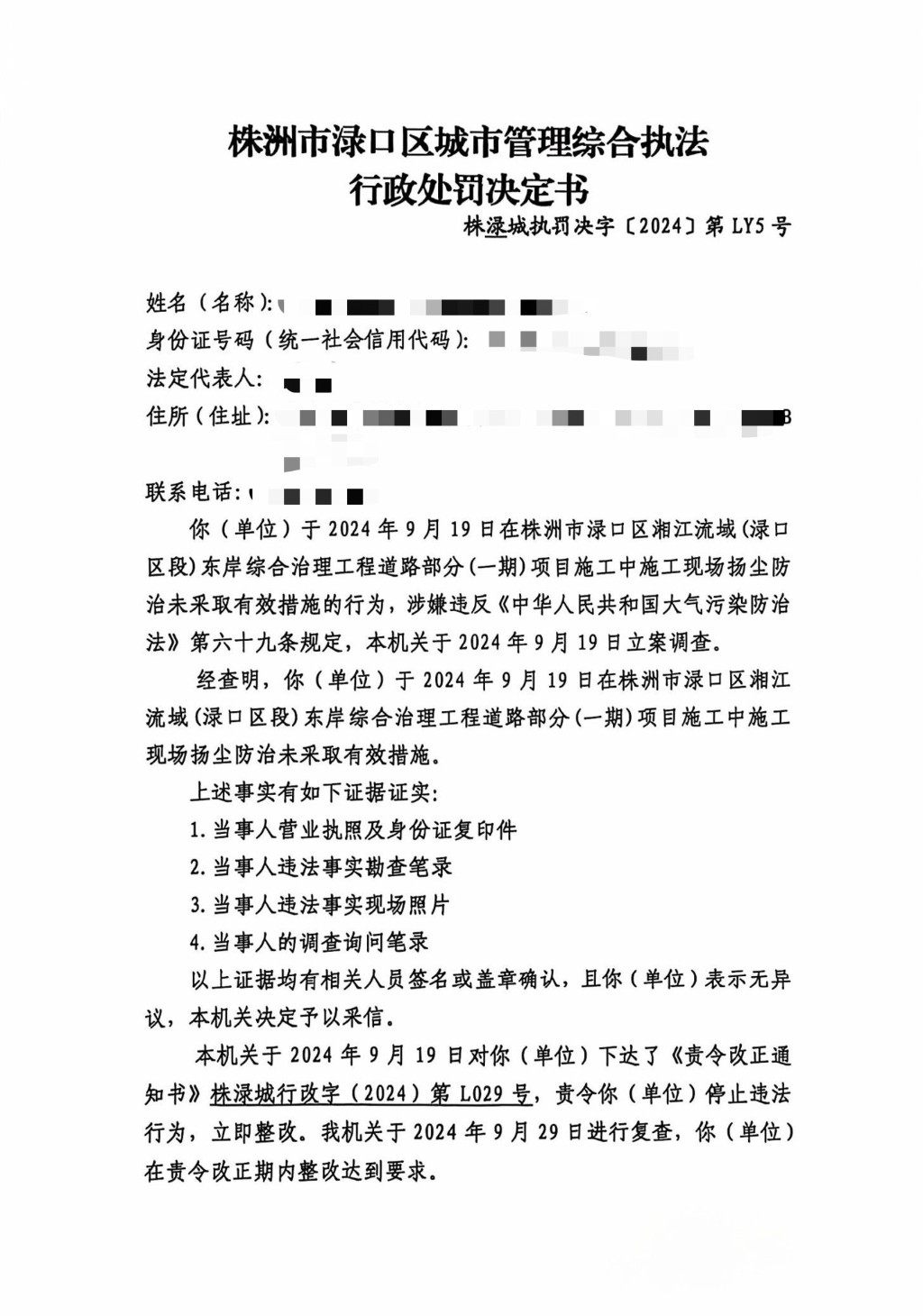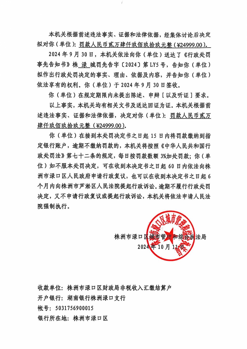 株洲市渌口区城市管理和综合执法局行政处罚决定书 株(渌)城执罚决字〔2024〕第LY5号