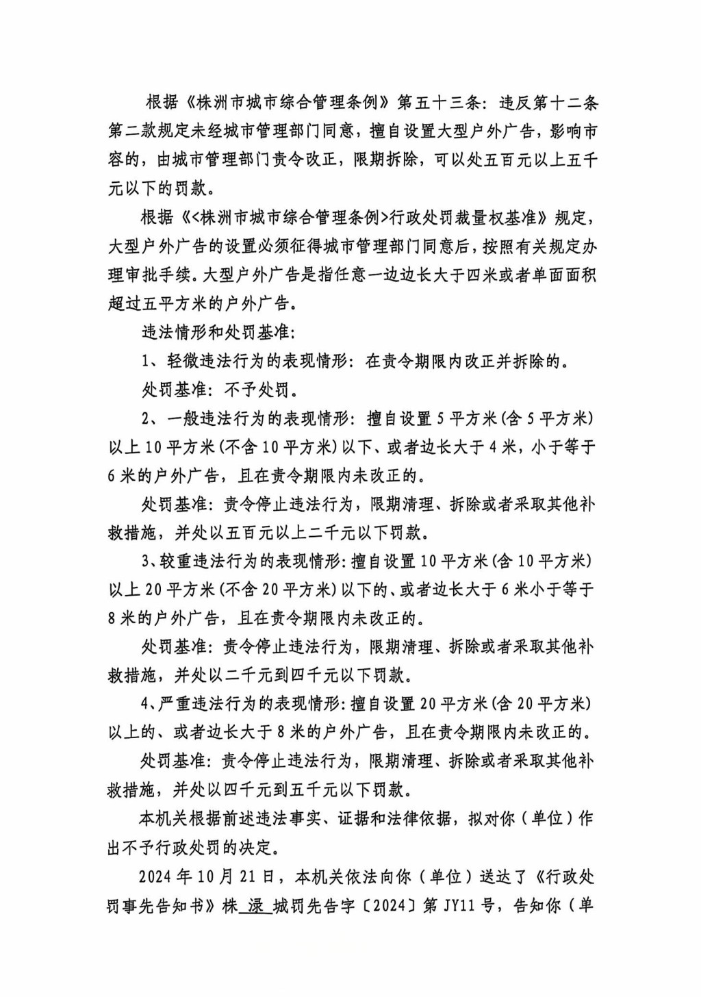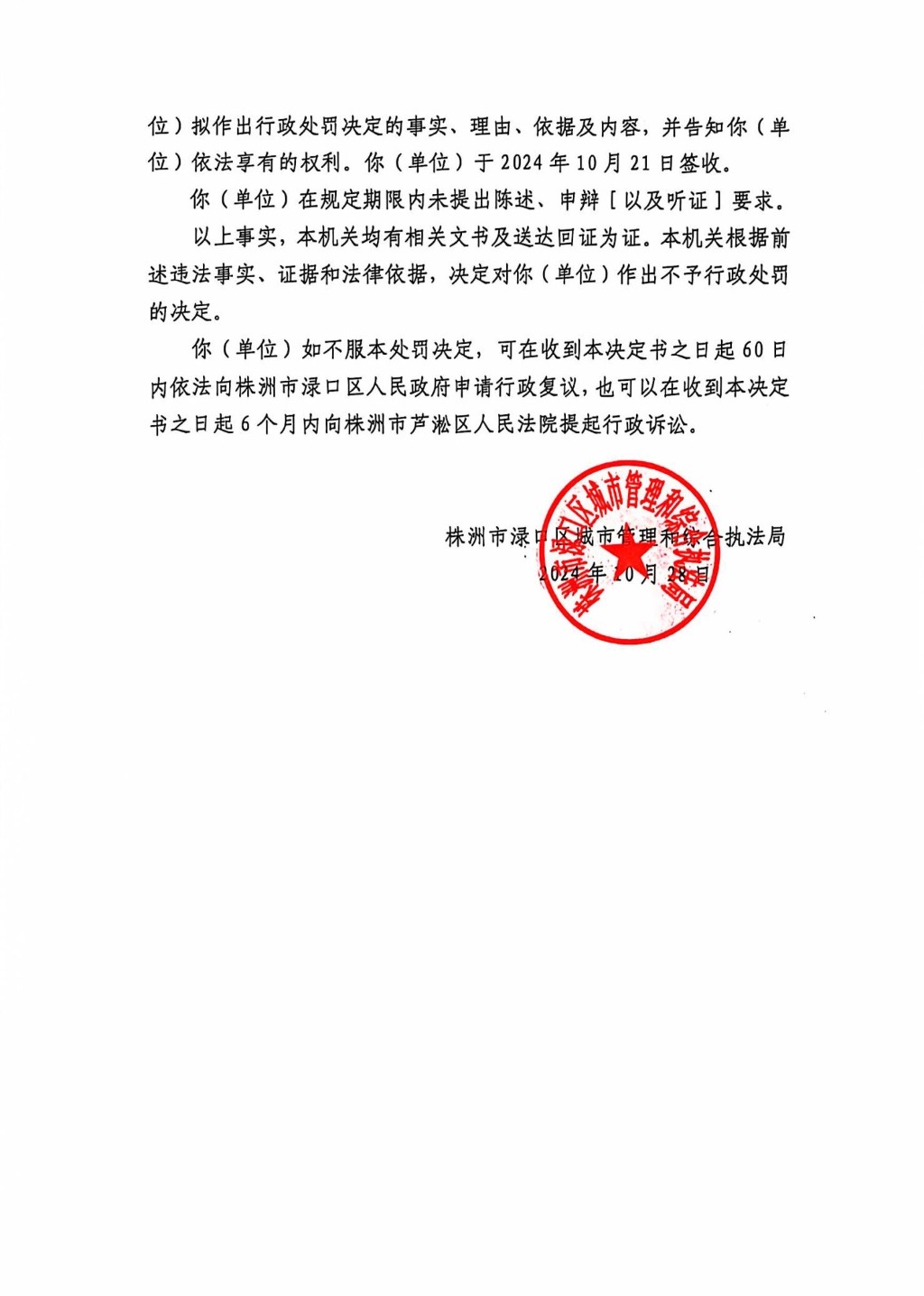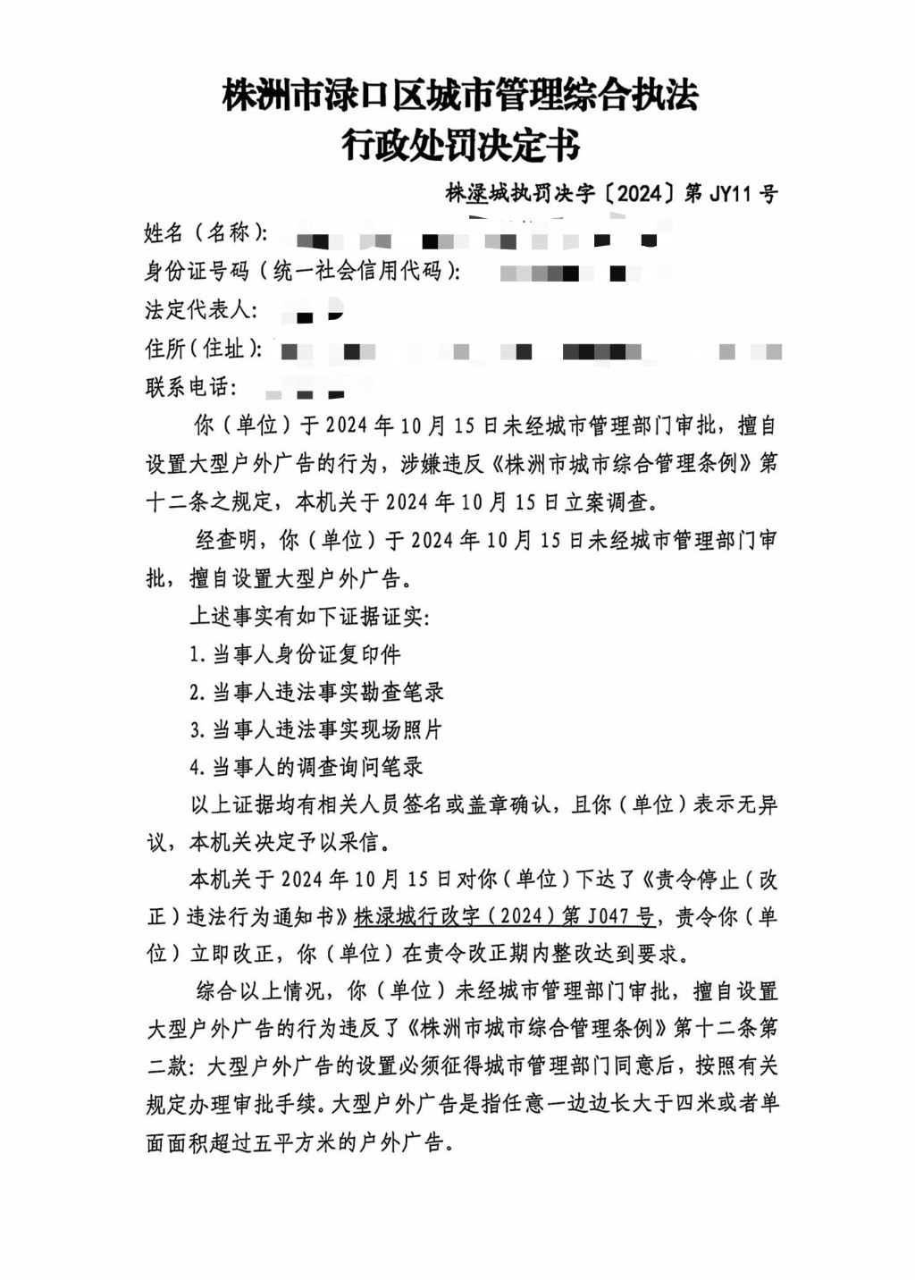 株洲市渌口区城市管理和综合执法局行政处罚决定书 株(渌)城执罚决字〔2024〕第JY11号