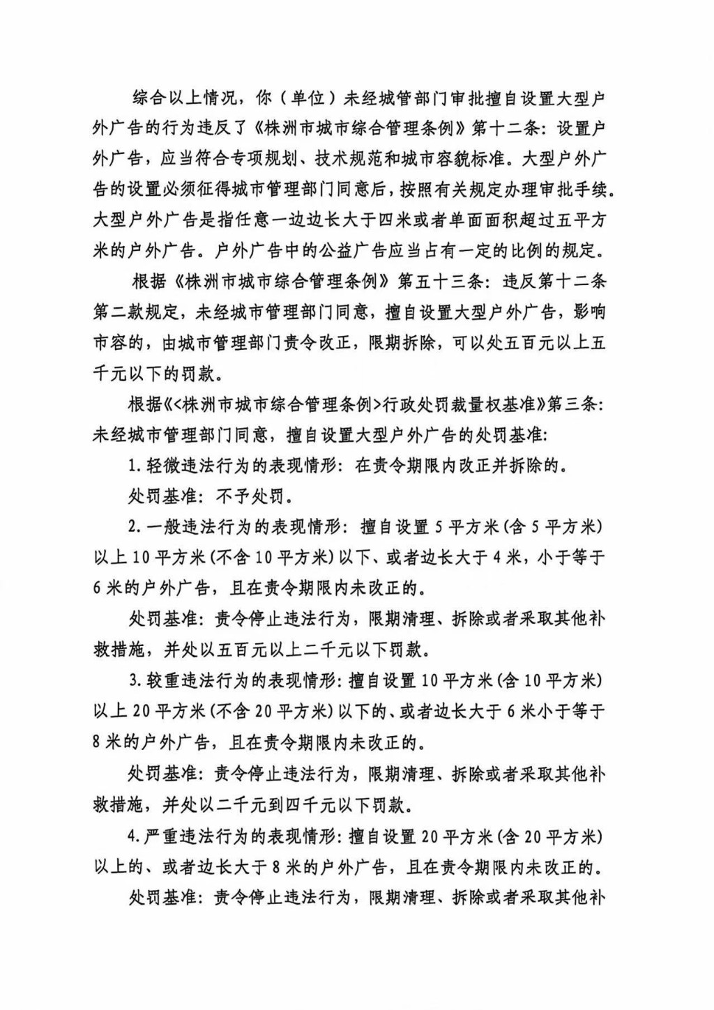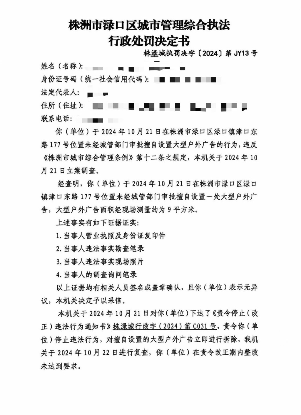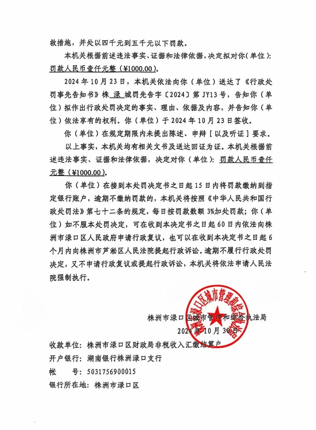 株洲市渌口区城市管理和综合执法局行政处罚决定书 株(渌)城执罚决字〔2024〕第JY13号