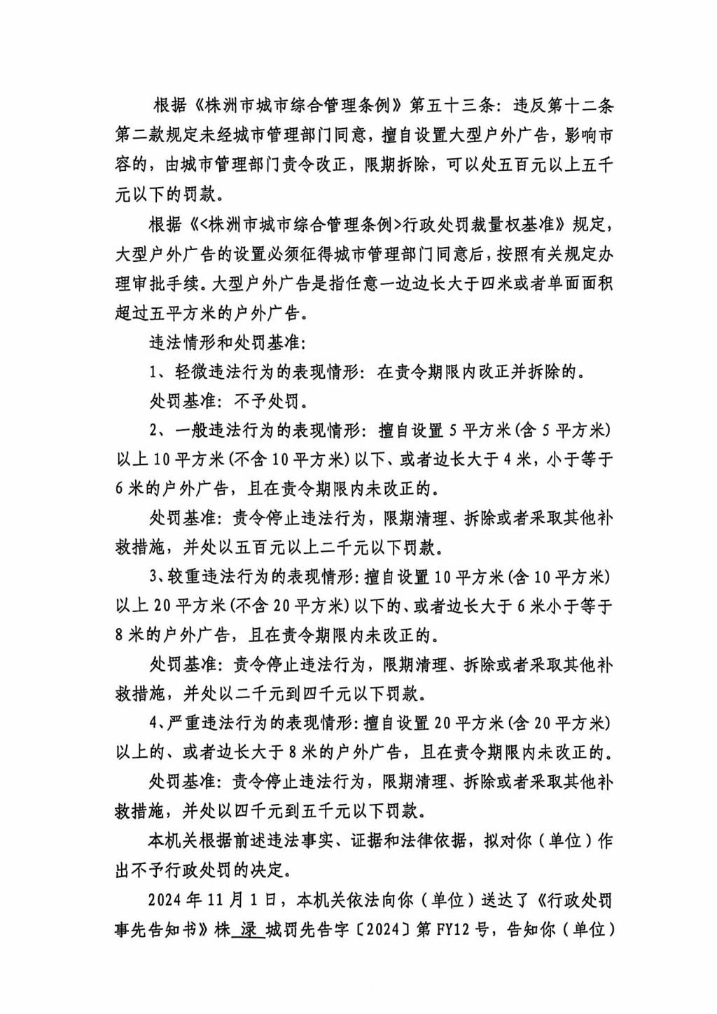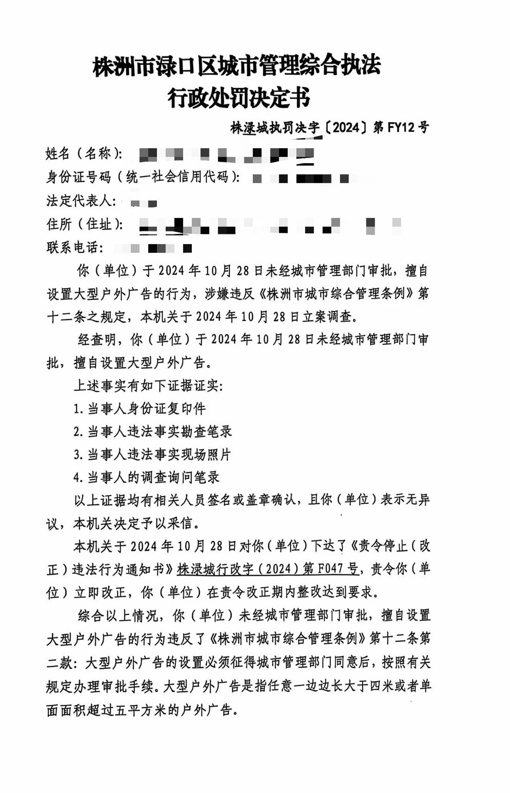 株洲市渌口区城市管理和综合执法局行政处罚决定书 株(渌)城执罚决字〔2024〕第FY12号