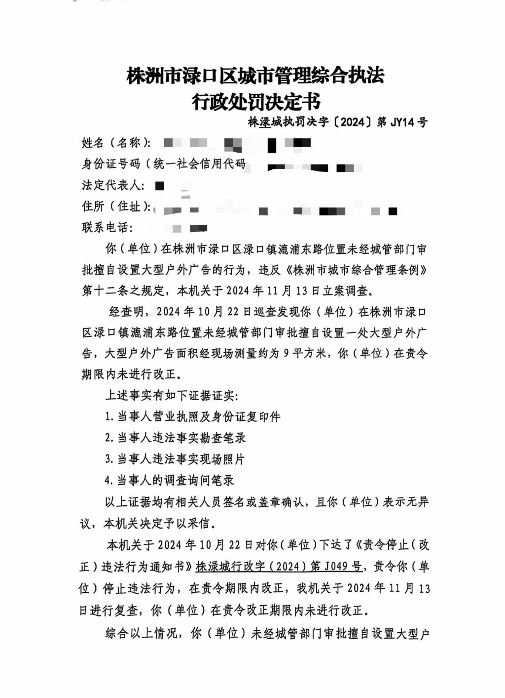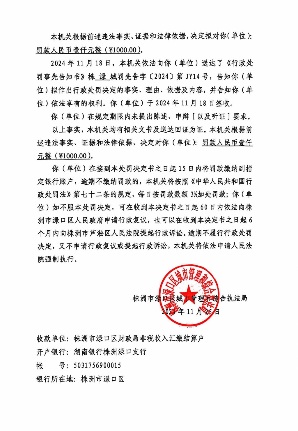 株洲市渌口区城市管理和综合执法局行政处罚决定书 株(渌)城执罚决字〔2024〕第JY14号