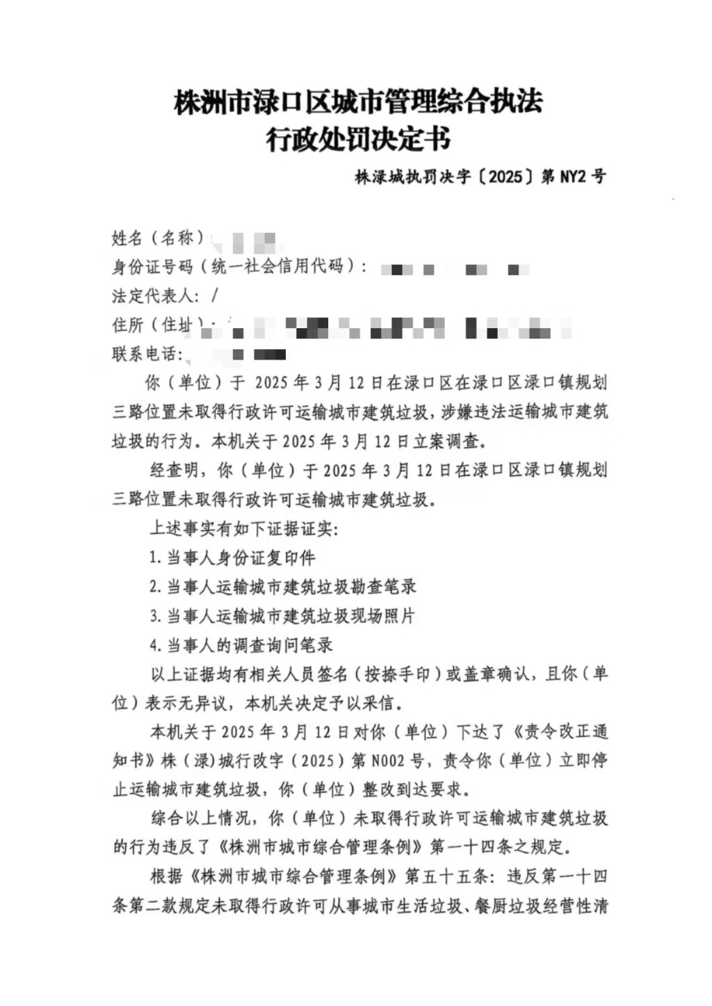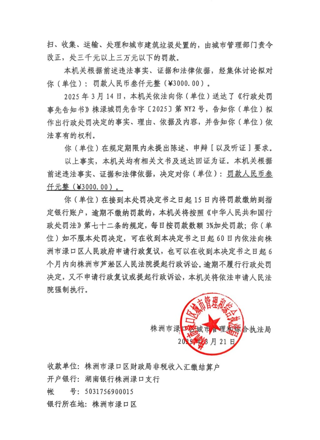 株洲市渌口区城市管理和综合执法局行政处罚决定书 株(渌)城执罚决字〔2025〕第NY2号