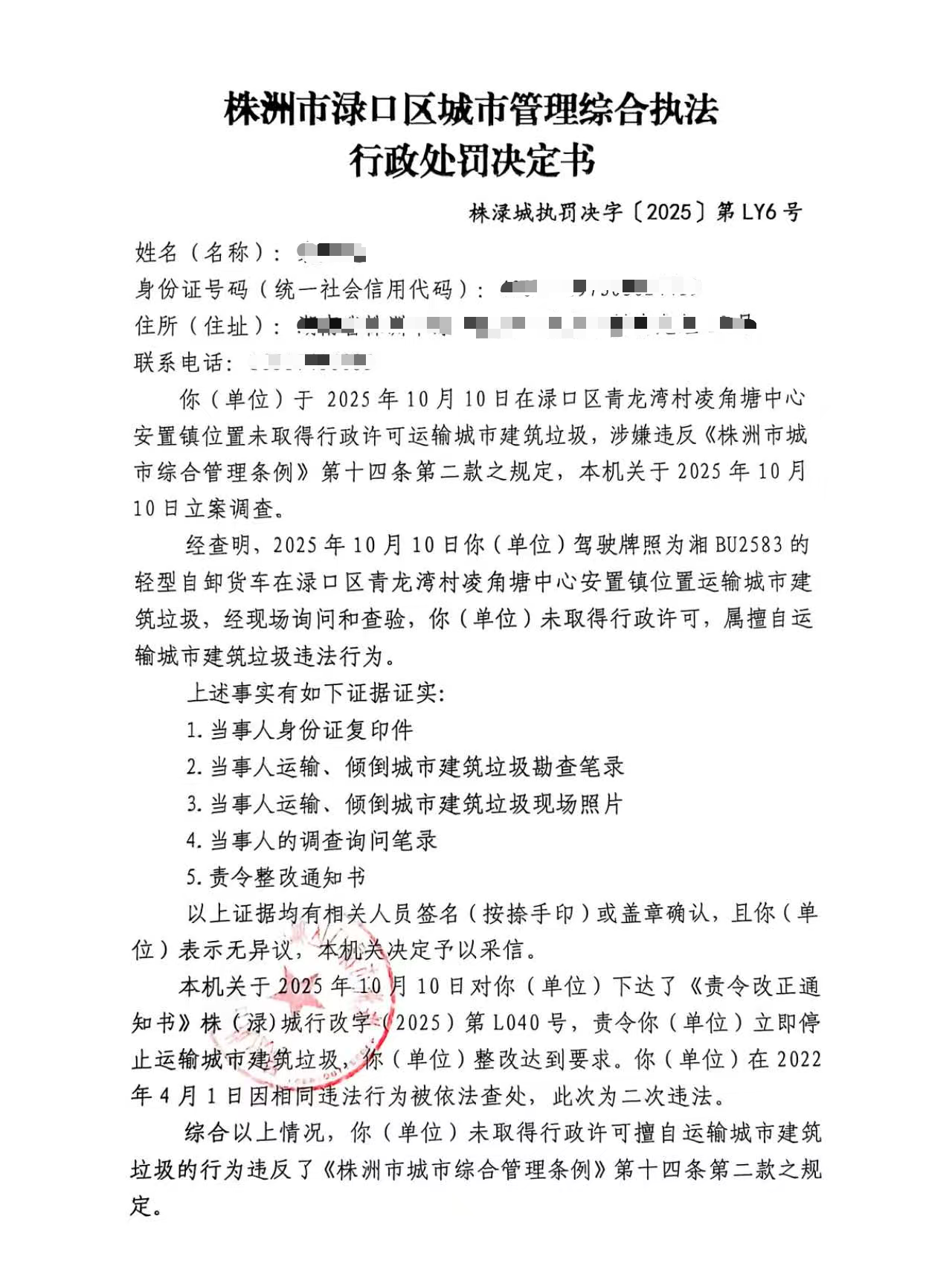 株洲市渌口区城市管理和综合执法局行政处罚决定书 株(渌)城执罚决字〔2025〕第LY6号
