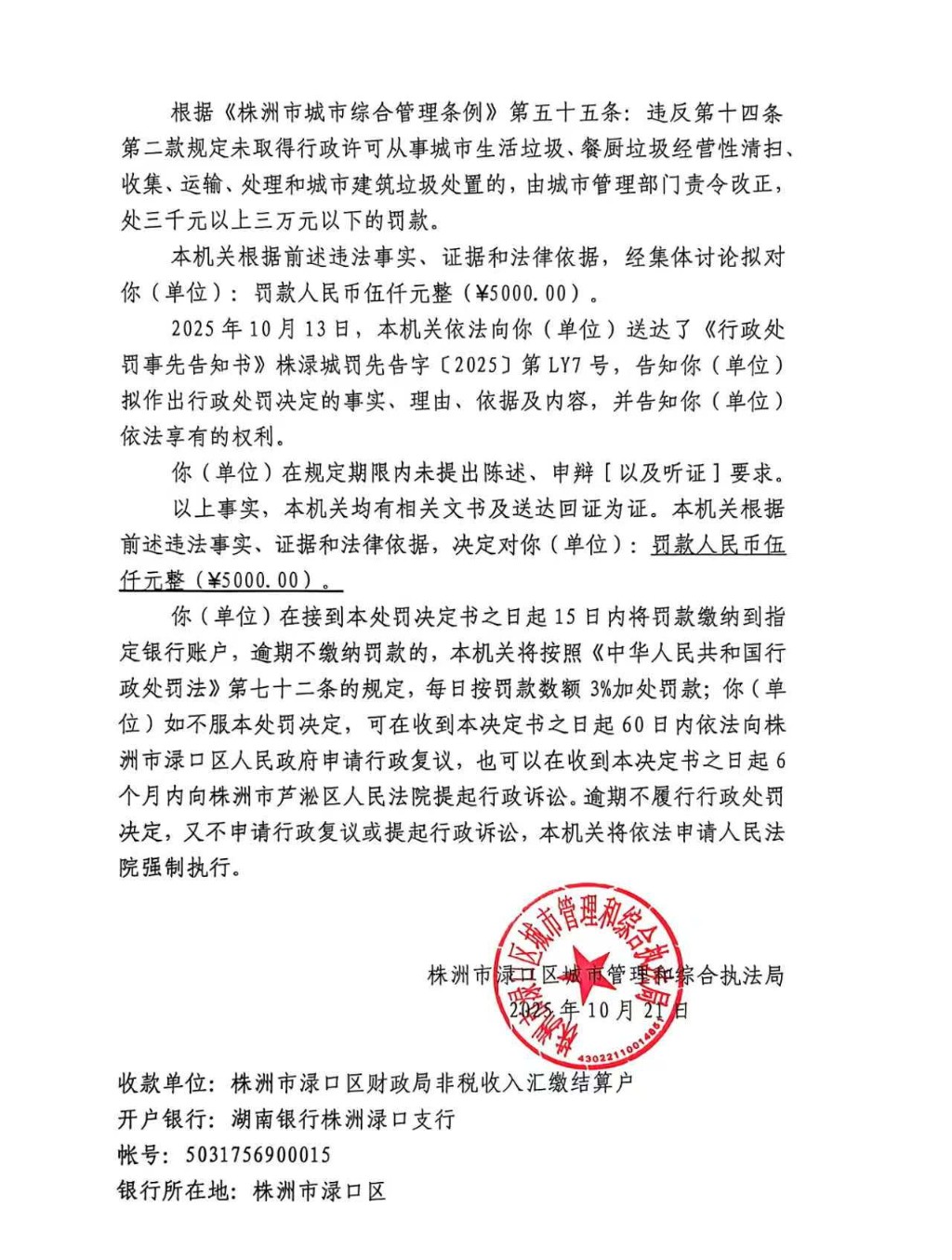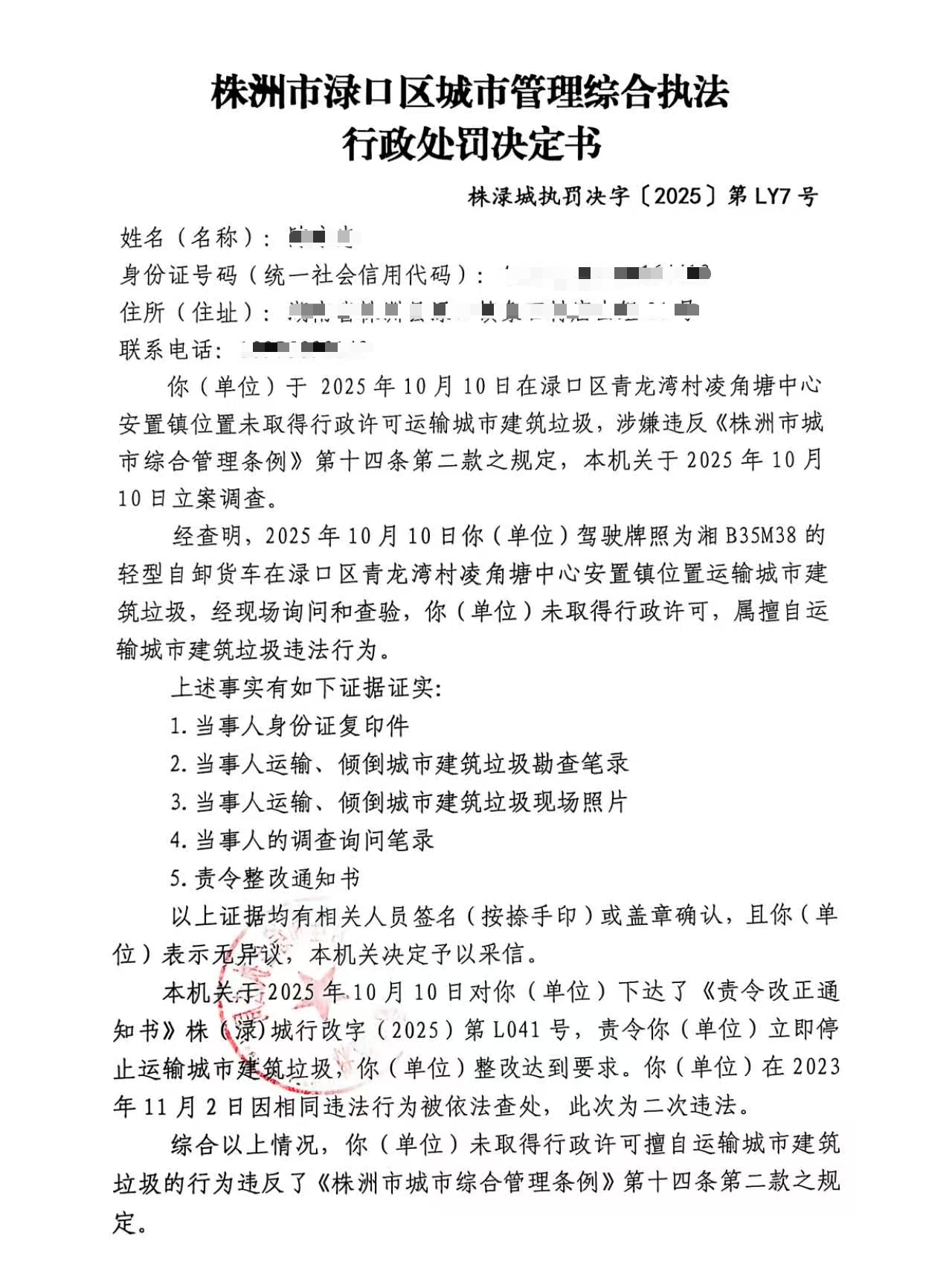 株洲市渌口区城市管理和综合执法局行政处罚决定书 株(渌)城执罚决字〔2025〕第LY7号